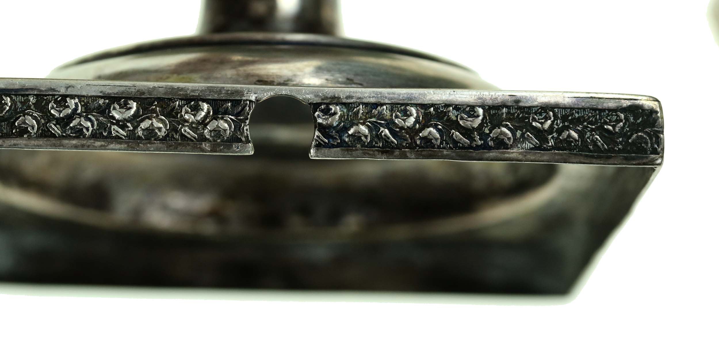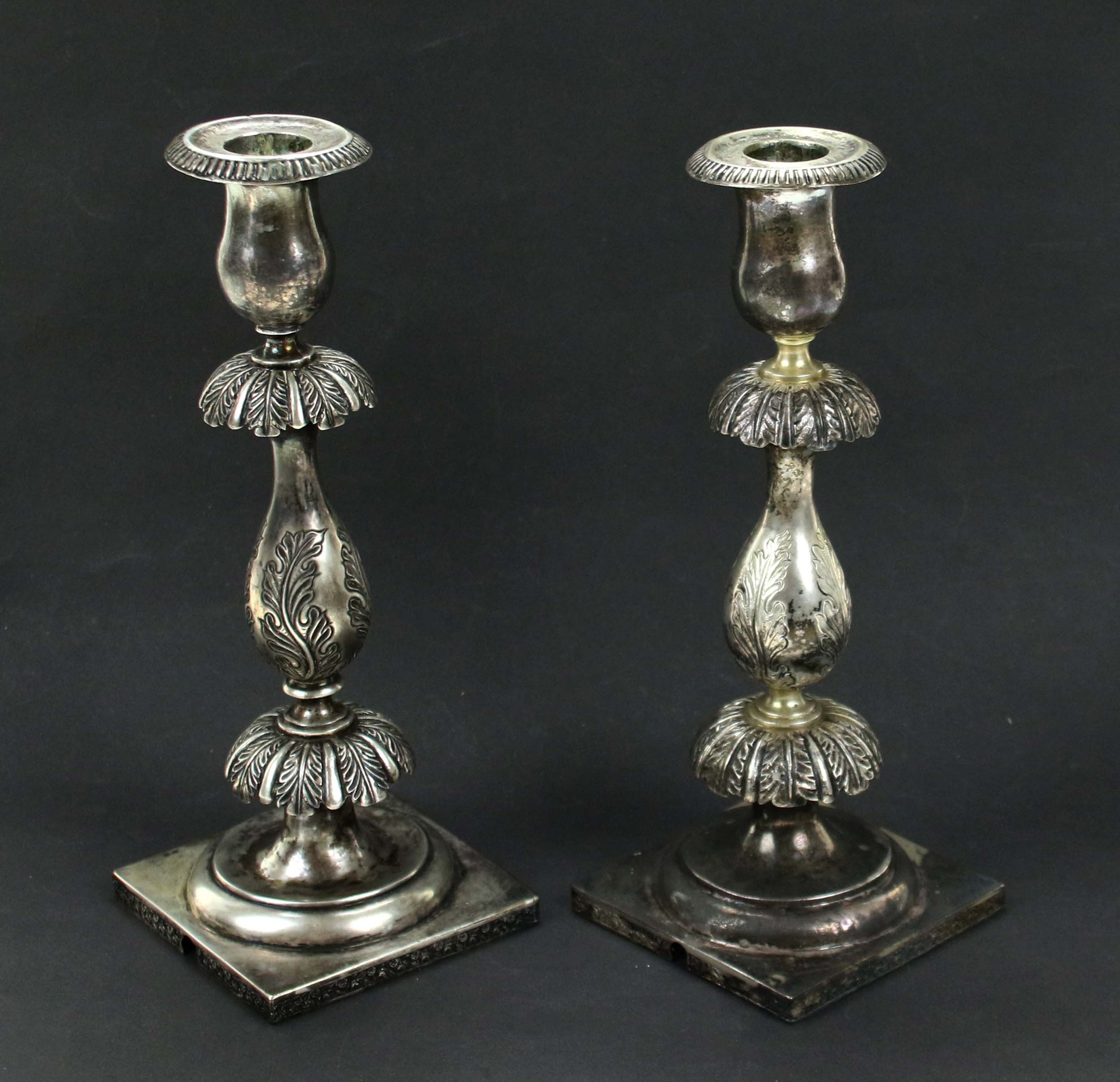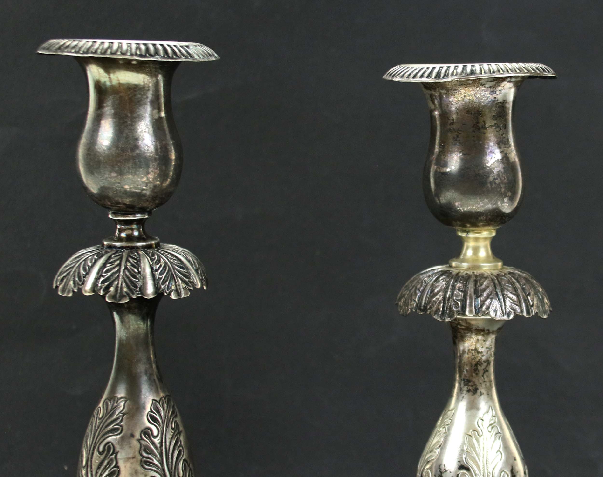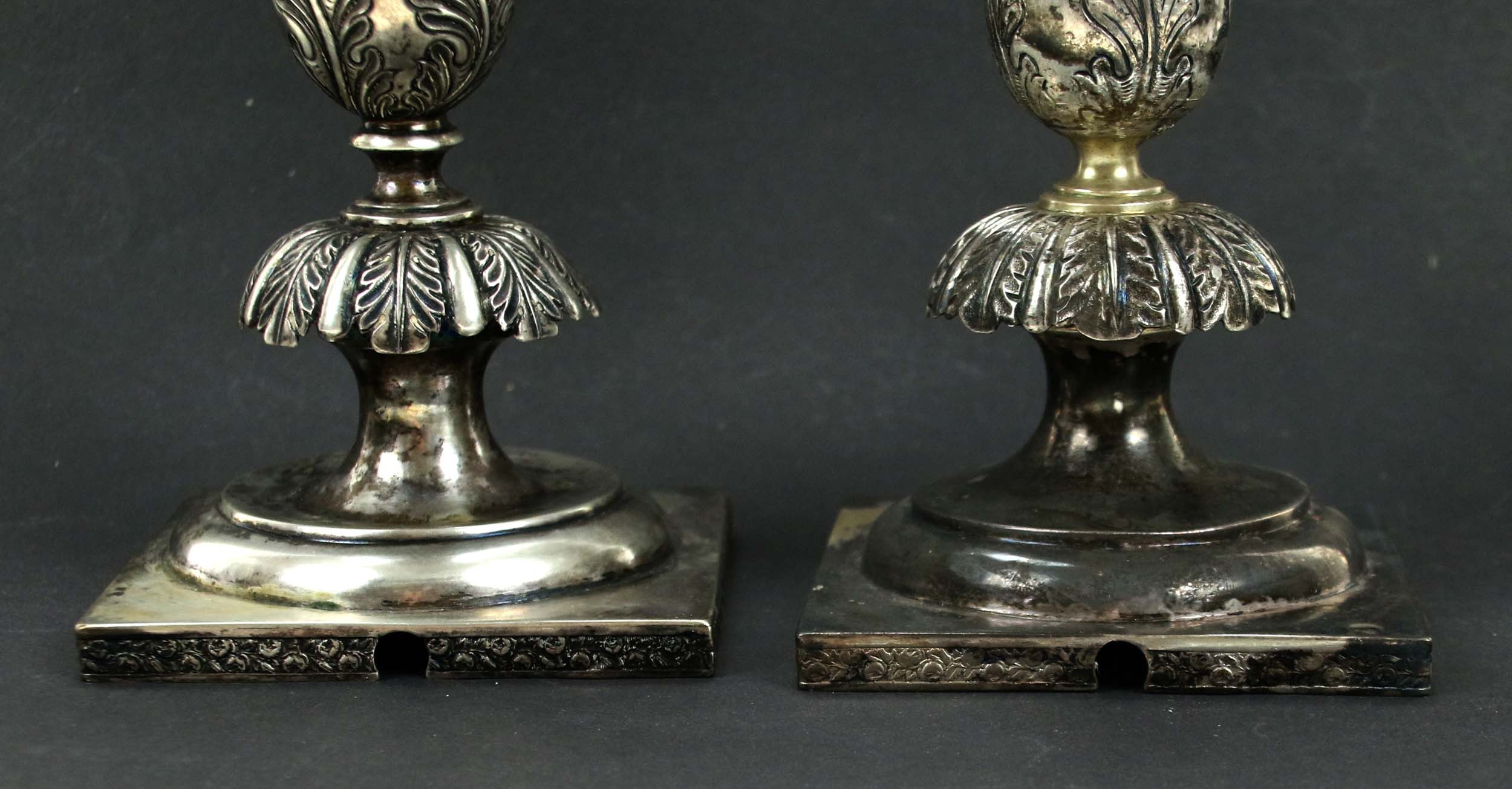 Para świeczników, Nast, Warszawa XIX w. Na spodzie sygnatura złotnika oraz cecha srebra 12. Srebro waga łączna 588 g. Ślad po próbie przeróbki na lampki elektryczne - niewielkie otwory w boku podstawy widoczne na zdjęciach.