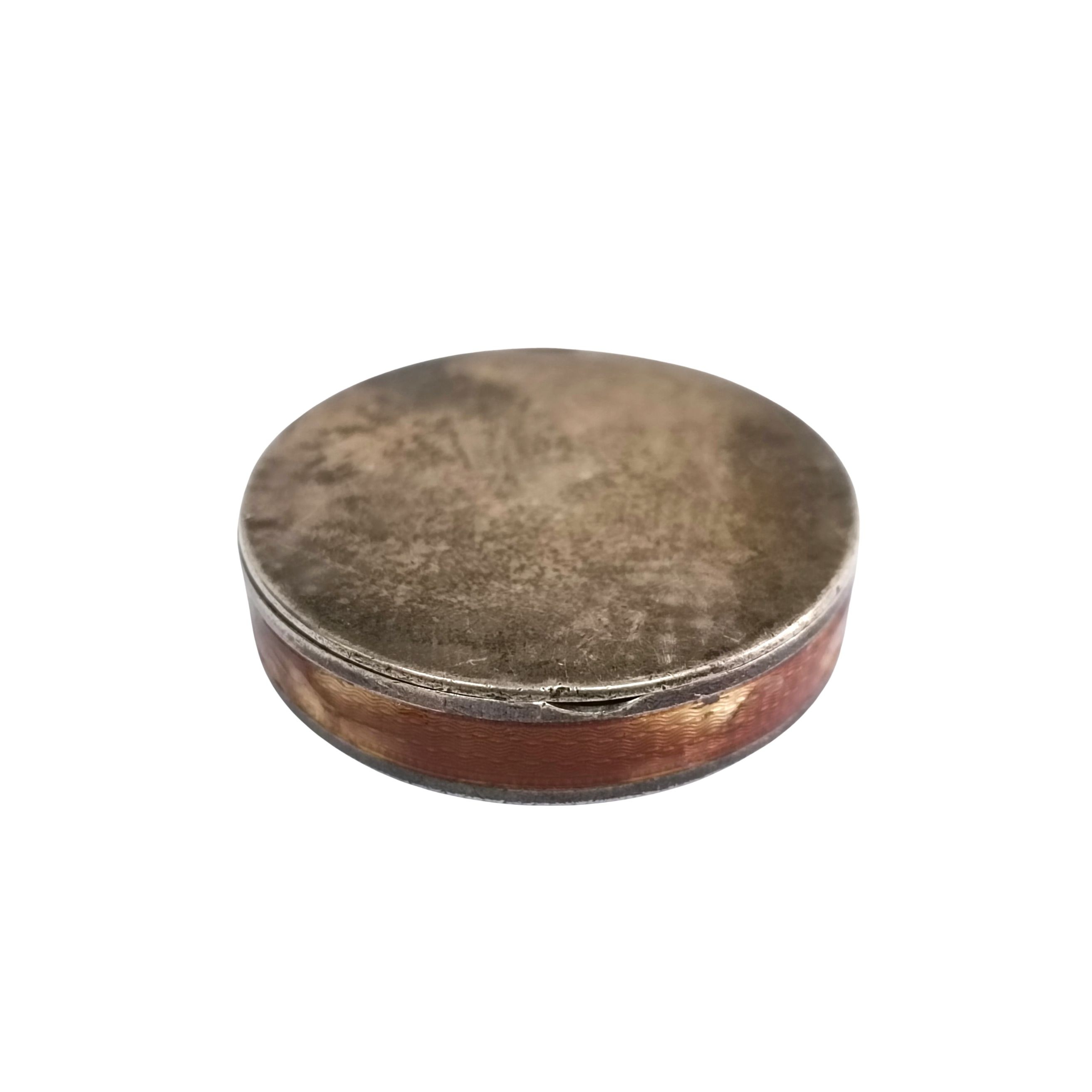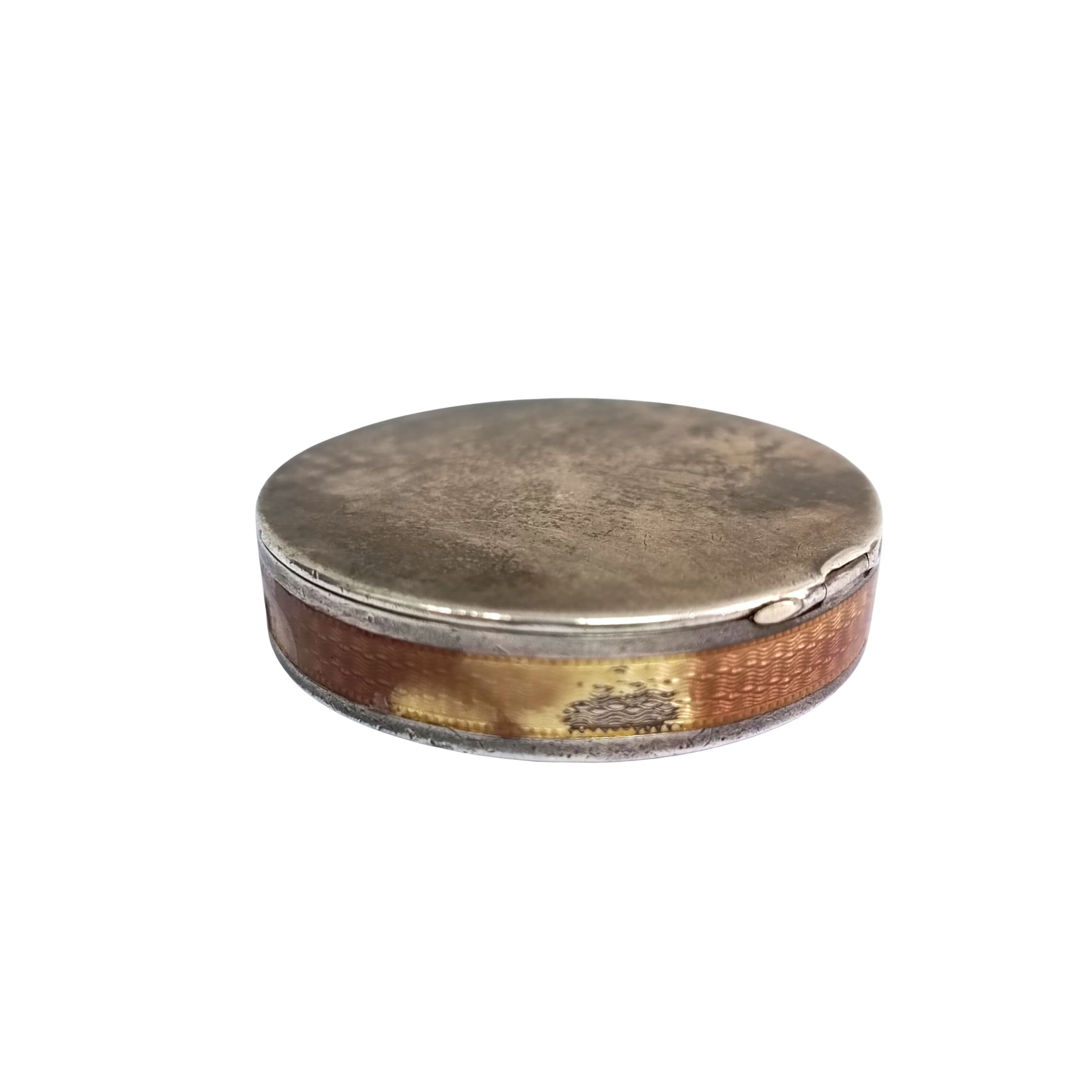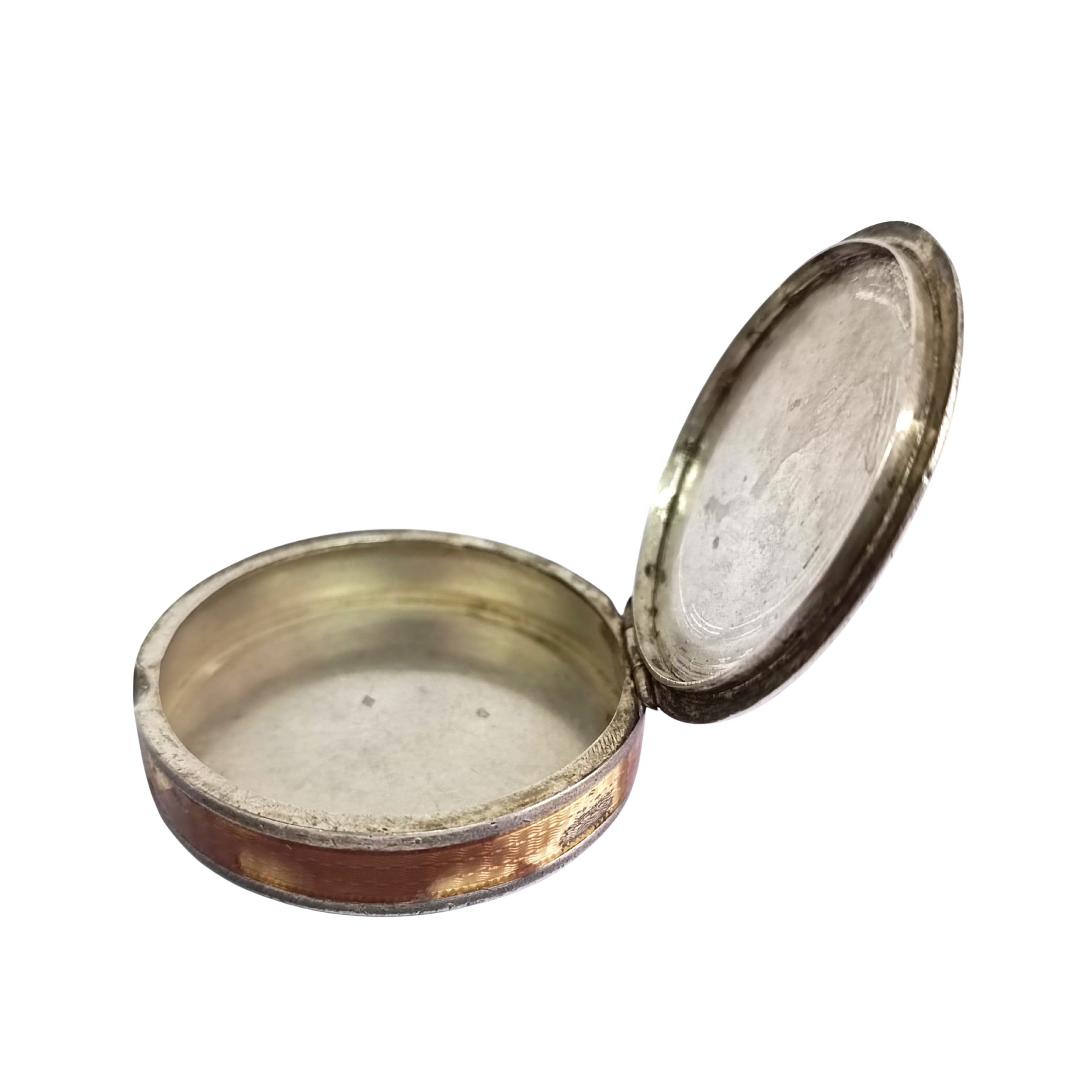 Niewielkie otwierane puzderko, ze spodem i brzegiem zdobionym techniką giloszu, brzeg dodatkowo pokryty kolorową warstwą, częściowo uszkodzoną/startą. Wewnątrz znak wytwórcy (niezidentyfikowany), Francja (?). Stan dobry.