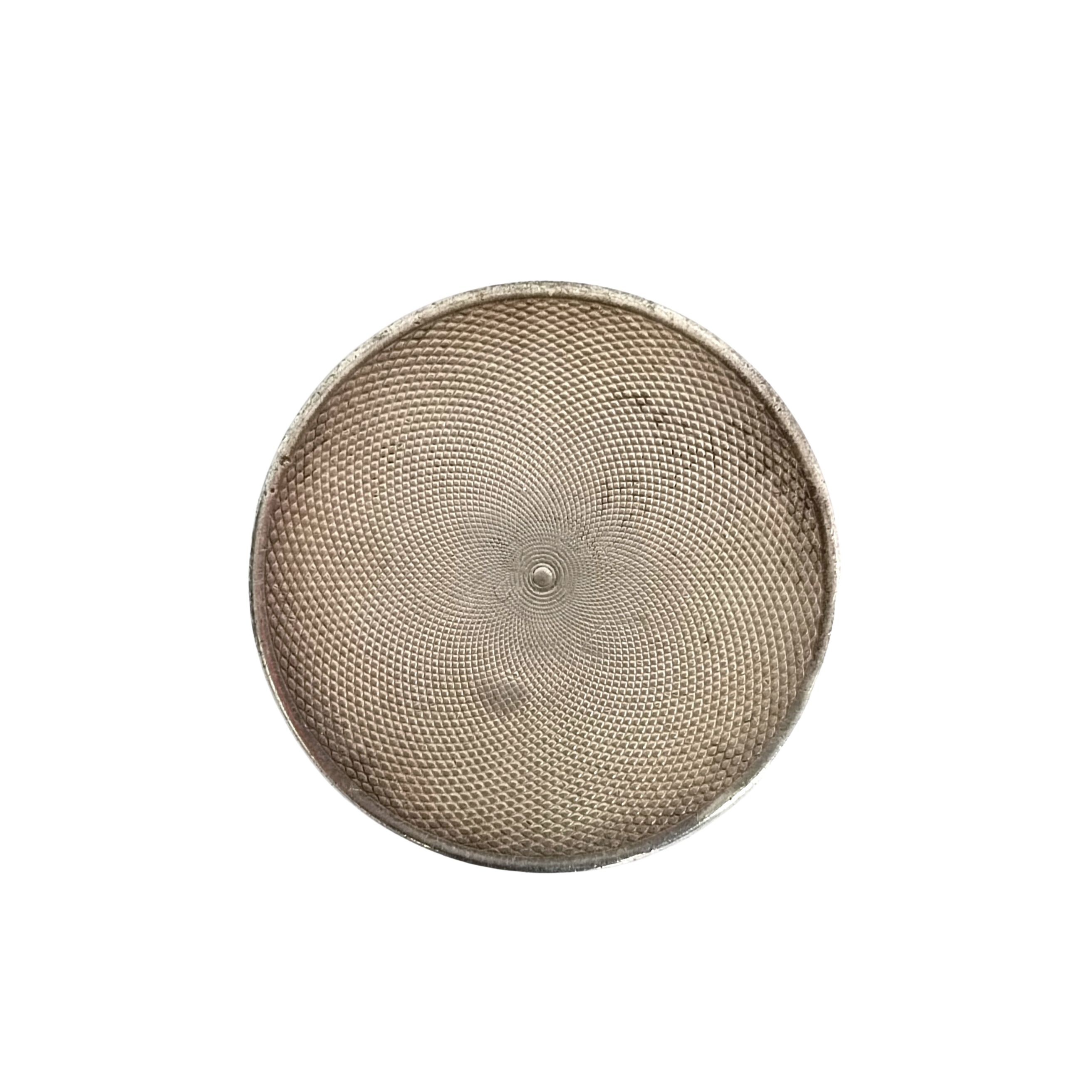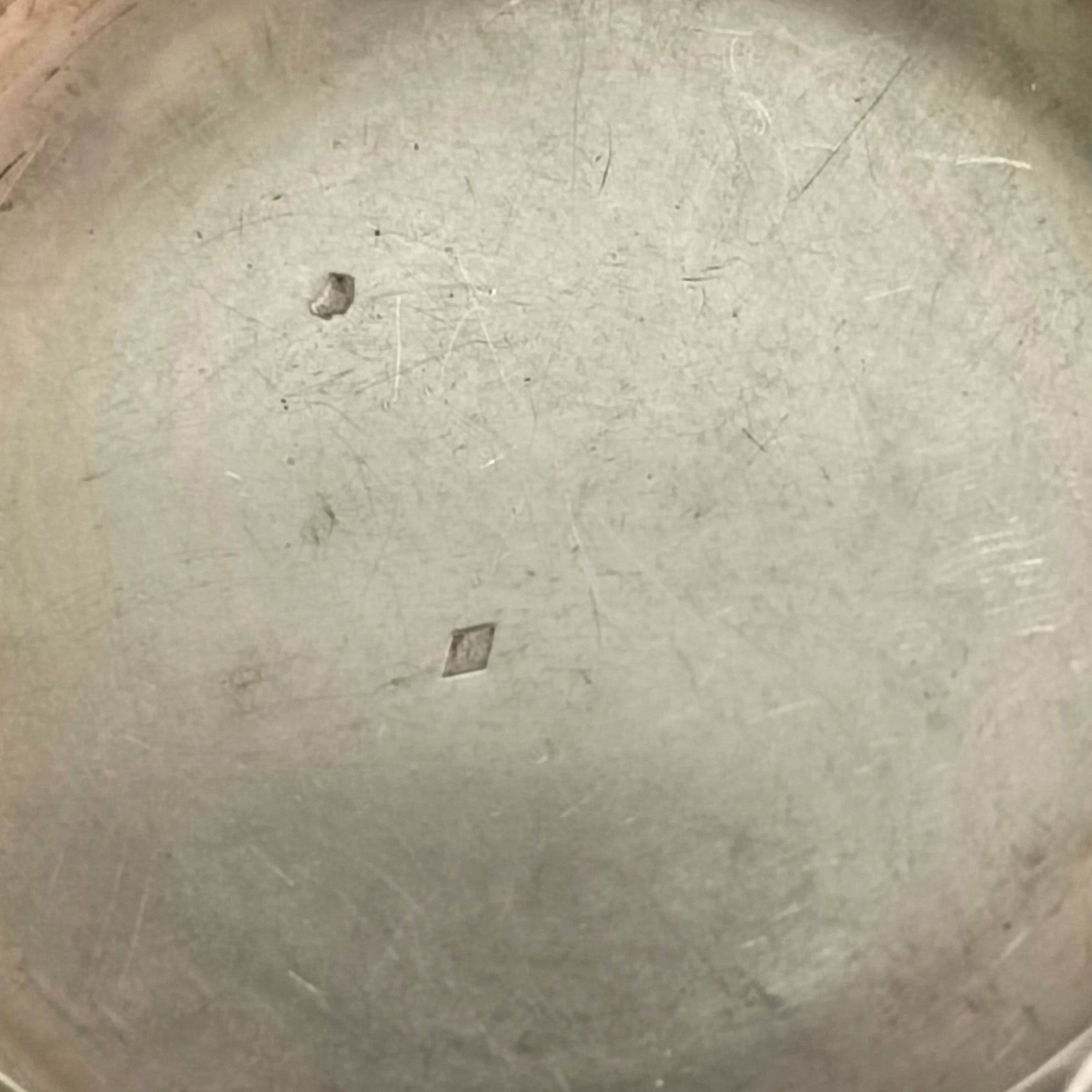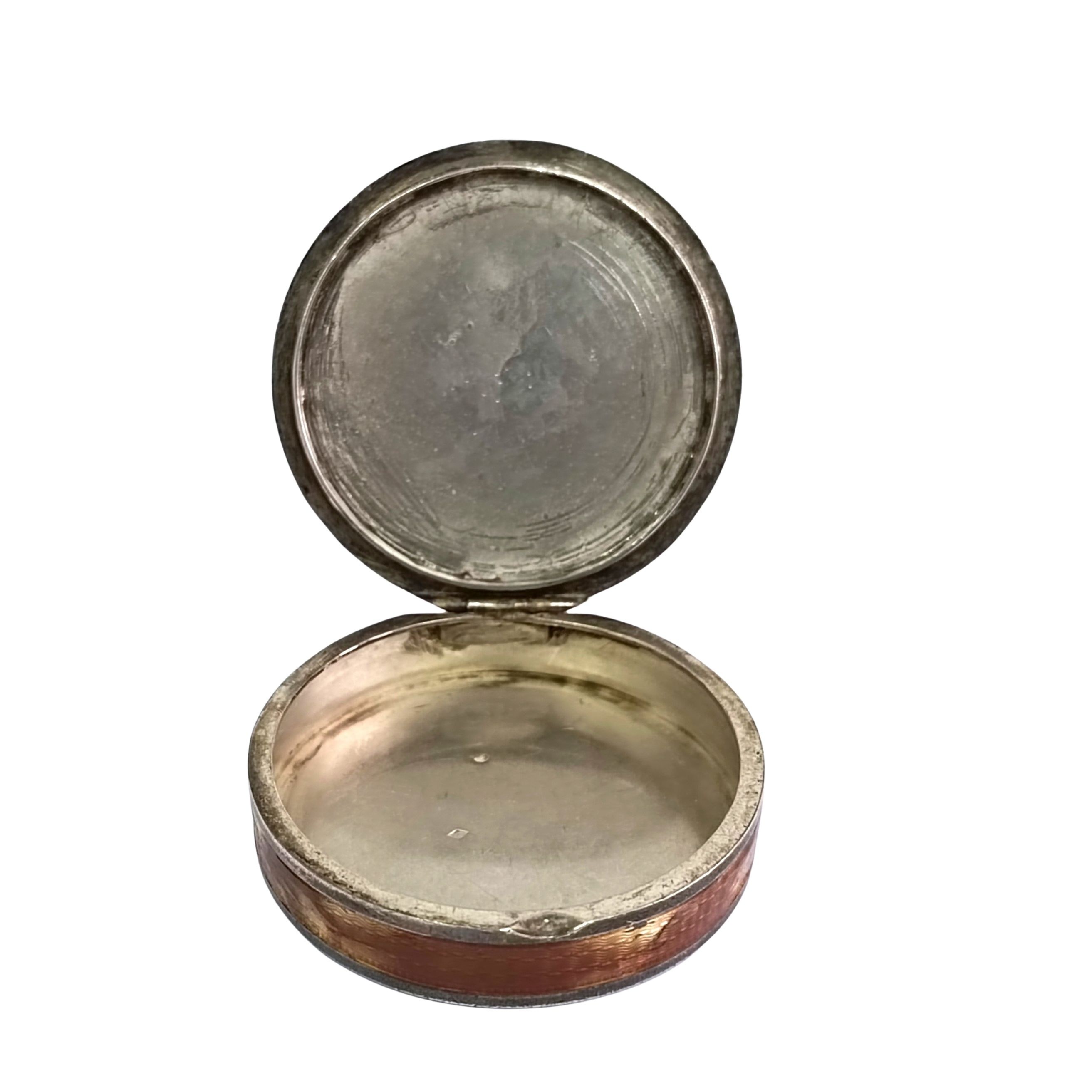 Niewielkie otwierane puzderko, ze spodem i brzegiem zdobionym techniką giloszu, brzeg dodatkowo pokryty kolorową warstwą, częściowo uszkodzoną/startą. Wewnątrz znak wytwórcy (niezidentyfikowany), Francja (?). Stan dobry.