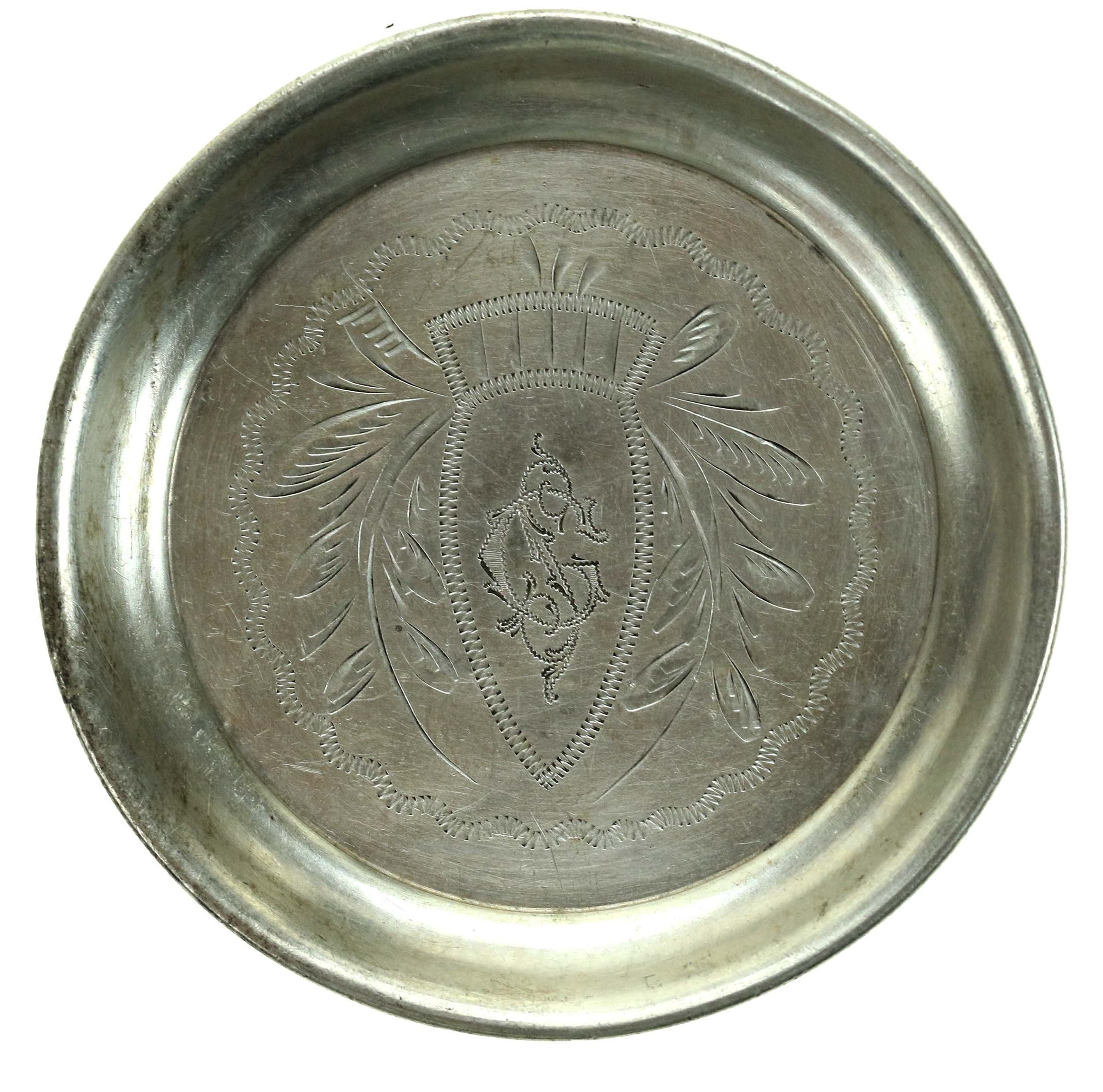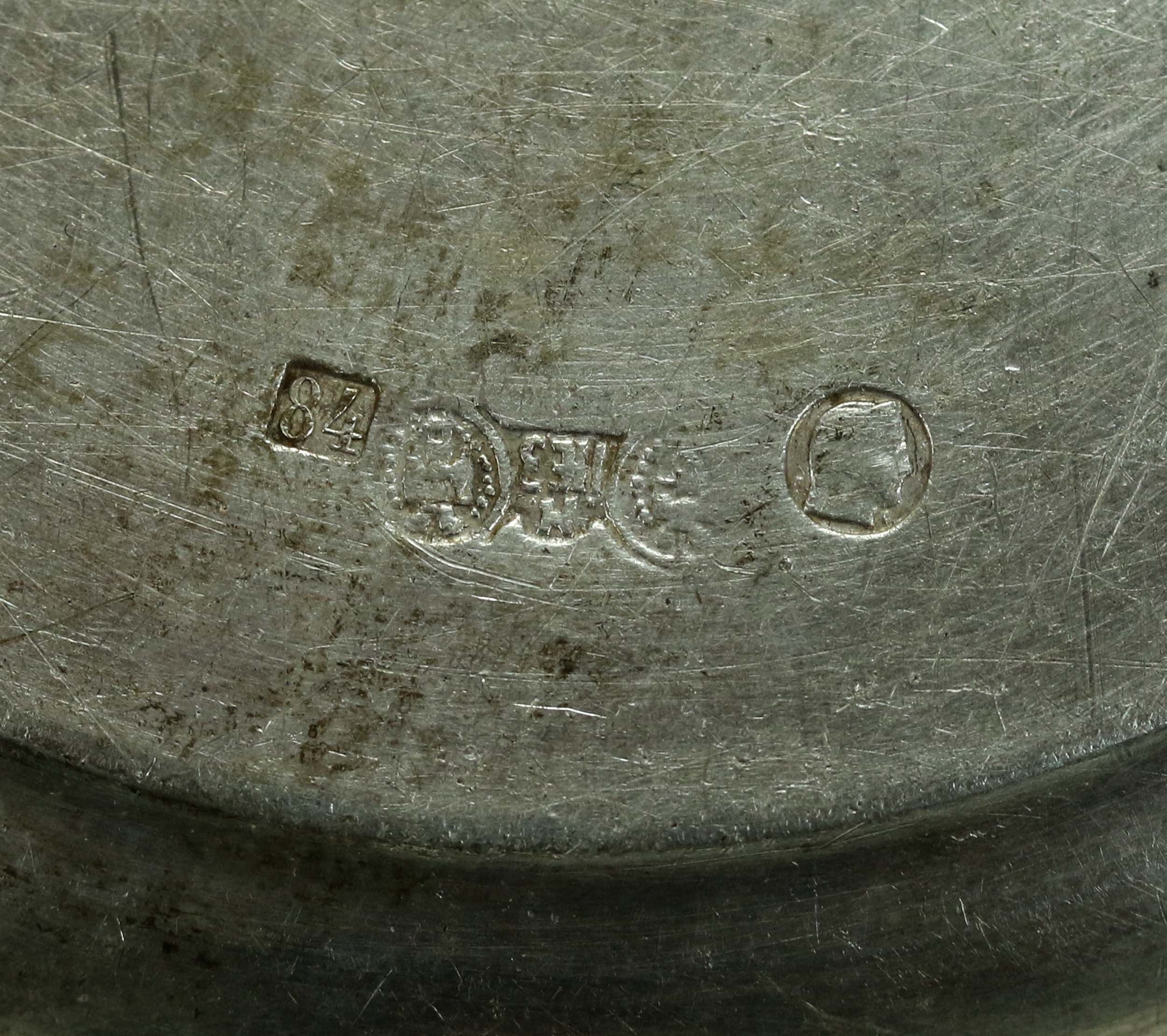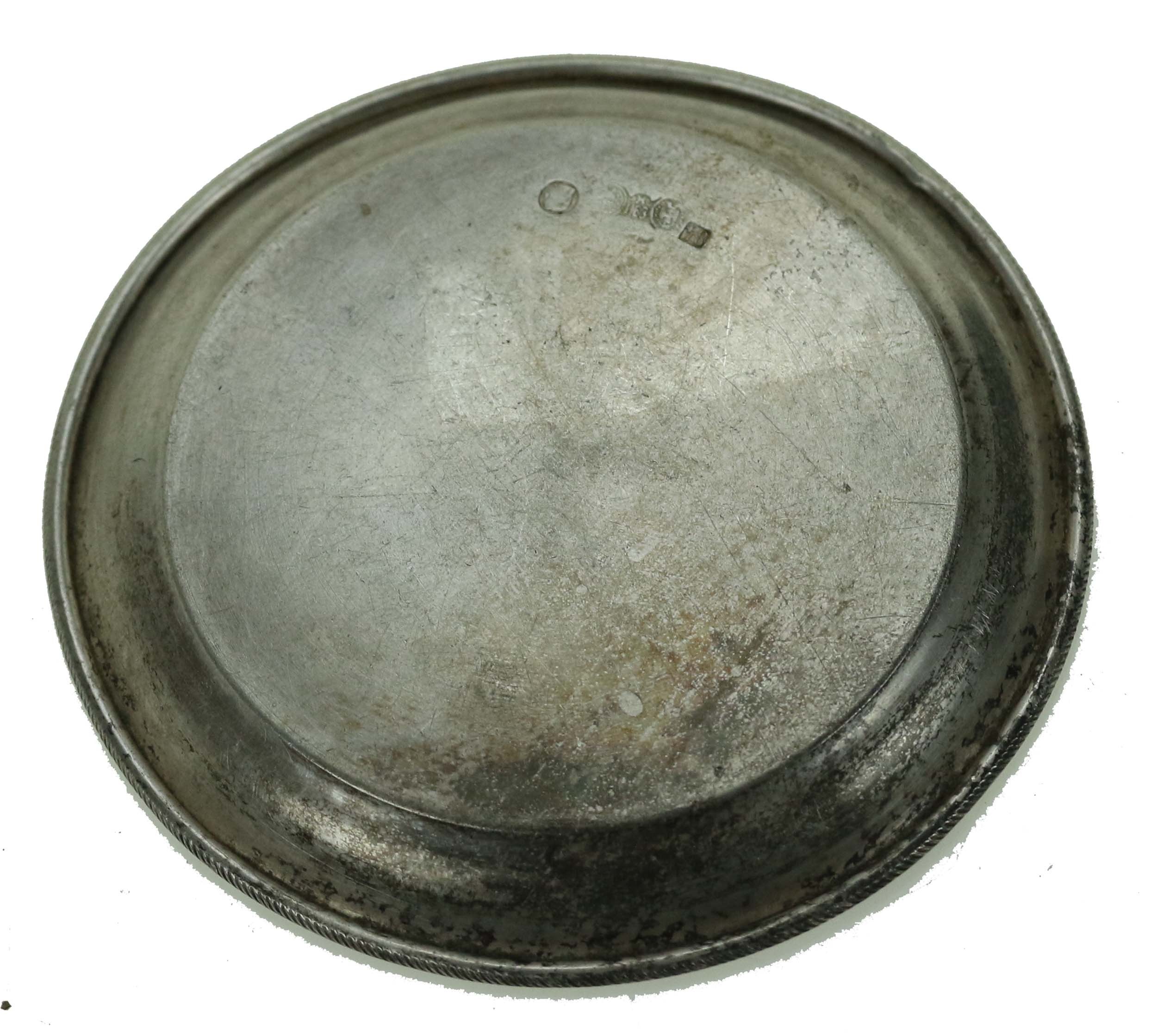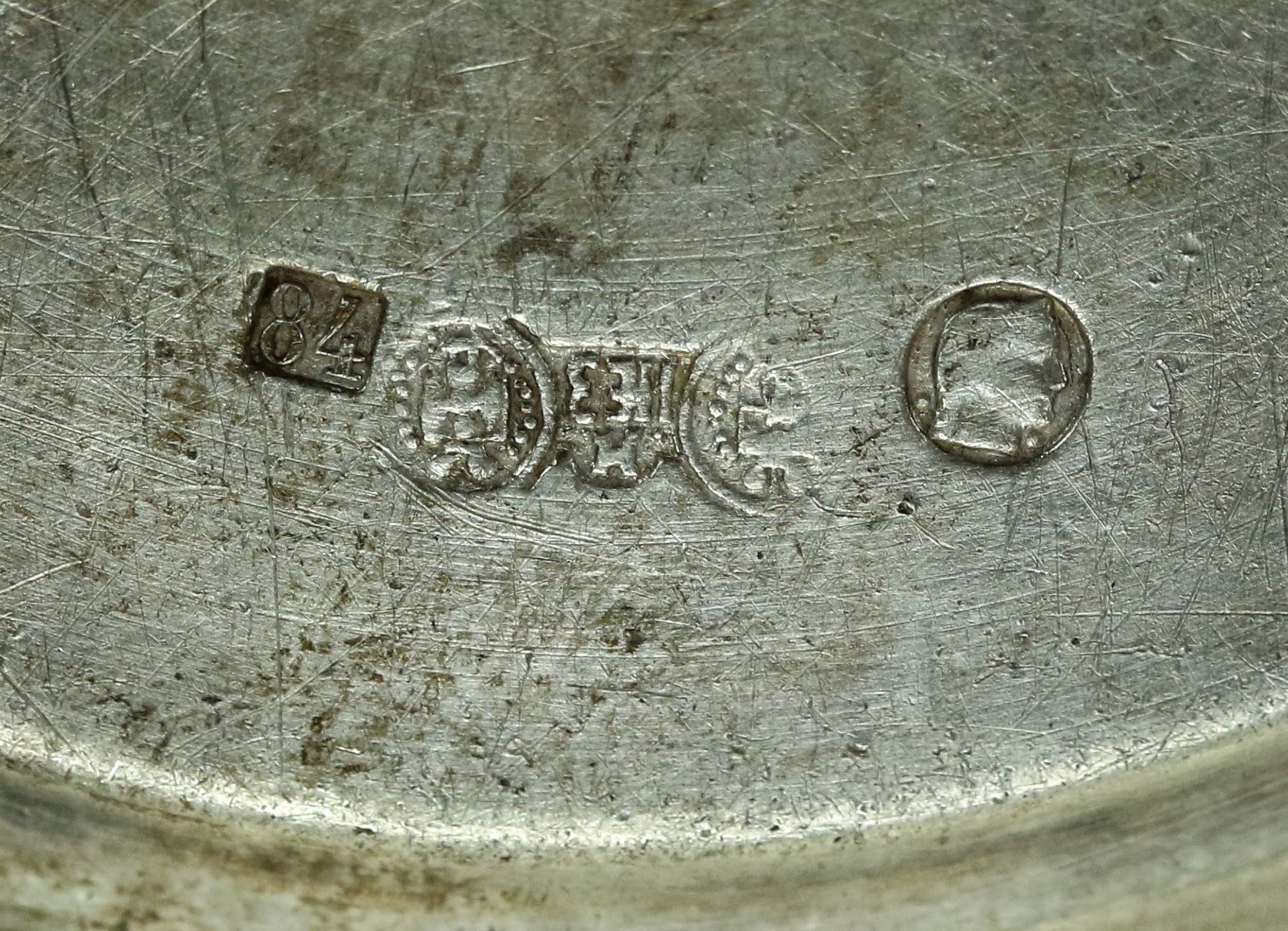 Talerzyk, podstawka pod kieliszek, Israel Jasiewicz Zacho, Kijów 1899 - 1908. Sygnatura złotnika ИЕЗ - Israel Jasiewicz Zacho, Kijów oraz kijowska cecha srebra z lat 1899 - 1908. Waga 32 g. Średnica 8,2 mm.