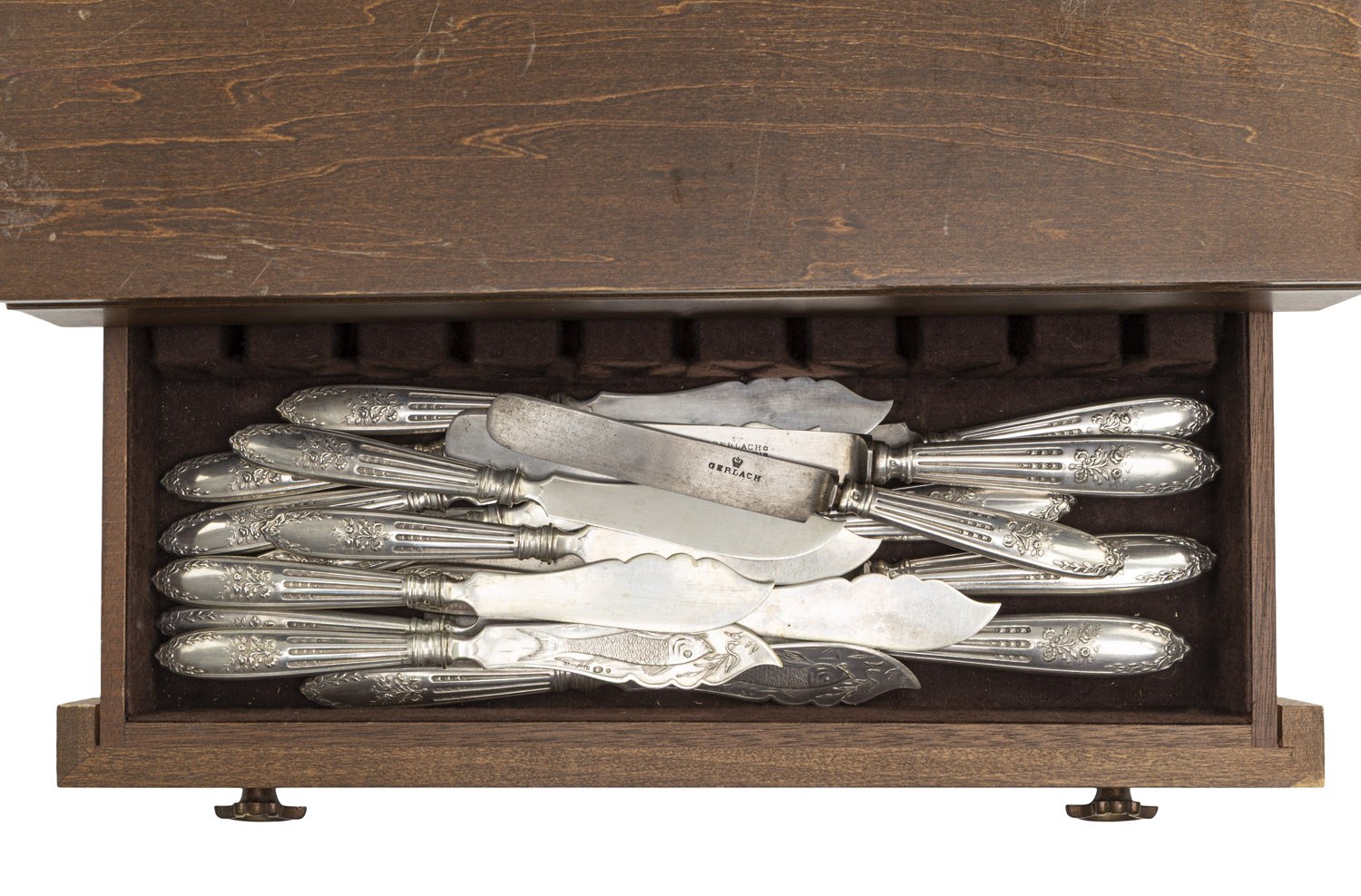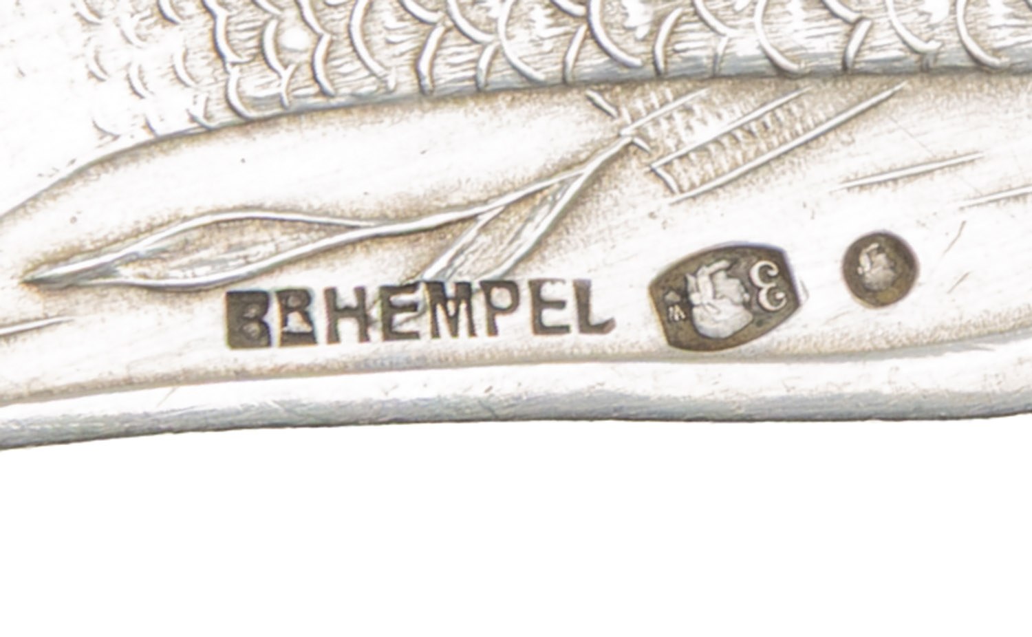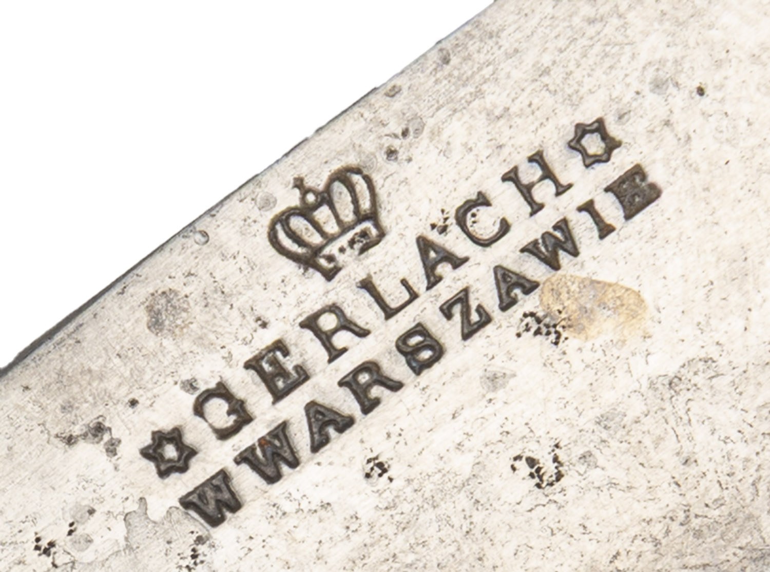 znaki złotnicze: warszawska punca probiercza stosowana w latach 1920-1931, firma złotnicza 'Br HEMPEL' - Bracia Hempel (Władysław i Stefan), działająca w latach 1894-1944, złotnik 'WH' - Władysław Hempel, oznaczenie na ostrzach noży: 'GERLACH | W WARSZAWIE'