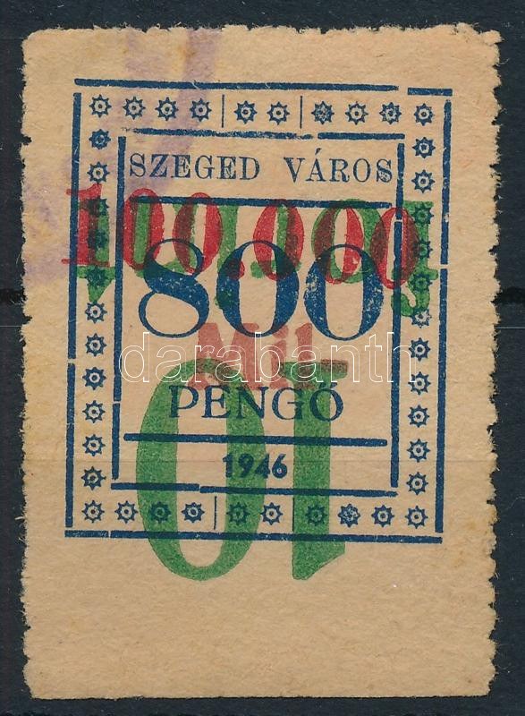 Szeged városi 800P okmánybélyeg fordított felülnyomással / inverted overprint