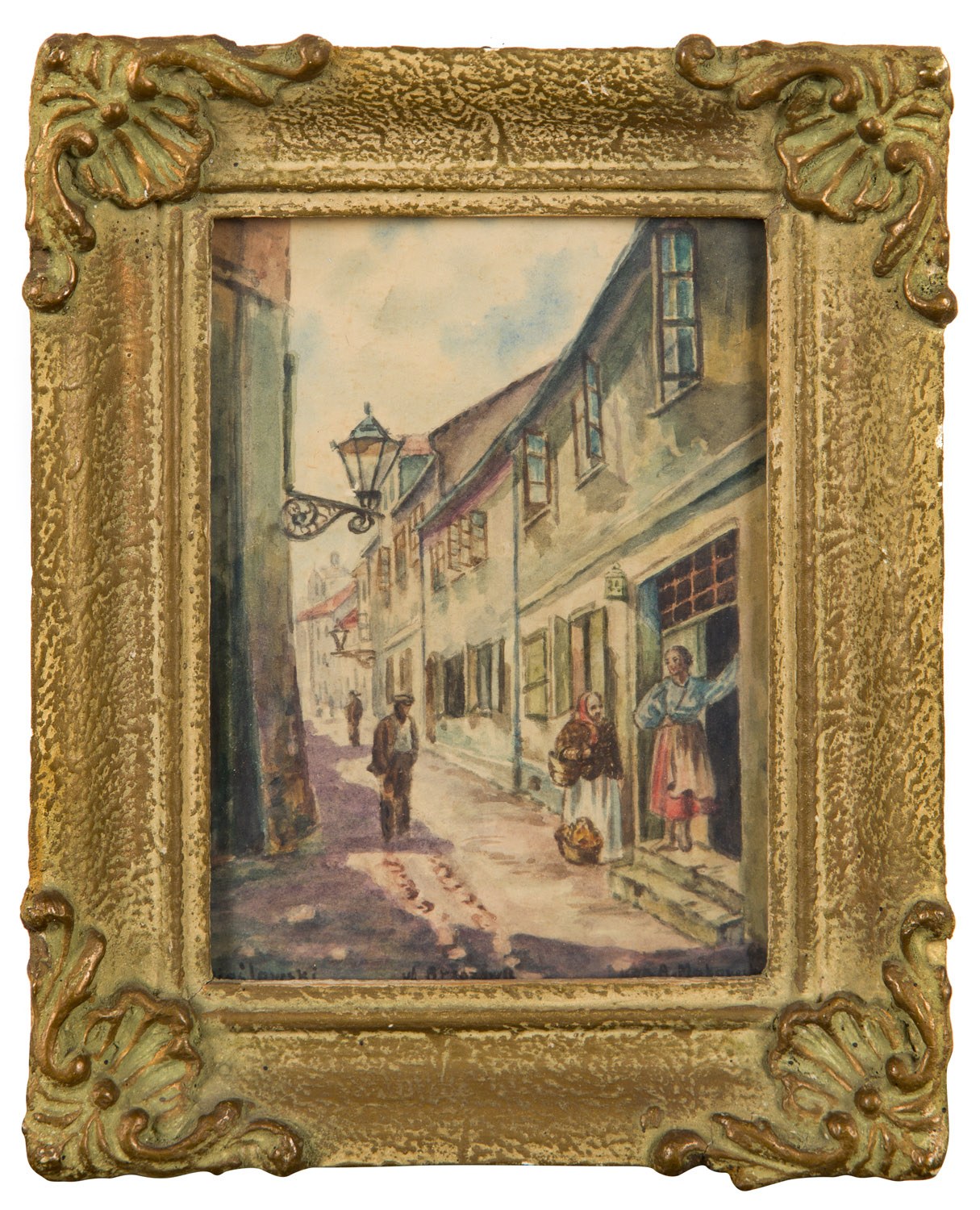 akwarela, papier, 13,5 x 10 cm (w świetle oprawy); opisany u dołu: Cieślewski ul. Brozowa A. Makowska; praca oprawiona