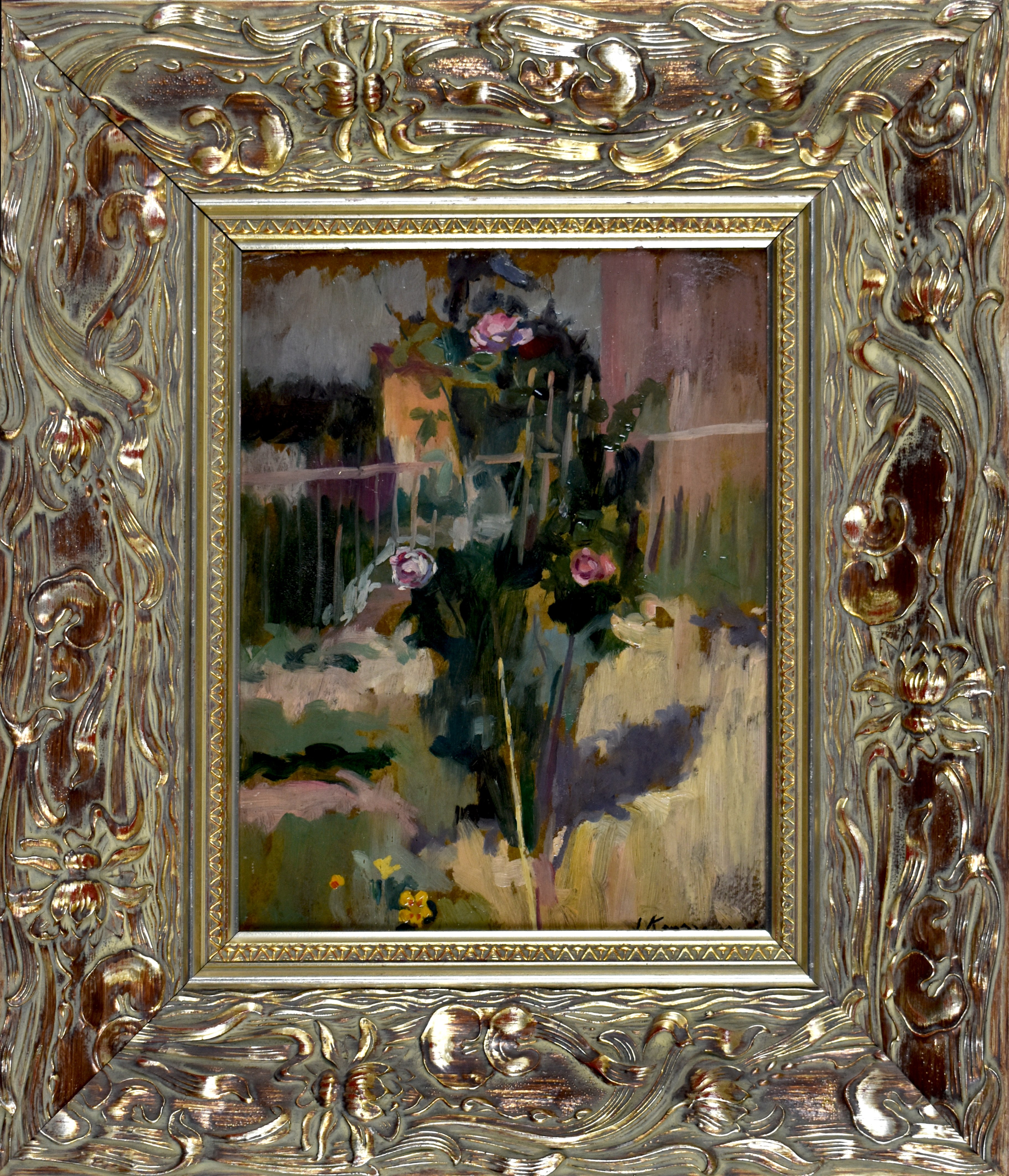 na odwrocie opisany ołówkiem: Jerzy Karszniewicz 1878-1945 r. ASP Kraków 1901 / Widok z ogrodu artysty w Jankówce (pod Wieliczką) gdzie zamieszkał po powrocie z Paryża (długopisem)