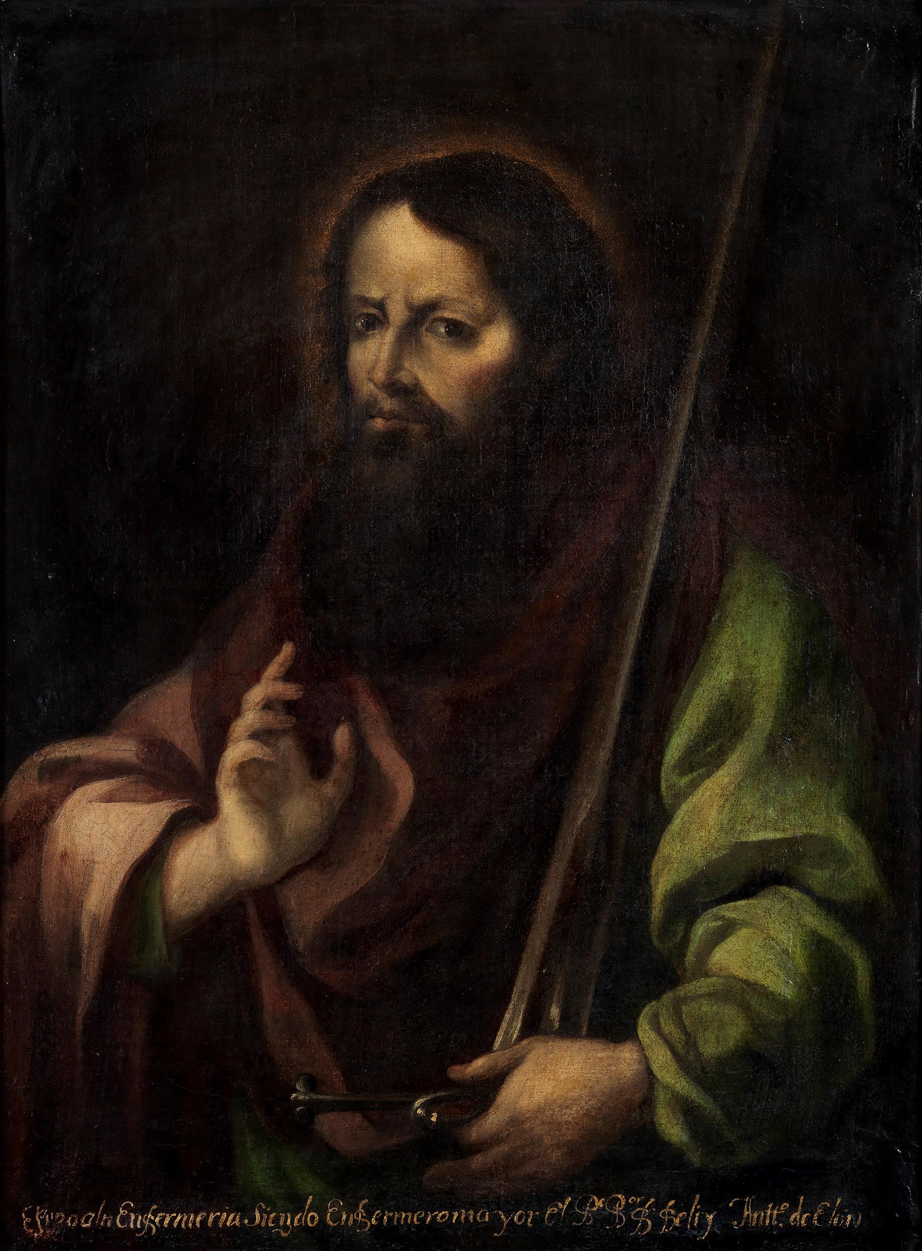 Vor dunklem Fond sich abzeichnend die sich leicht nach links wendende Halbfigur des Apostels Paulus mit im Redegestus erhobener Hand, zusammengekniffener Stirn und einem langen ihm attributiv zukommendem Schwert in seiner anderen Hand. (14015313) (13)