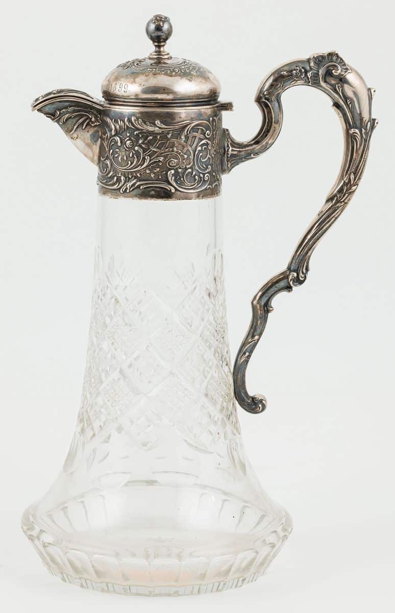 Szkło bezbarwne, szlifowane, oprawa srebrna, próba 800, wys. 29 cm