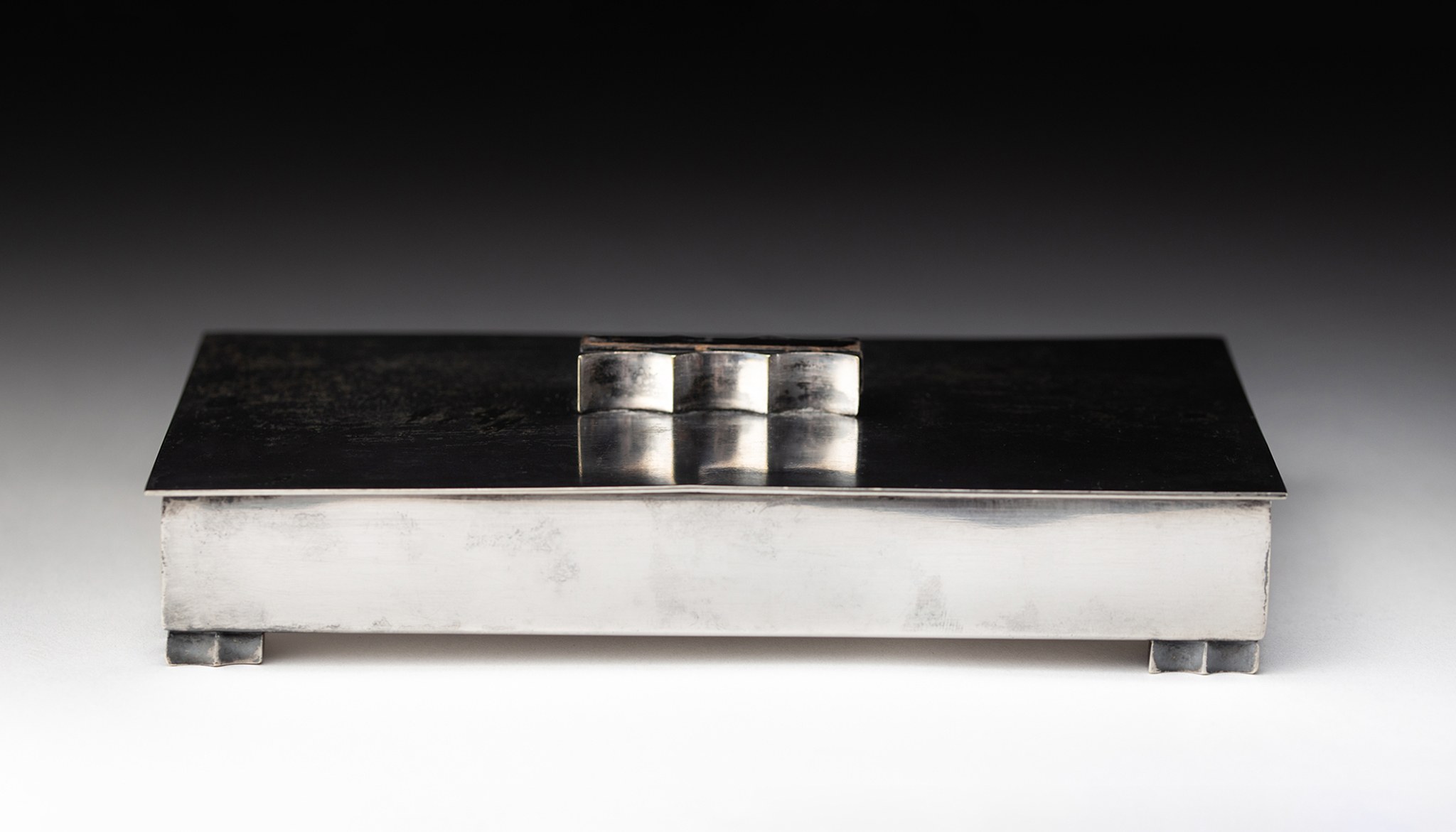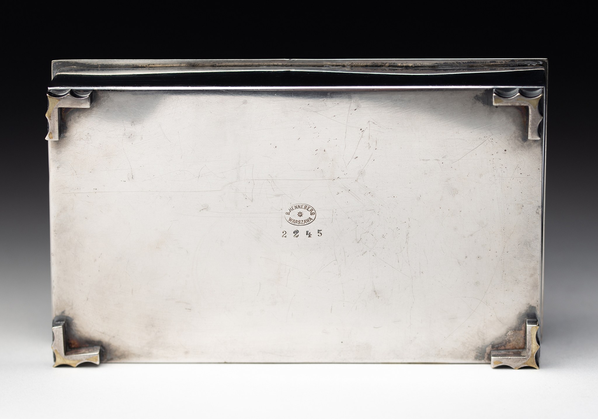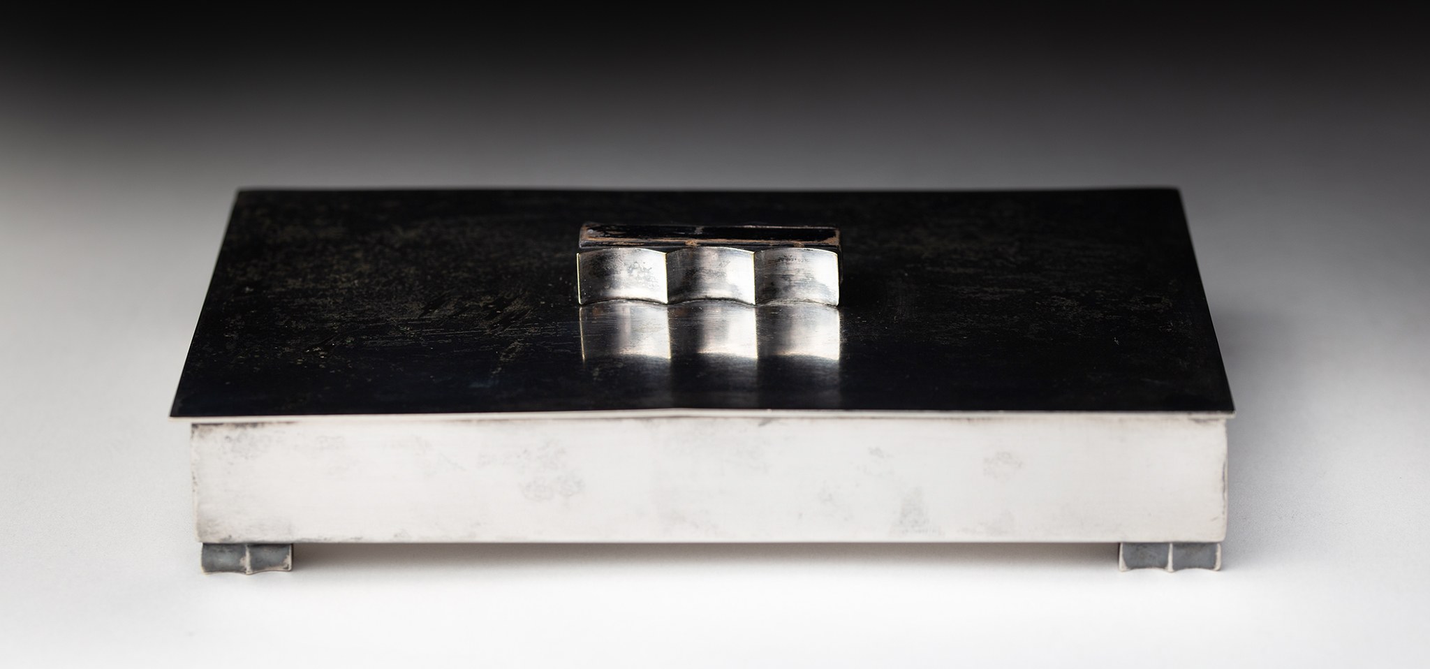 mosiądz srebrzony (srebrzenie oryginalne, pierwotne), Warszawa, wytwórnia Braci Henneberg, lata 30. XX wieku, 3 x 17,5 x 10,5 cm.