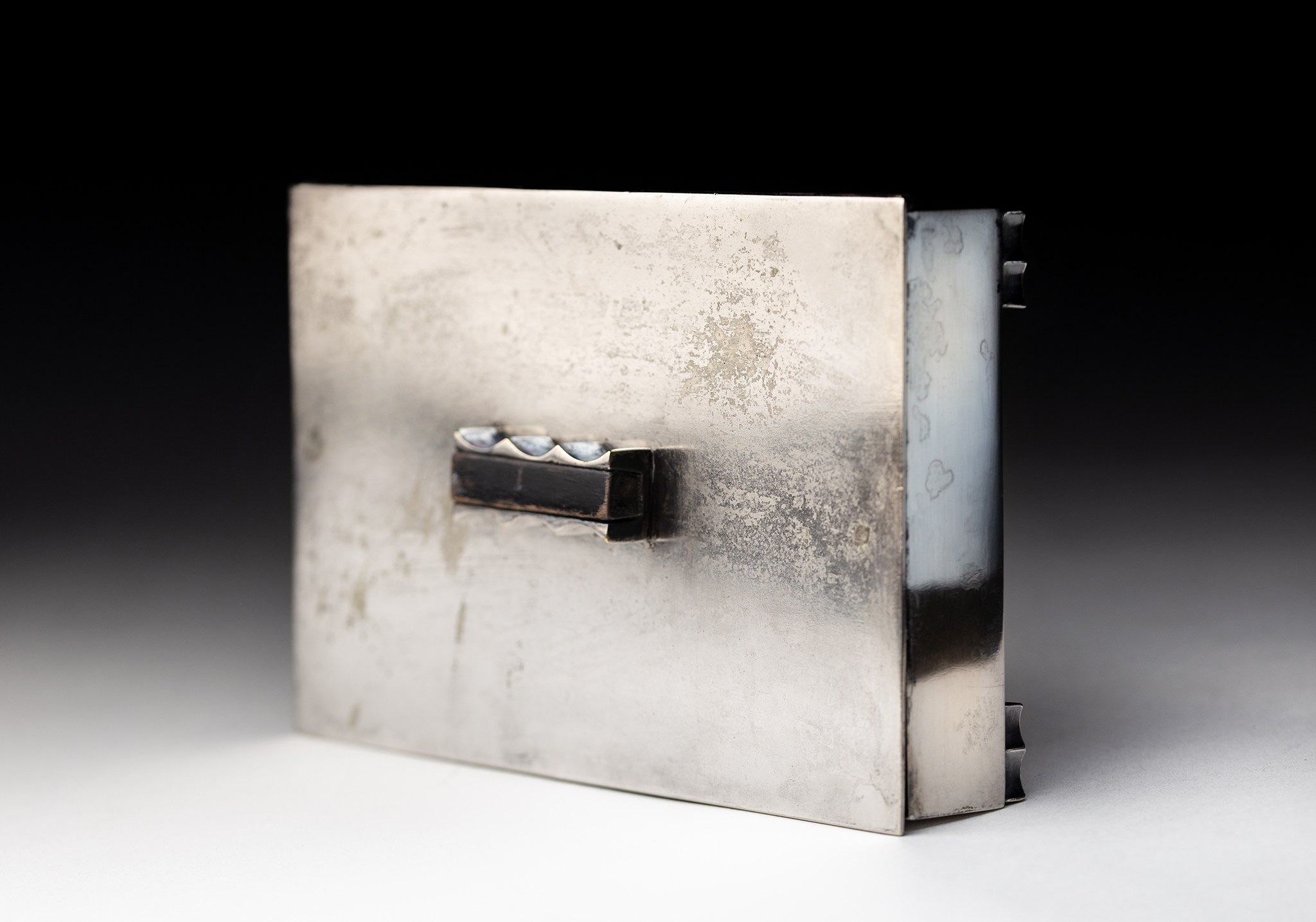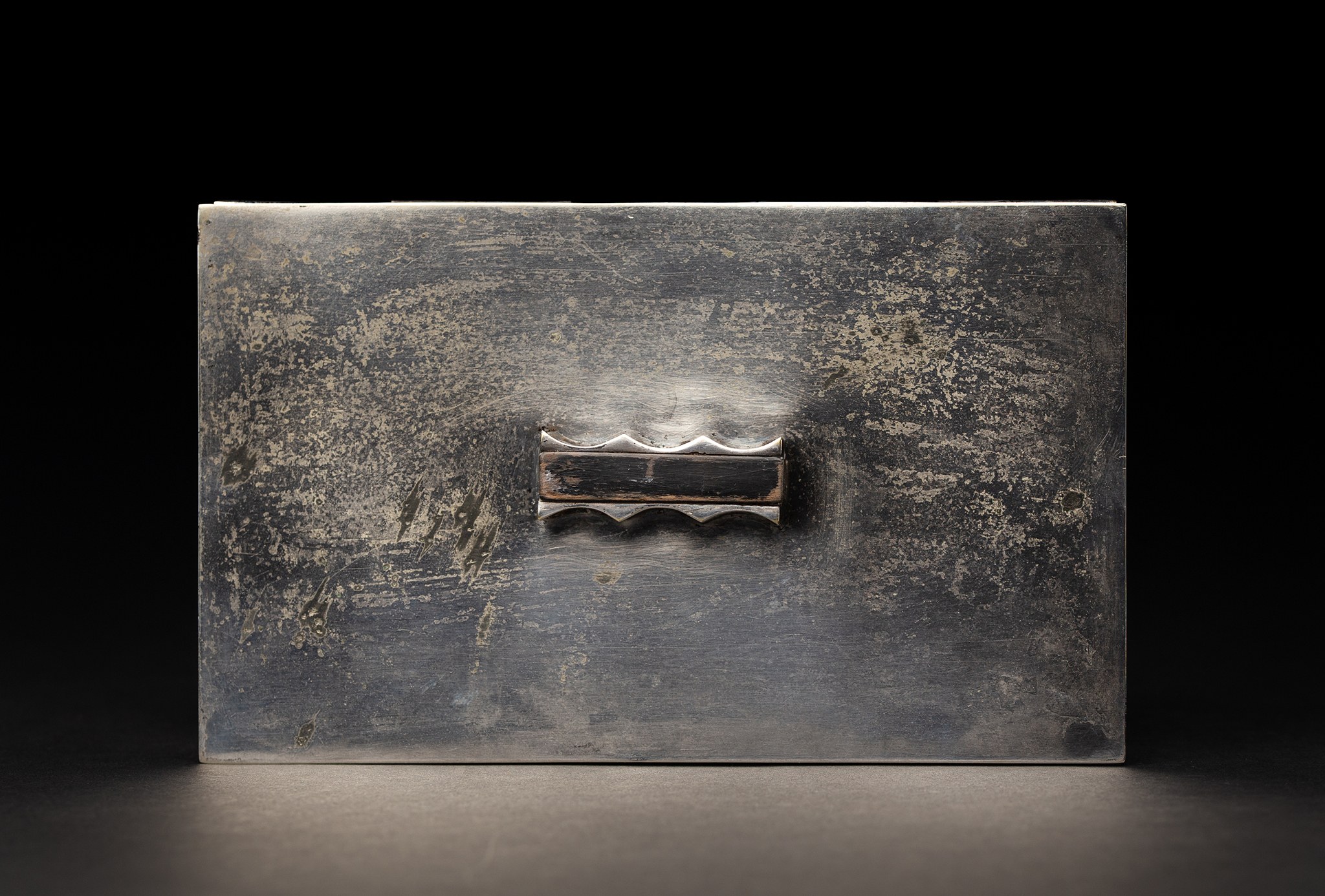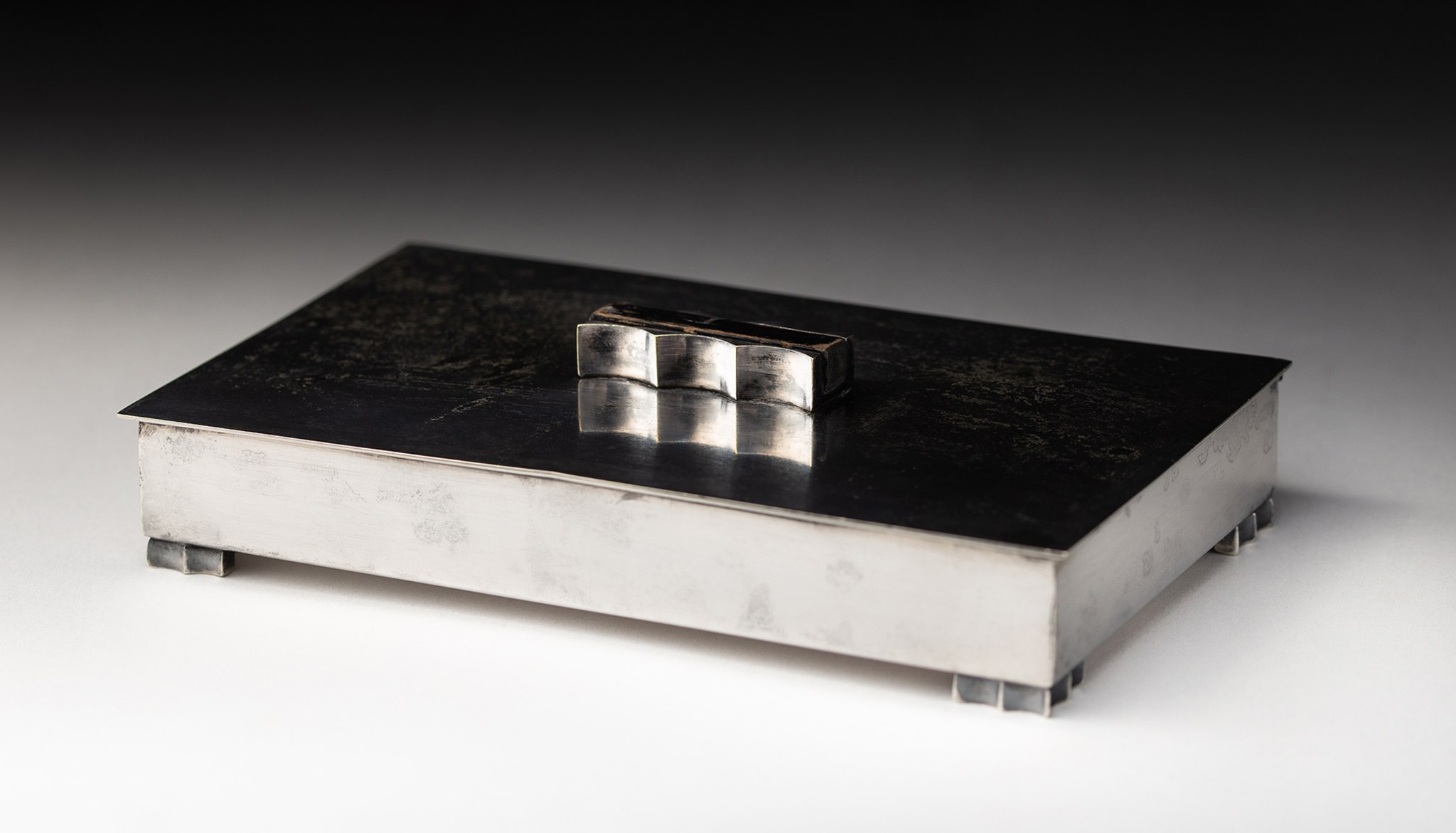 mosiądz srebrzony (srebrzenie oryginalne, pierwotne), Warszawa, wytwórnia Braci Henneberg, lata 30. XX wieku, 3 x 17,5 x 10,5 cm.