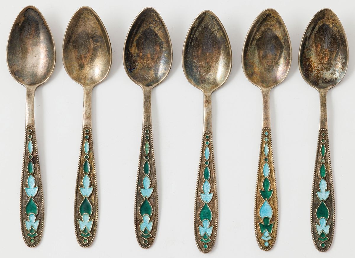 Srebro, emalia komórkowa, waga 92 g, dł. 11,7 cm Puncowanie: 0 ЛЮ; Л, gwiazdka z sierpem i młotem 875 Cena wywoławcza 700 Estymacja 800 - 1000 zapytaj o obiekt