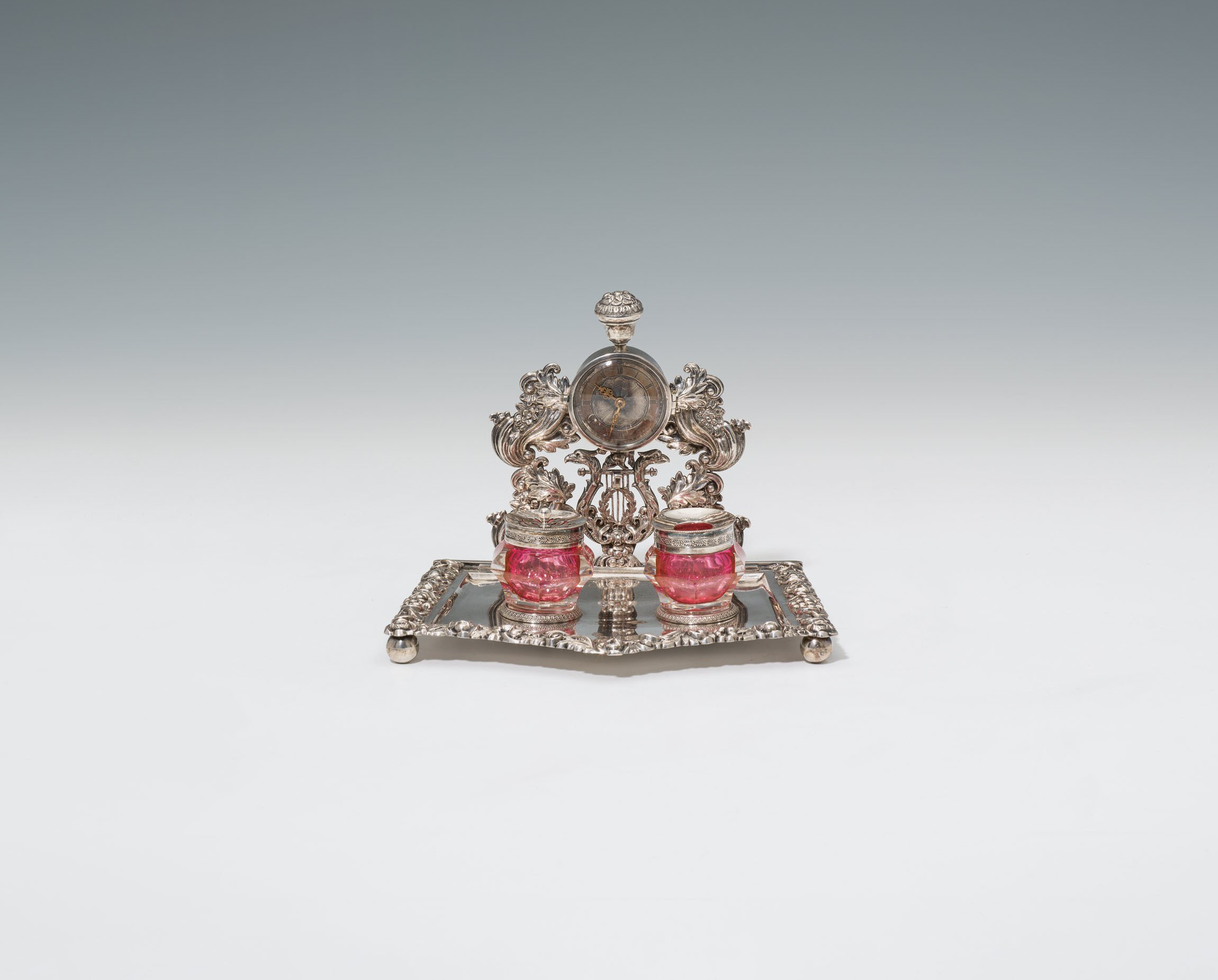 silver; colourless glass, cranberry underlay; marked on the bottom of the tray: Old Viennese hallmark "1836" and unidentifiable master's mark; pocket-watch movement with spindle gear "Elicot London", keylift; functioning, without warranty; sand bowl with minor chip at the bottom edge