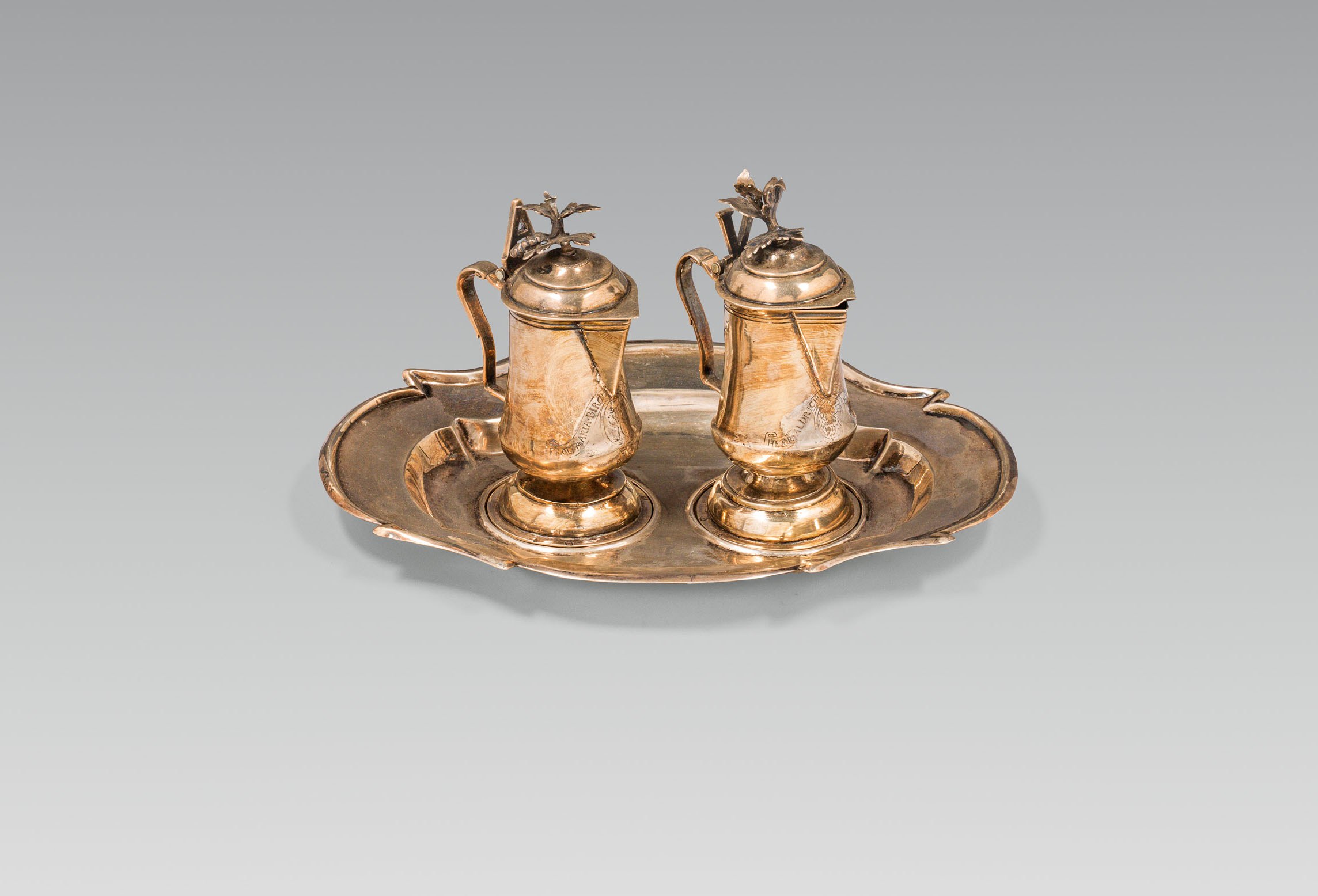 silver, partly gilded; oval plate with 2 standing rings for the two jugs, the jugs with engraved inscription strip: "FRAU MARIA BIRCHLER VON EINSILLEN" as well as "HERR ALDRICHGIR VON EINSILLEN" and cartouche with eagle and depiction of a tree, on the lid the marking "A" for water and "V" for wine, crowned with acorns and grape leaves; marked: unidentifiable Old Viennese hallmark, marked "IB" for Josef Binder (see Neuwirth, Wiener Gold- und Silberschmiedemarken, vol. I, pp. 125) and tax-free stamp