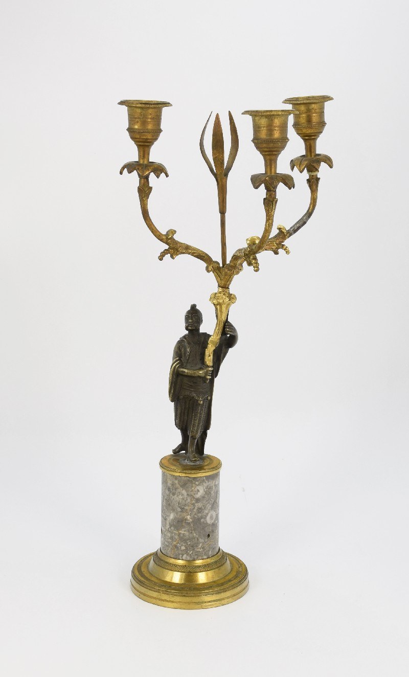 Podstawa z brązu, kolista, profilowana i moletowana; cokół cylindryczny, toczony z szarego marmuru. Trzon w formie figury mężczyzny o mongolskich rysach, w szarawarach i płaszczu na ramionach, trzymającego oburącz gałąź z brązu złoconego, rozwidlającą się w trzy ramiona świecznika zakończone walcowatymi tulejkami.