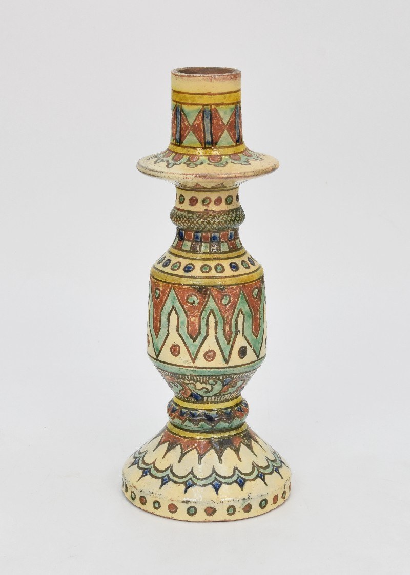 Profilowany tralkowy lichtarzyk na świecę z dekoracją ornamentalno-geometryczną o rytym konturze, z motywami kółek, rombów, ząbków, kratownicy i szlaków półkoli w układzie pasowym poziomym.