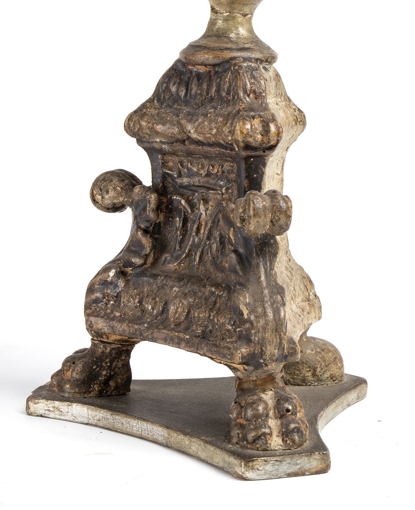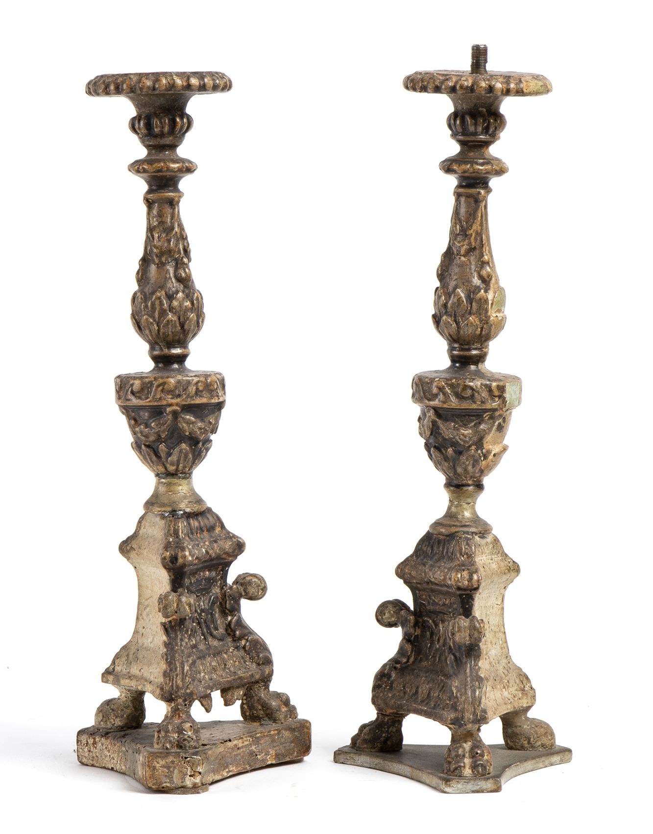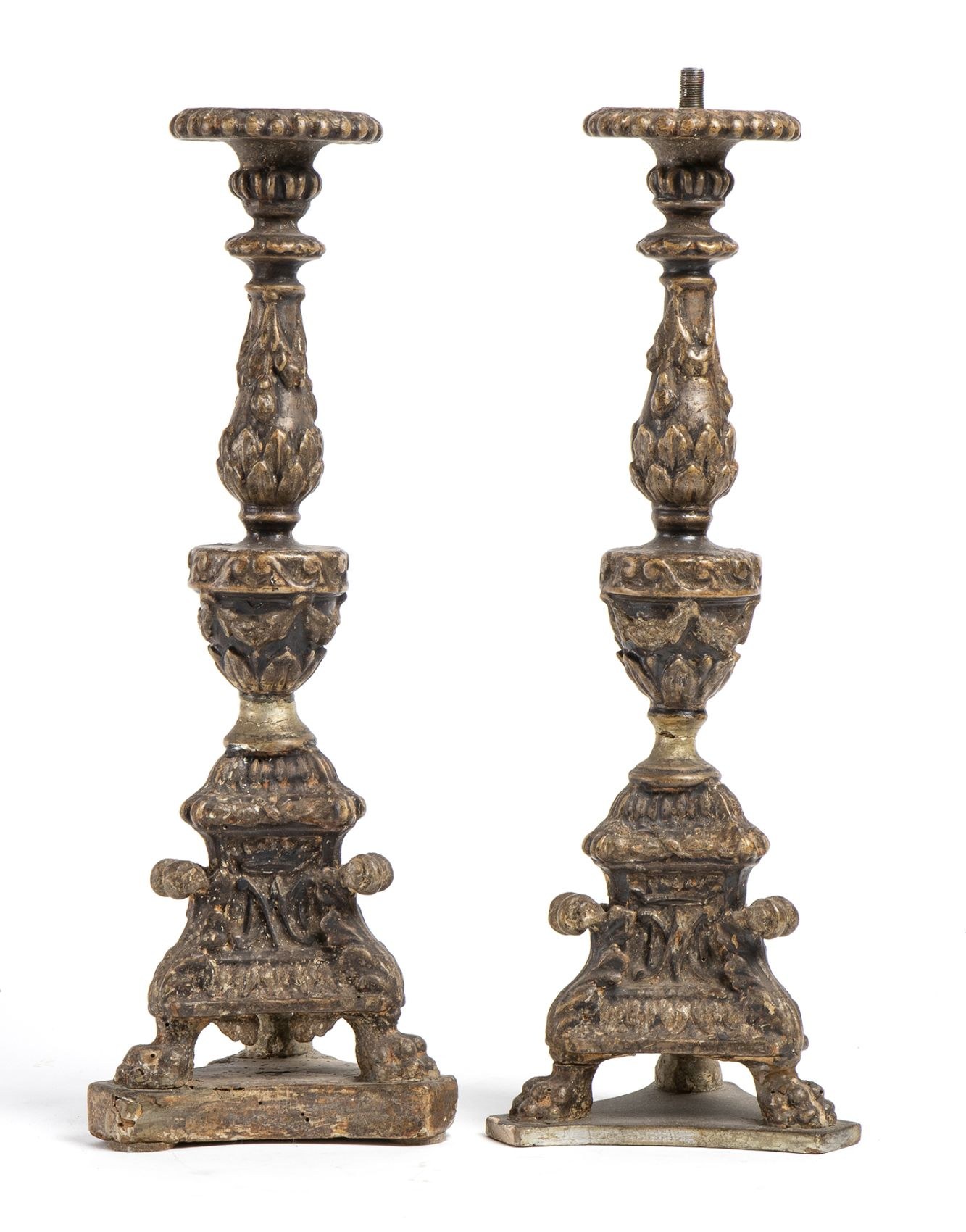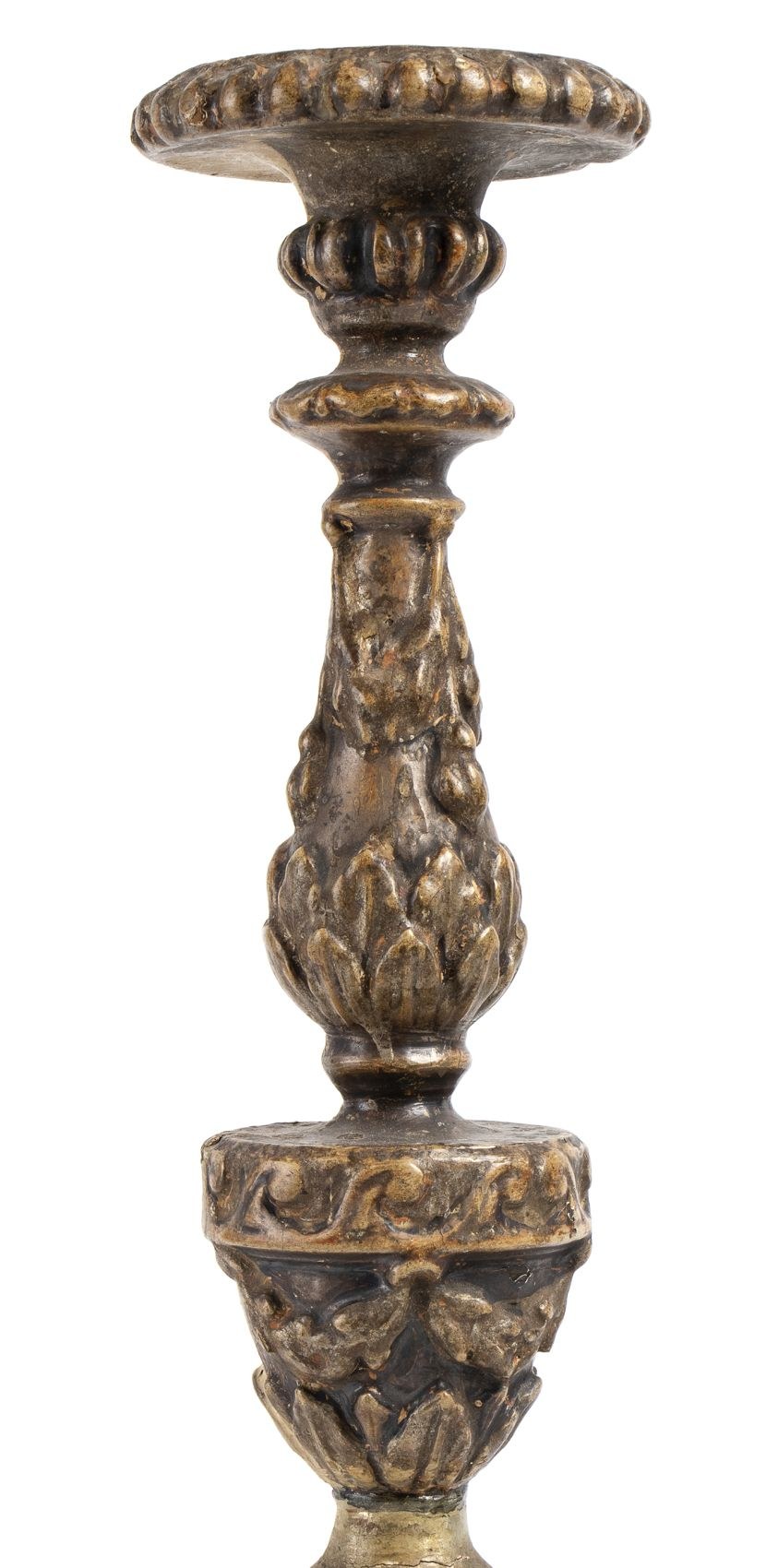 Pair of Italian gilt wood torch holders - 18th century, mecha gilding. Dimensions 40 x 14 x 14 cm. Item condition grading: *** fair (defects and a not in period base).