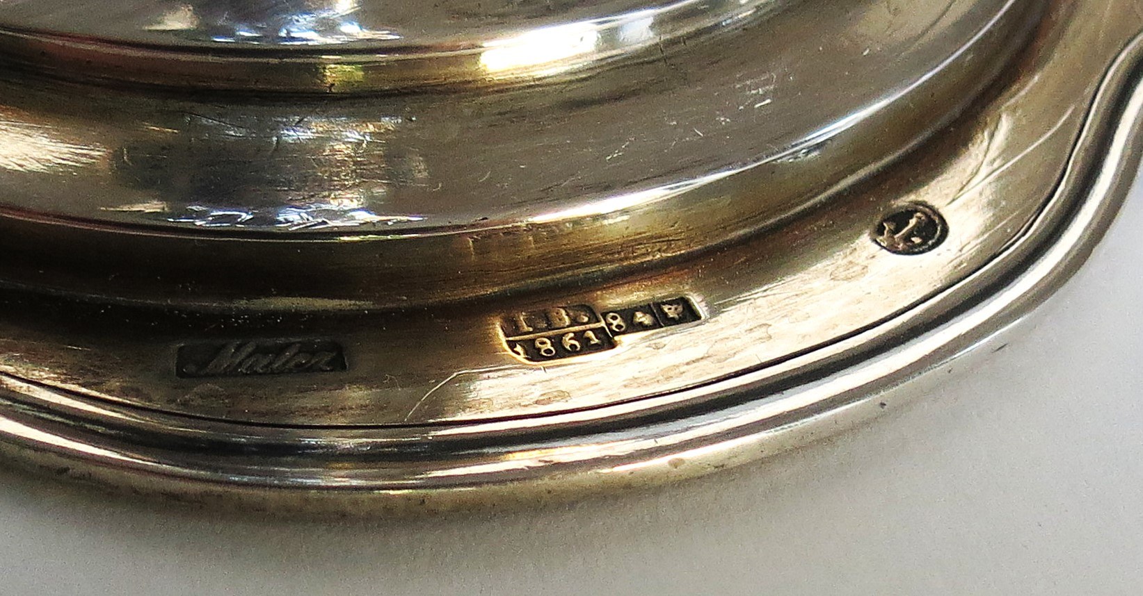 stopy koliste o falistej krawędzi, uskokowo wysklepione, tralkowe trzony, wazonowe tulejki, profitki w formie puklowanych talerzyków, na płaszczu stopy grawerowany monogram: AW; wys. 16,5 cm, waga 362 g, srebro pr. 84, cecha probierni warszawskiej z 1861, probierz IB (Jan Biendugowski), sygn. złotnika: "Malcz", znak warsztatowy - kotwica. Stan zachowania: jedna profitka lekko wygięta.