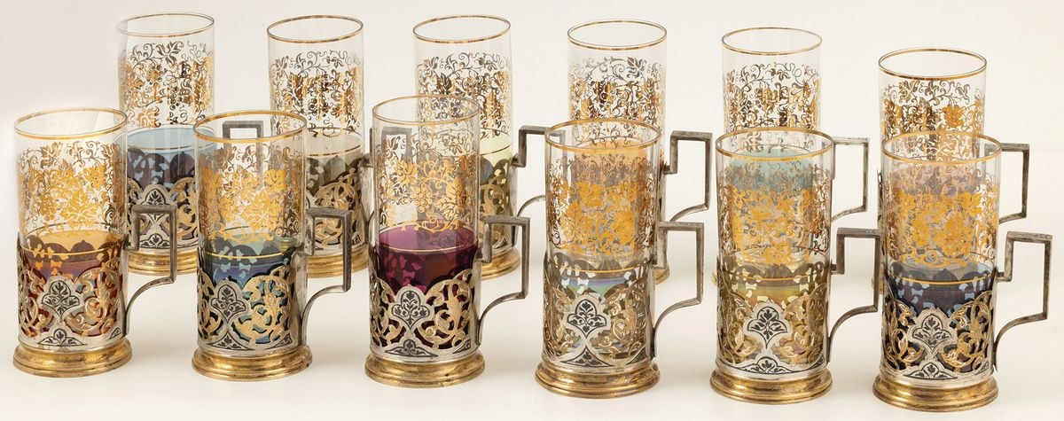 Szkło, lazurowanie, złocenie, wys. 13,5 cm, koszyczki srebrne, pr. 875, złocenie, niello, waga 1063 g, wys. 10 cm