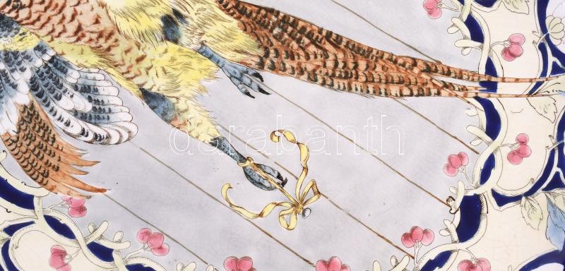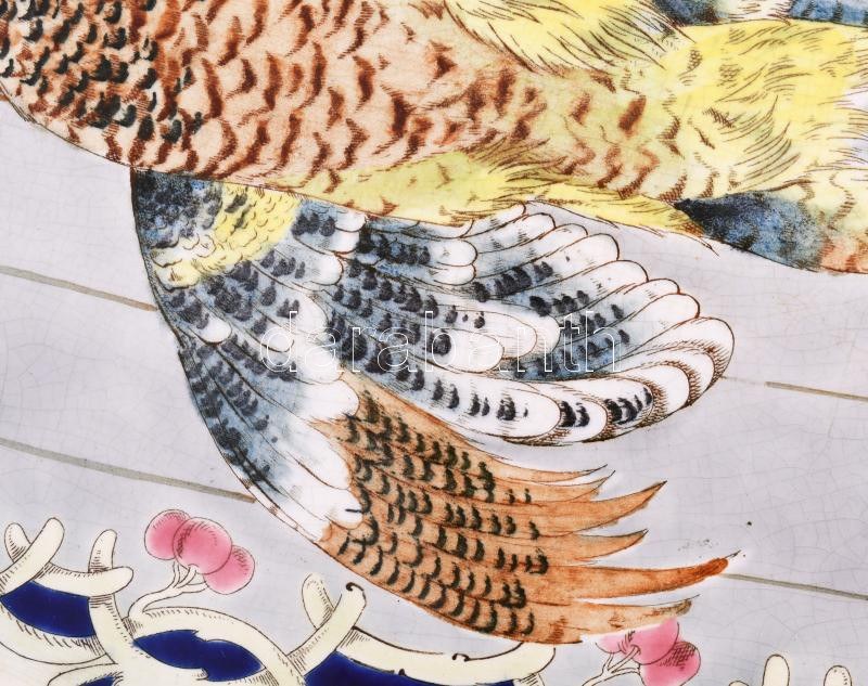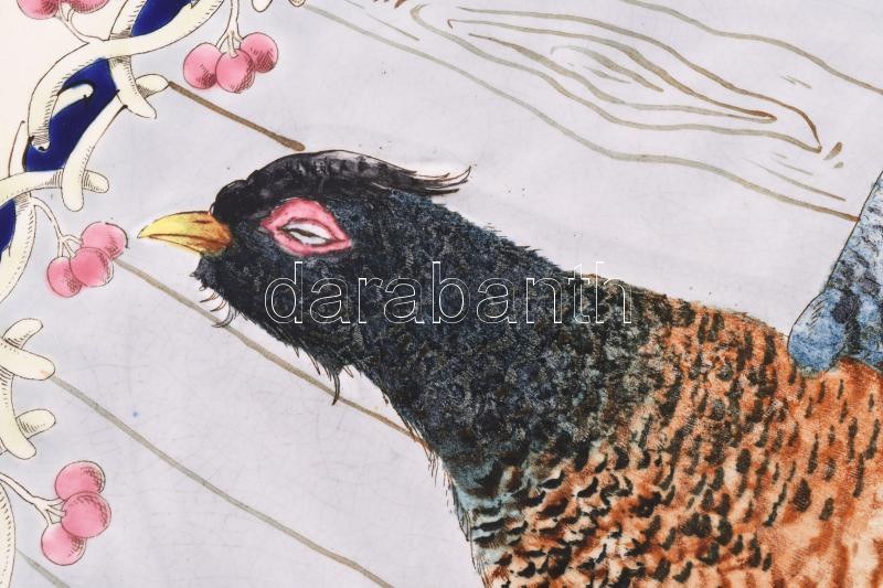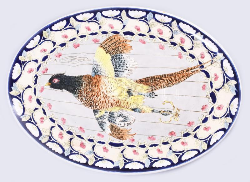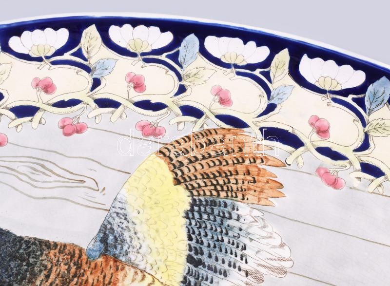 1880-1910 Rudolf Ditmar Znaim nagyméretű ovális szecessziós vadászmintás falitál. Középen levadászott fácán alakjával, körülötte összefonódó virág- és bogyódíszek. Magastüzű színes mázakkal fedett fajansz, jelzett, mázrepedéssel, 58x42 cm /// 1880?1910 Rudolf Ditmar Znaim large oval Art Nouveau wall platter with hunting motif. Depicting a hunted pheasant in the center, surrounded by intertwined floral and berry decorations. Faience covered with high-fire colored glazes, marked, with glaze crazing. Size: 58×42 cm /// KIZÁRÓLAG SZEMÉLYES ÁTVÉTEL, NEM POSTÁZZUK / ONLY PERSONAL COLLECTION IN OUR OFFICE!