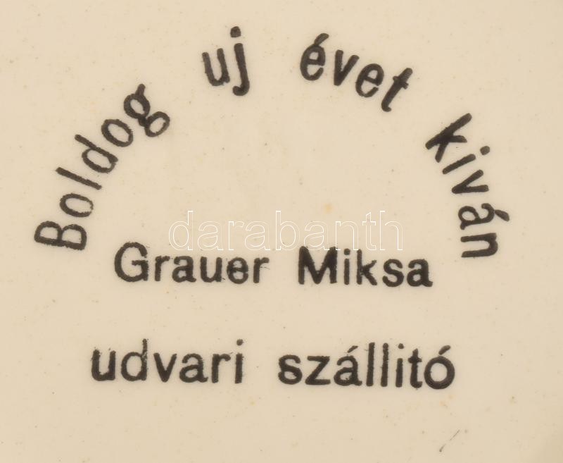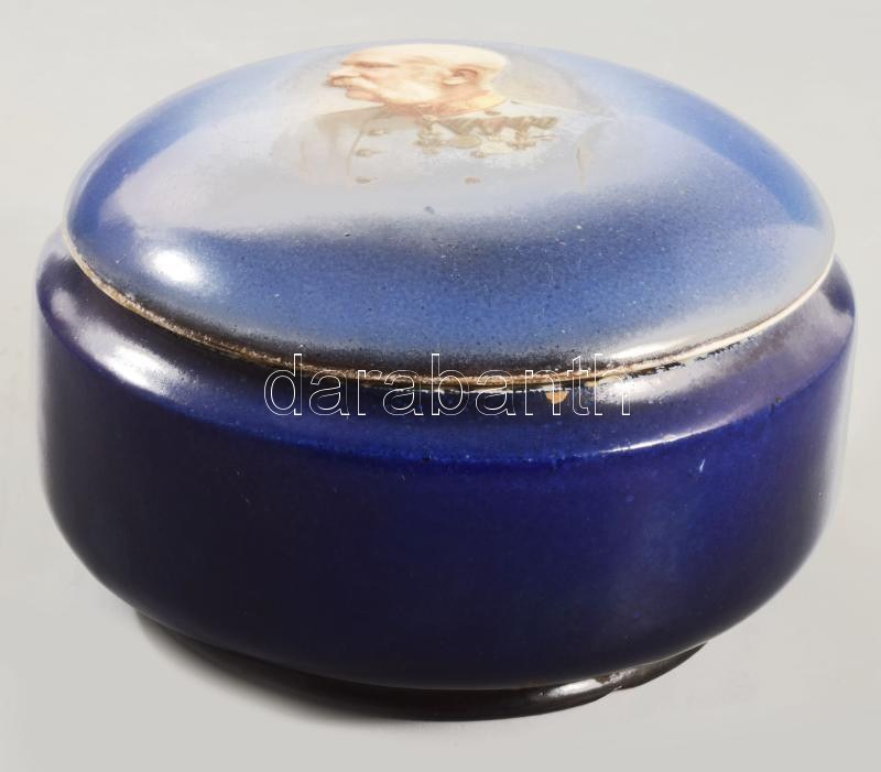 cca 1910 Bonbonier I. Ferenc József osztrák császár, magyar és cseh király portréjának ábrázolásával, alján "Boldog uj évet kíván Grauer Miksa udvari szállító" felirattal, lepattanással, pereménél sérüléssel, d: 11,5 cm, m: 7 cm /// Circa 1910 bonbonni?re, depicting the portrait of Franz Joseph I, Emperor of Austria, King of Hungary and Bohemia, with inscription on the base: ?Happy New Year from Miksa Grauer, purveyor to the court?, with chipping and rim damage, diameter: 11.5 cm, height: 7 cm.