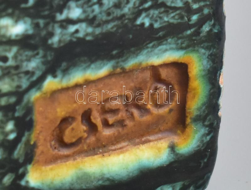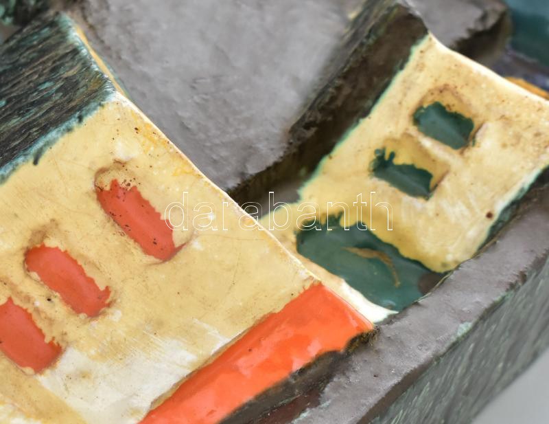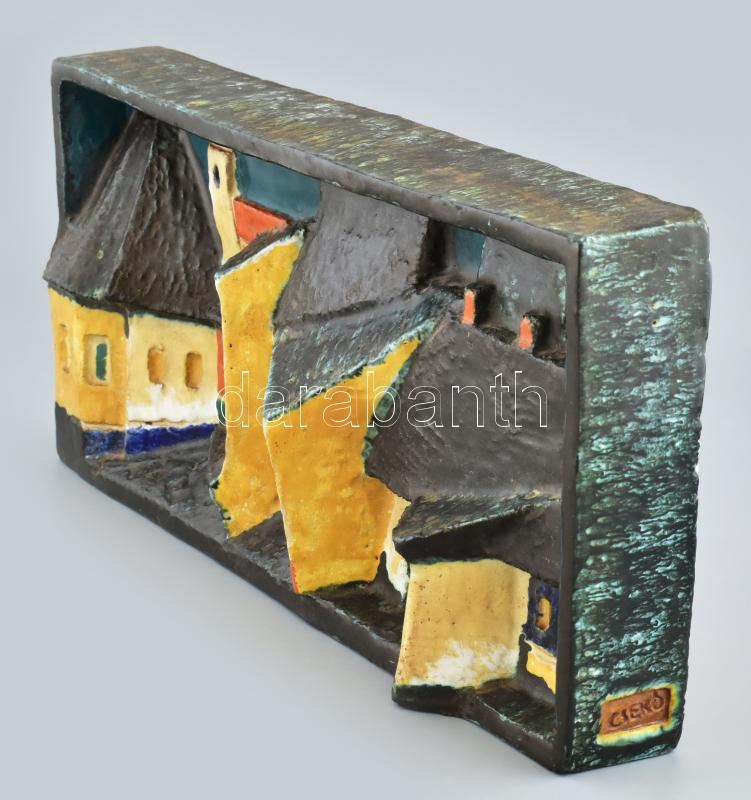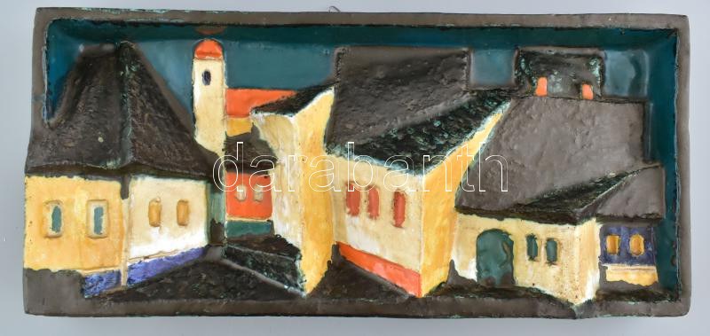 Csekovszky Árpád (1931-1997): Szentendrei városrészlet, kerámia fali dombormű, jelzett, apró kopással, 20x44 cm "Számtalan hazai és külföldi kiállításon vett részt. Művei kerámiagyűjteményekben szerepelnek itthon és külföldön. Csekovszky Árpád a XX. századi magyar képzőművészet meghatározó egyénisége alkotóként és tanárként egyaránt. A Mestert a fazekas módszerű tárgyformálás gyakorlata helyett a kerámia építészeti szemléletű felfogása érdekelte. Meggyőződése volt, hogy az iparművészet a kommunális rendeltetését kiélve teljesítheti feladatát. Monumentális plasztikái, idoljai, lovas-kocsis alkotásai és épületkerámiái jelentésközlő funkcióval rendelkeznek, ezáltal feloldják azt a határt, amely a képzőművészet és az iparművészetet elválasztják. Csekovszky művészete összeköti a modern magyar kerámiaművészet megteremtőinek első generációját (Gorka Géza, Kovács Margit, Gádor István) azzal a több száz ma alkotó keramikusművésszel, akiket részben ő maga tanított az Iparművészeti Egyetemen. Ő volt egyike, azon vezető művészeknek, aki évtizedeken át meghatározó hatással volt a ?harmadik generációs kerámiaművészekre" látásmódjával, formakultúrájával, személyiségének etikájával. "