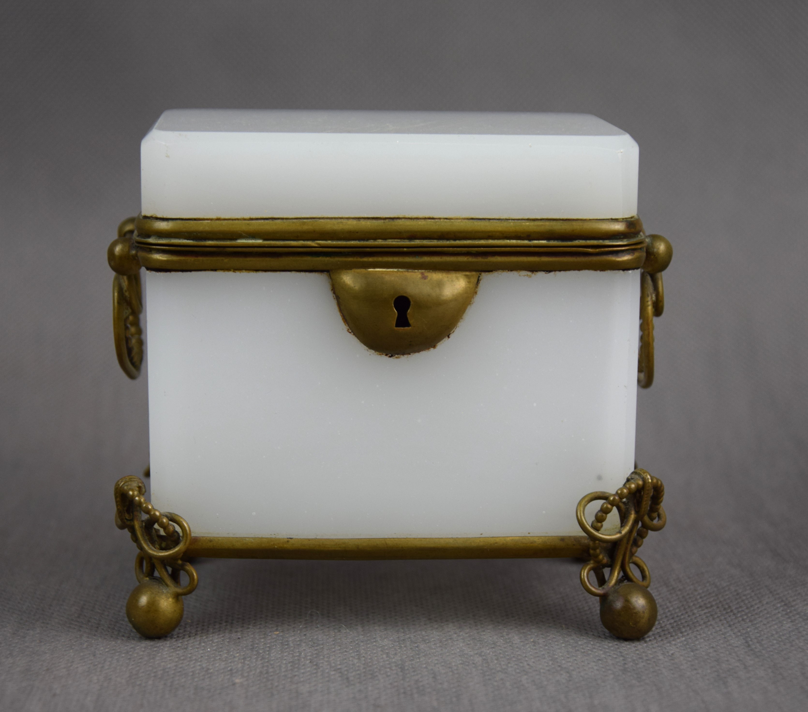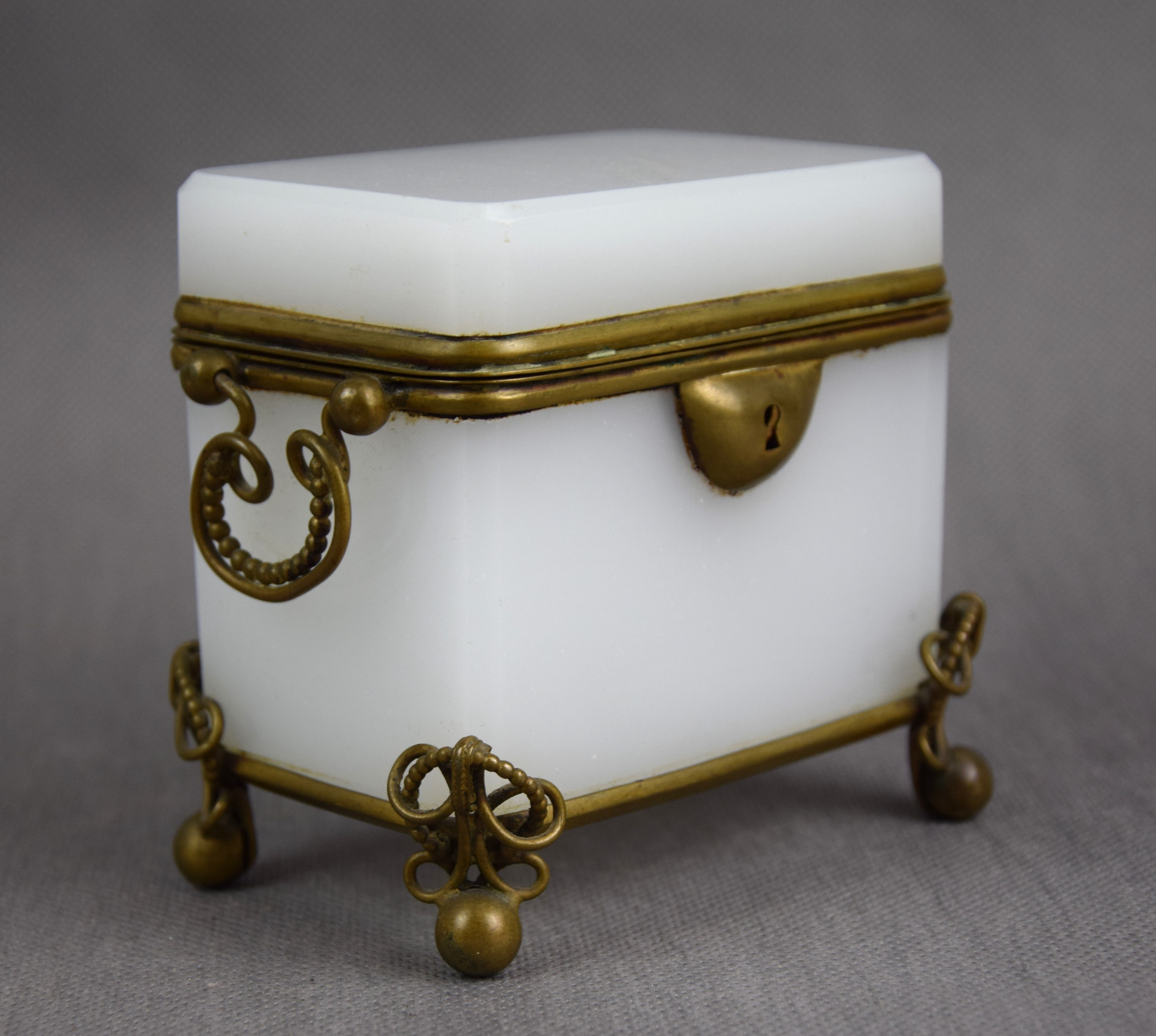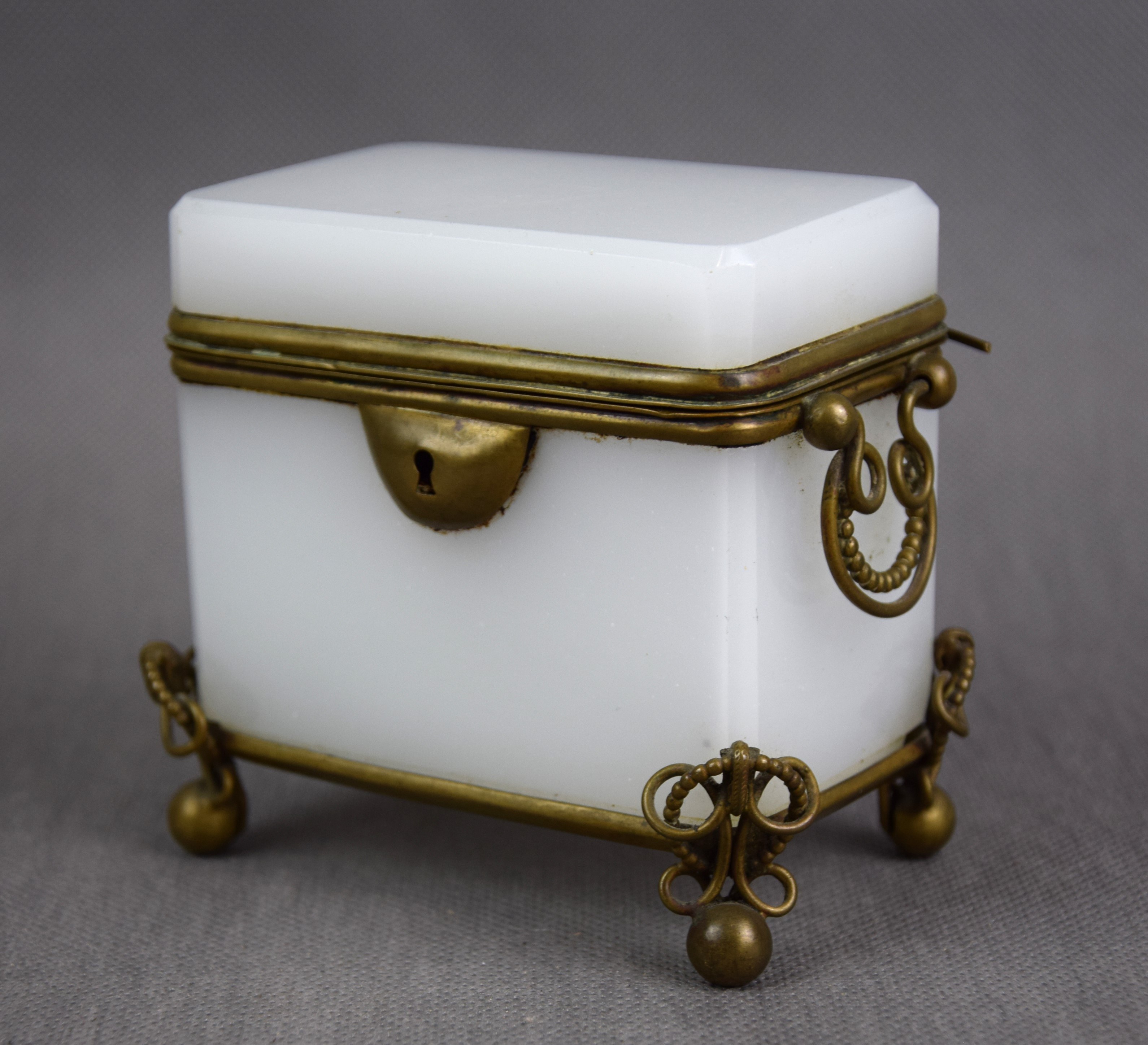 Cukiernica ze szkła mlecznego z mosiężnym okuciem w stylu biedermeierowskim.
