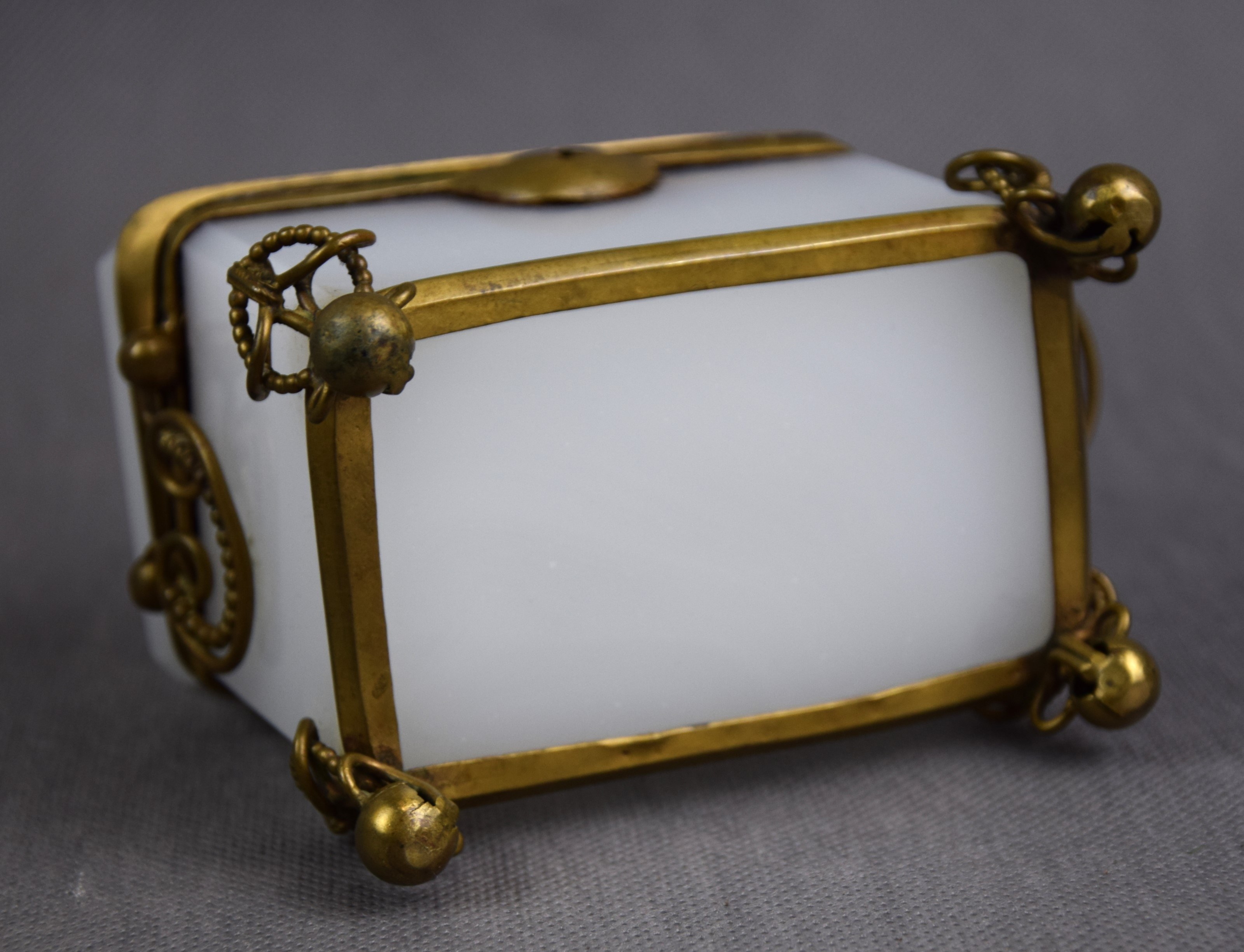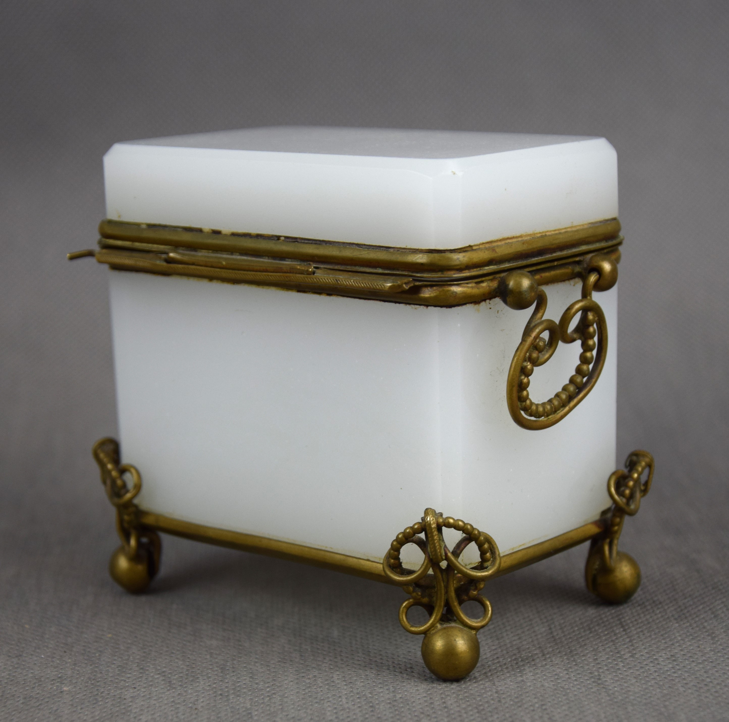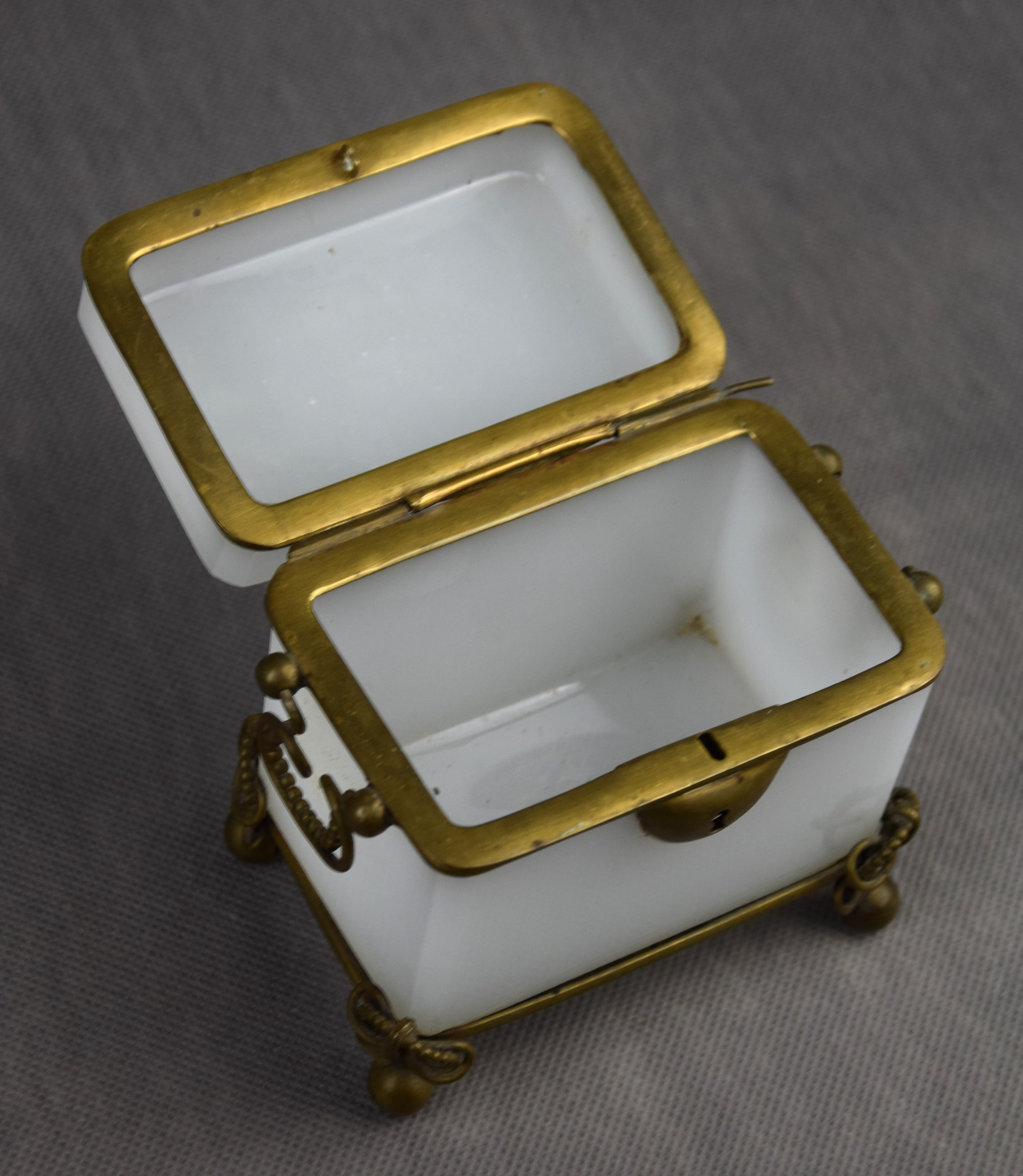 Cukiernica ze szkła mlecznego z mosiężnym okuciem w stylu biedermeierowskim.