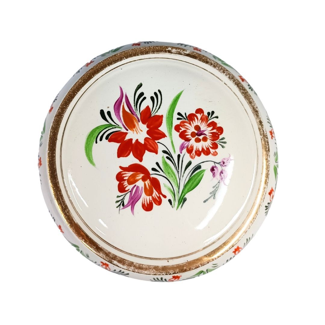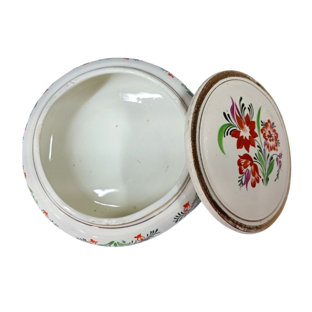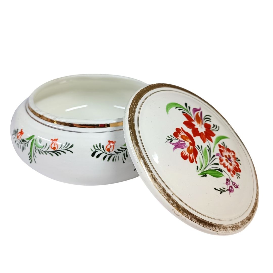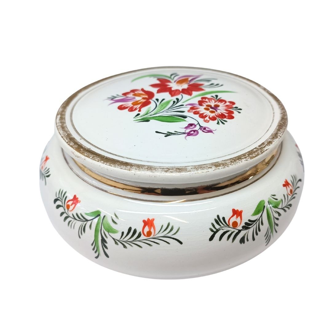 Ozdobna ceramiczna szkatułka z wieczkiem, zdobiona motywem kwiatowym oraz złotymi obwódkami.