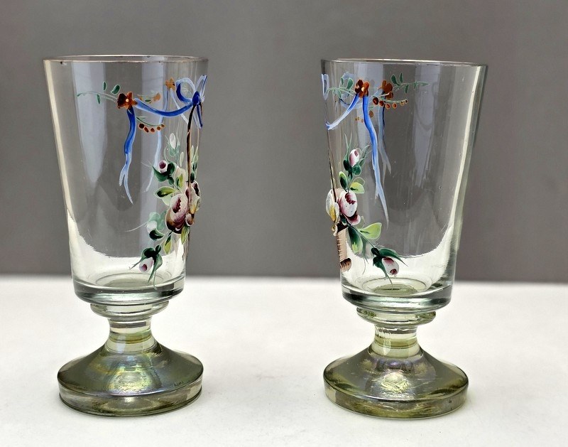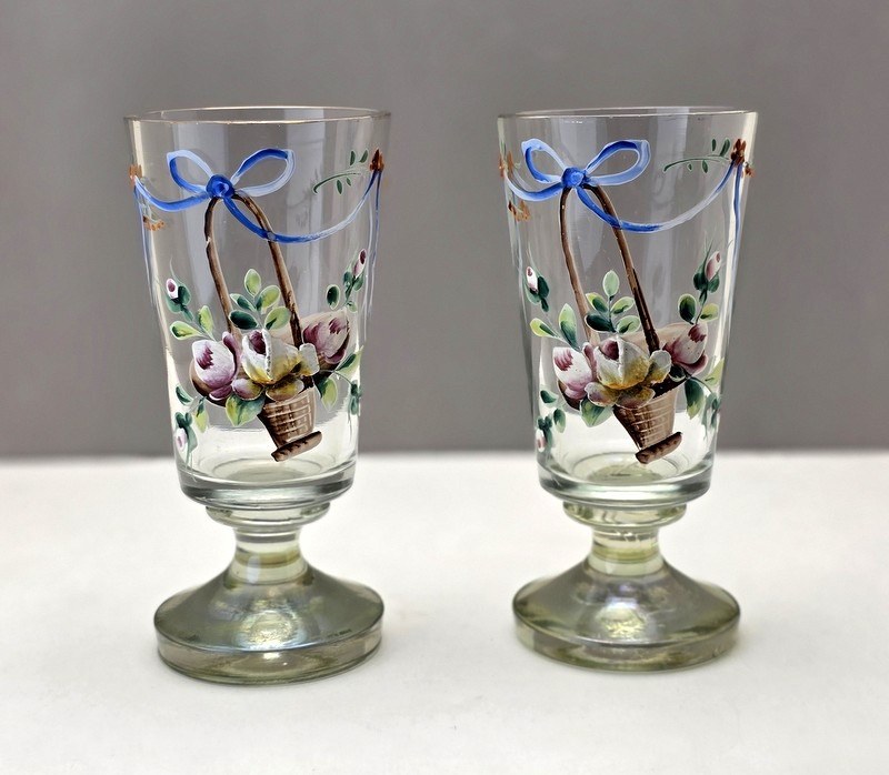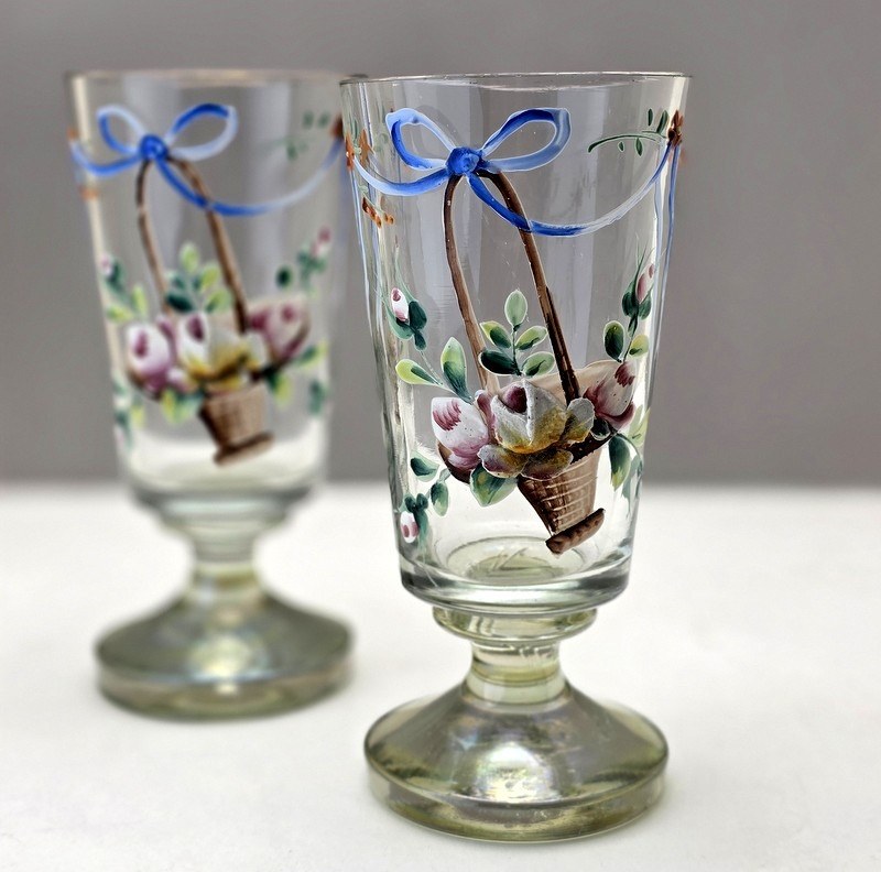Dwie stare szklanice [ grogówki ] z grubego ręcznie malowanego szkła kryształowego - Czechosłowacja lata 50-te