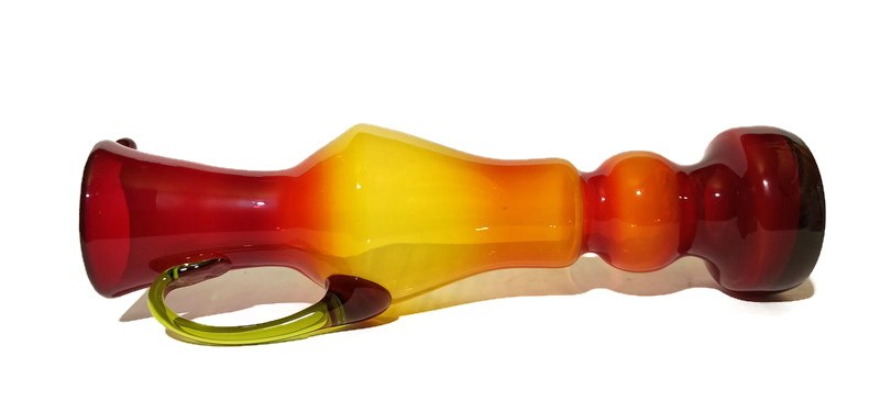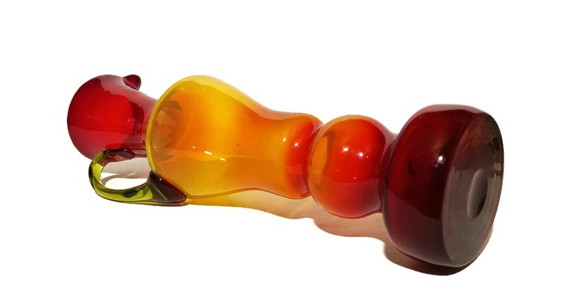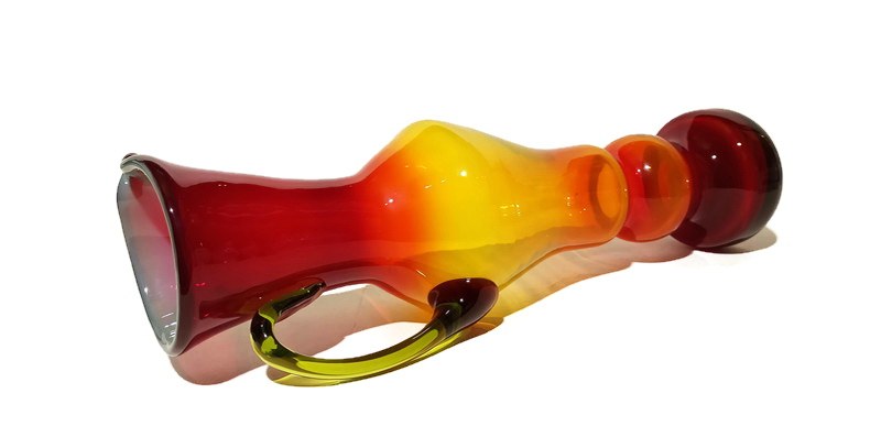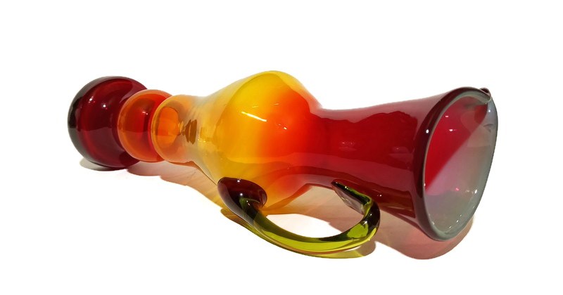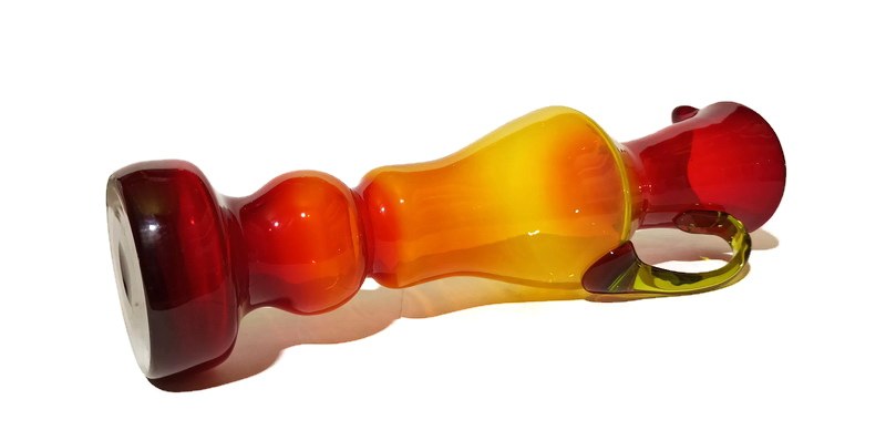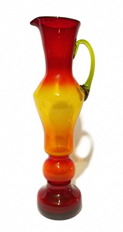 szkło sodowe, barwione w masie, intensywne, tonowane kolory, od ciemnej czerwieni po pomarańcz i żółty, zielone ozdobne ucho, wlew wewnątrz mleczny, wysokość 39cm