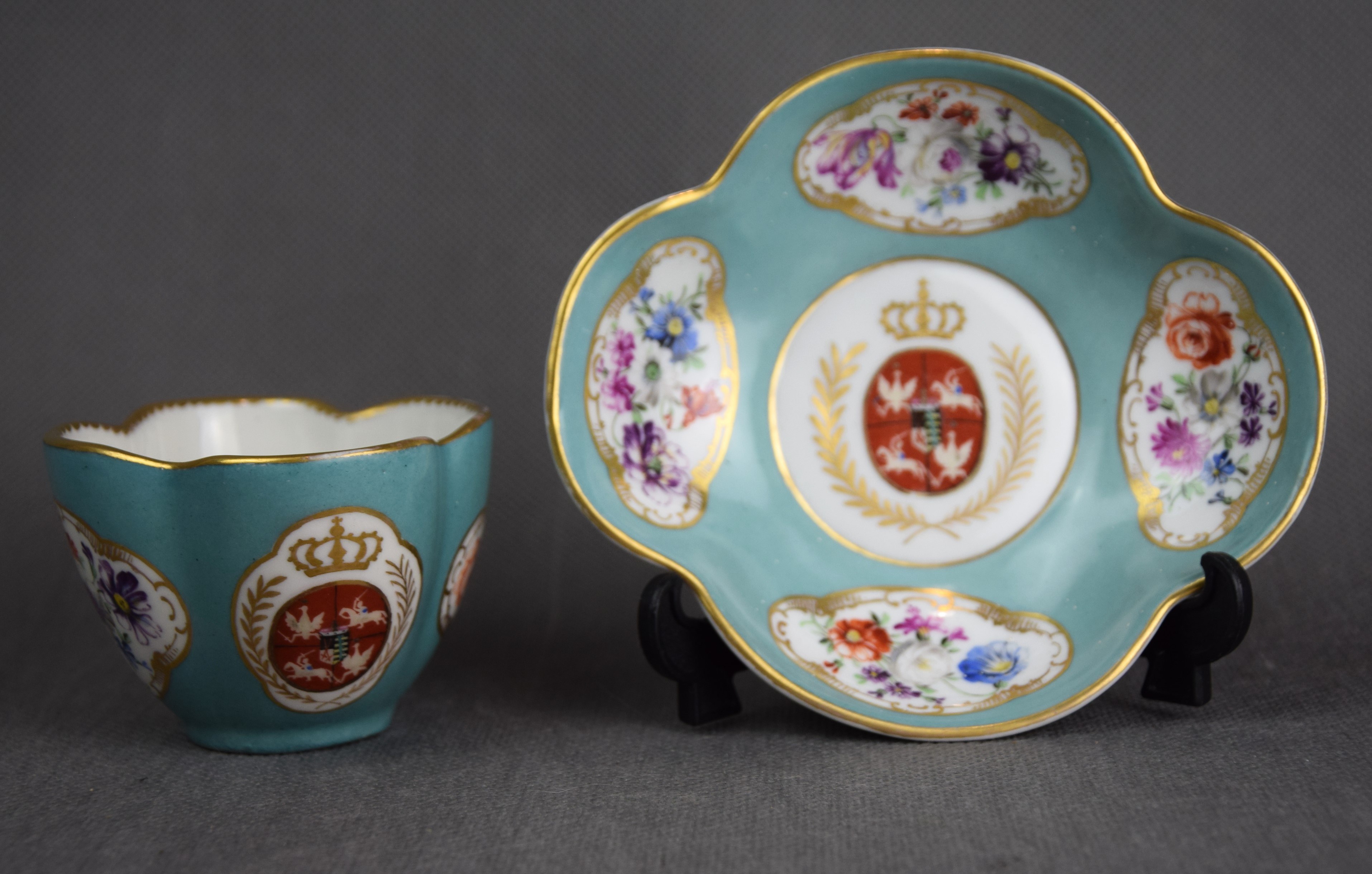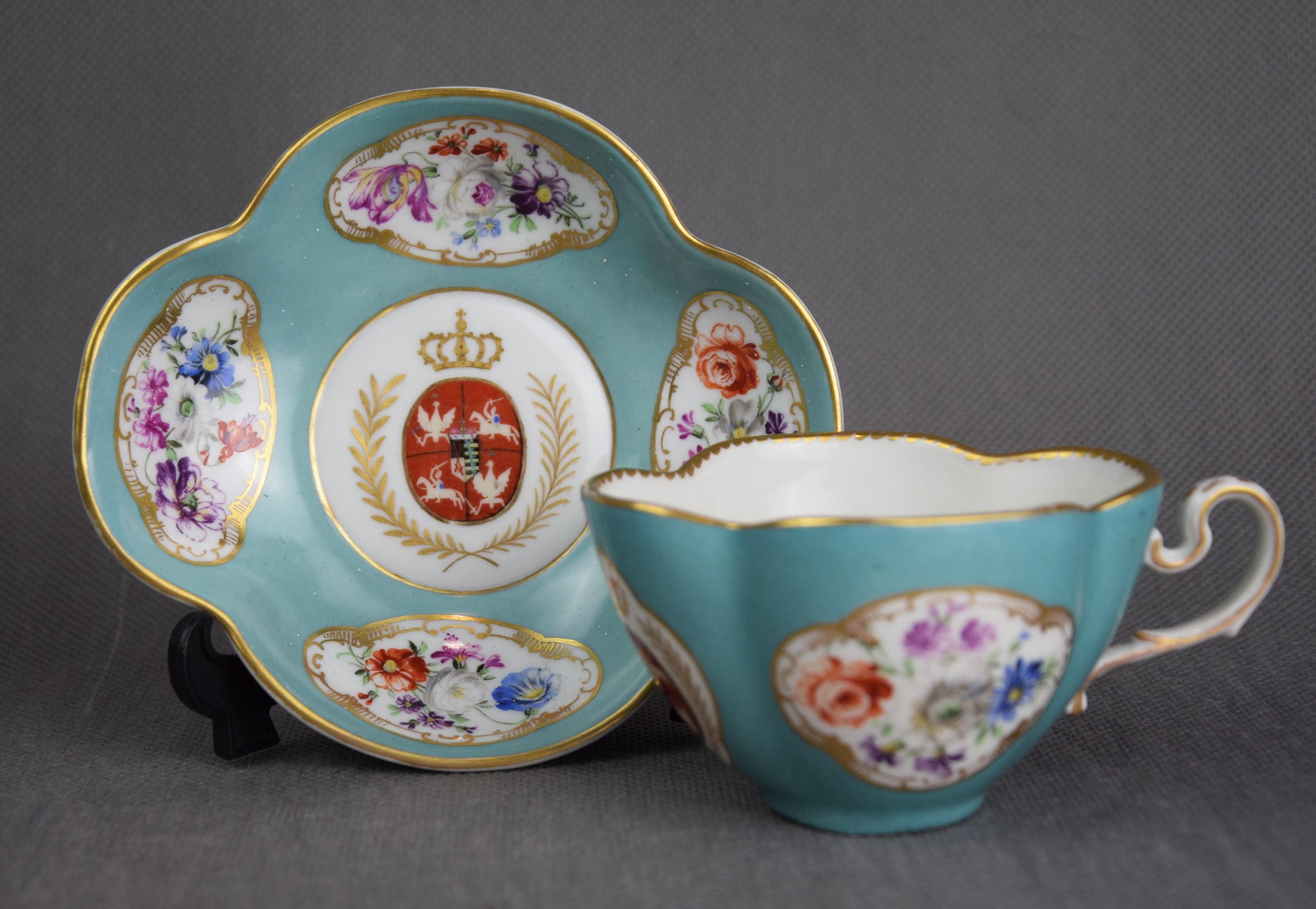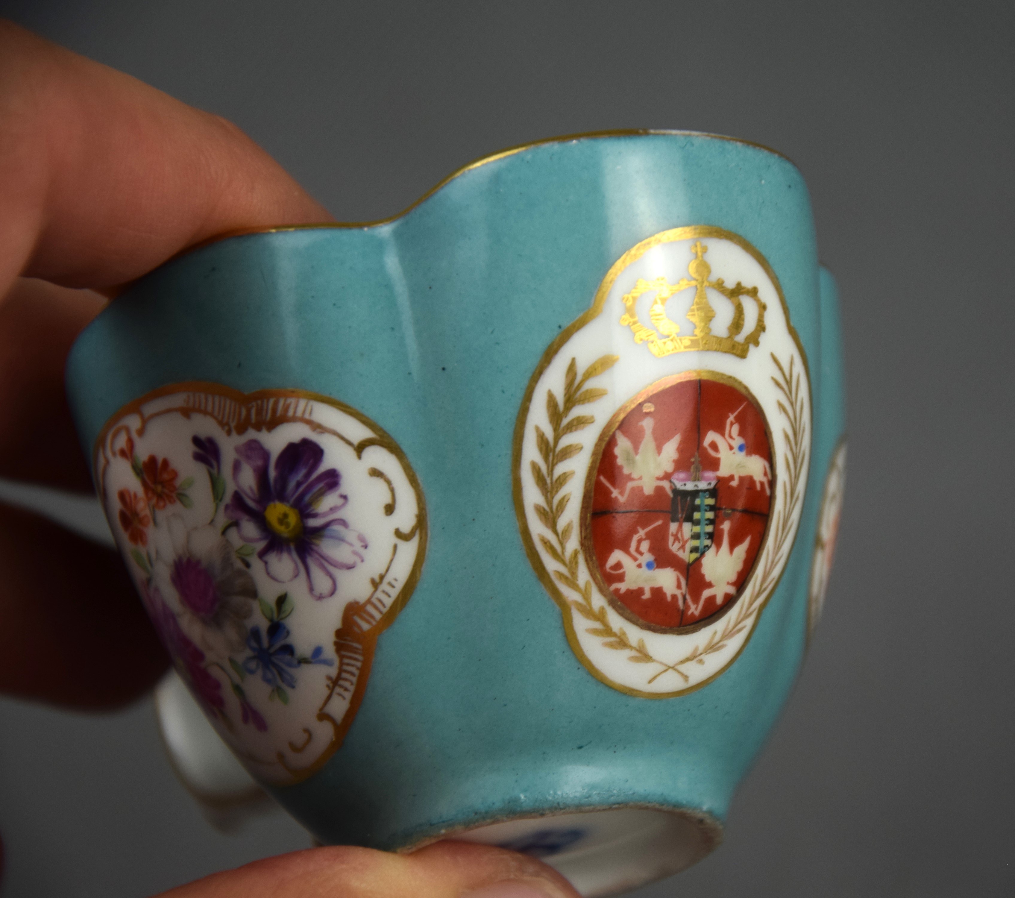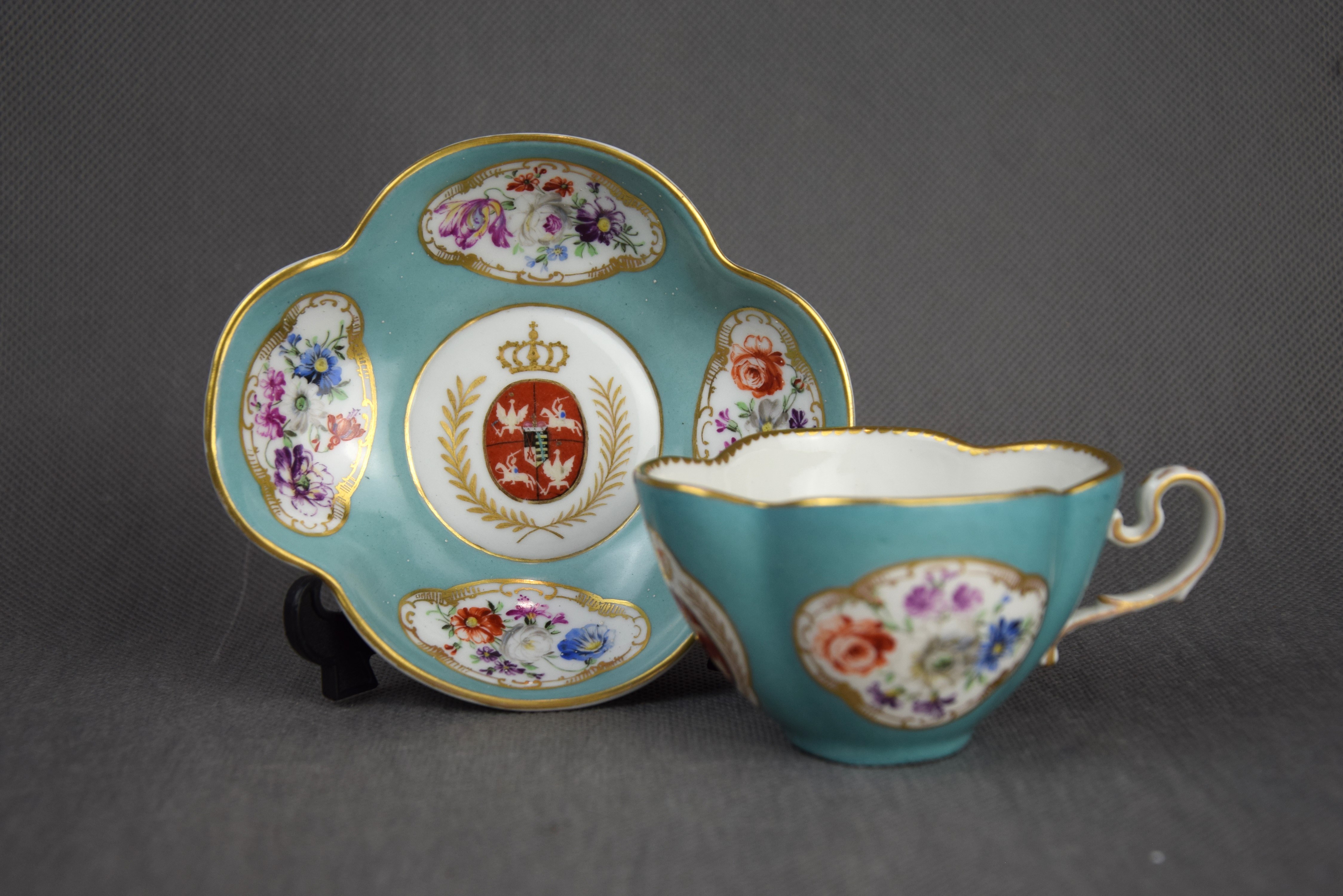 Filiżanka w stylu XVIII wiecznej miśnieńskiej porcelany z malowanym herbem Rzeczpospolitej Obojga Narodów z czasów panowania dynastii saskiej Wettinów.