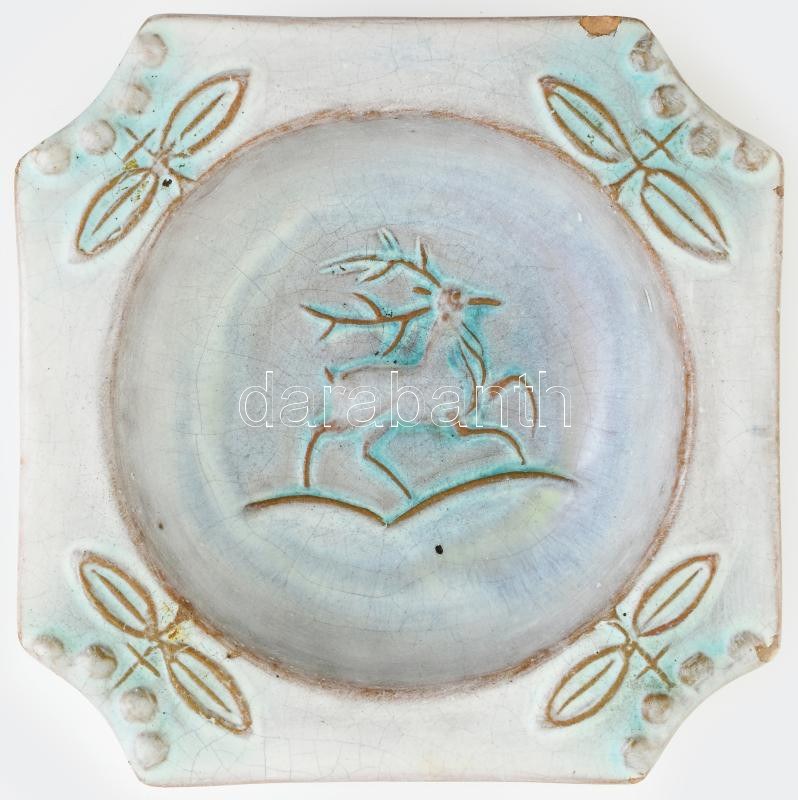 Gorka Géza - Art deco türkizes, szarvasos tálka. Korongozott és kézzel formált cserép. Többrétegű mázzal festett szarvas díszítmény. Alján jelzett: masszába karcolt GNV háromszög és Gorka, 1938-40 körül. Pár helyen kis mázlepattanás és két helyen lepattanás, d: 20 cm