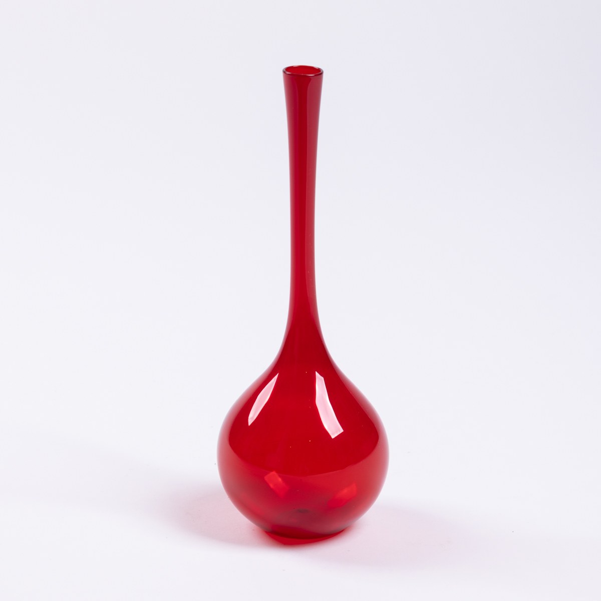 szkło dmuchane, ręcznie formowane, barwione w masie, wys. 26,5 cm, śr. wlewu 2 cm, śr. brzuśca 9 cm