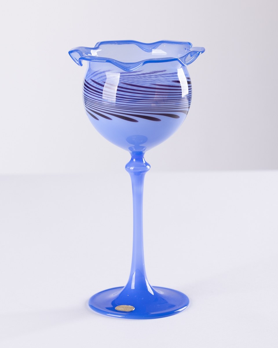 szkło dmuchane, ręcznie formowane, barwione w masie, wys. 21 cm, śr. 11 cm, na stopie oryginalna nalepka: mundgeblasen handgeformt