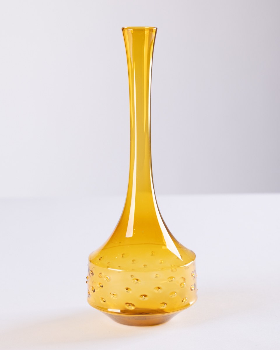 szkło dmuchane, ręcznie formowane, barwione w masie, wys. 25 cm, śr. wlewu 4 cm, sr. brzuśca 9,5 cm
