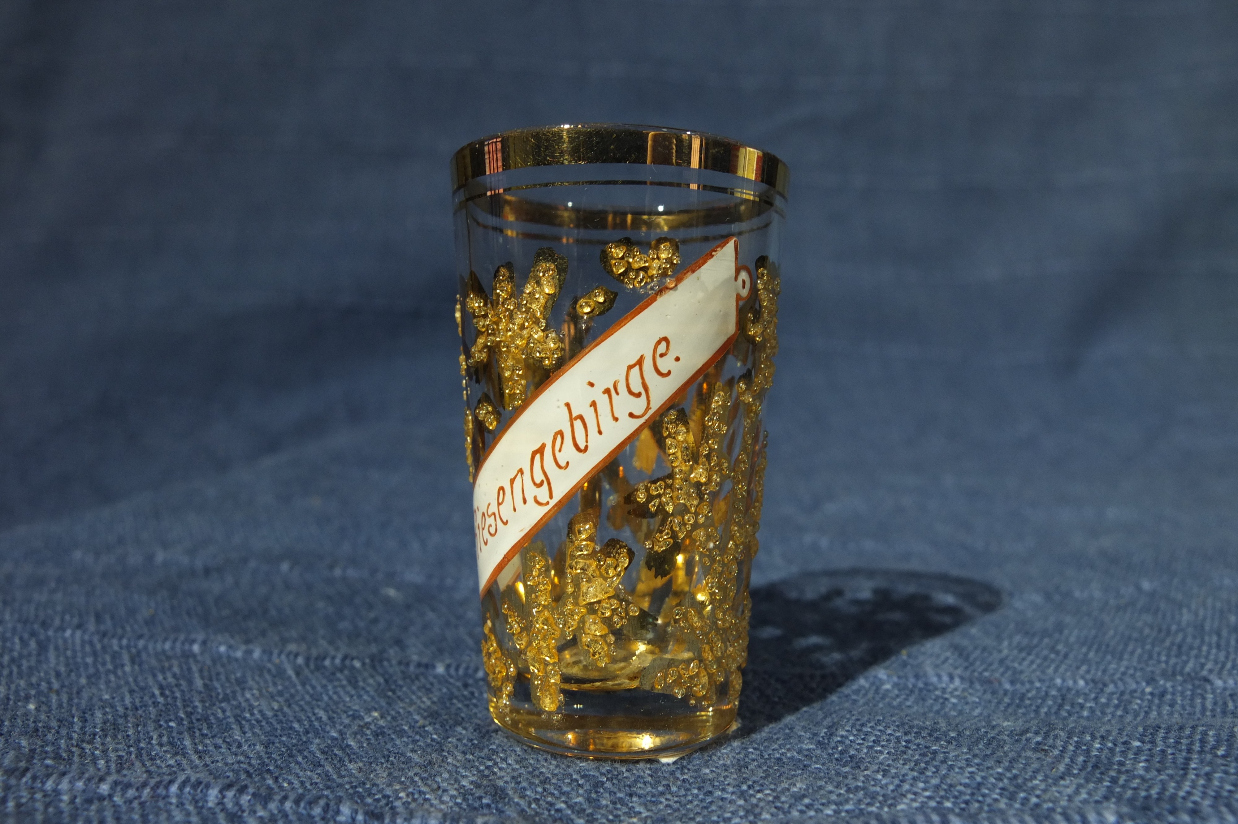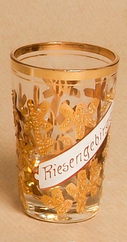 JELENIA GÓRA; kieliszek, szkło, emalia, ręcznie malowany, stylizowane gałązki świerku, napis: Riesengebirge; przed 1900 r., st. bdb., wys.: ok. 60 mm, średnica u góry: ok. 30 mm.