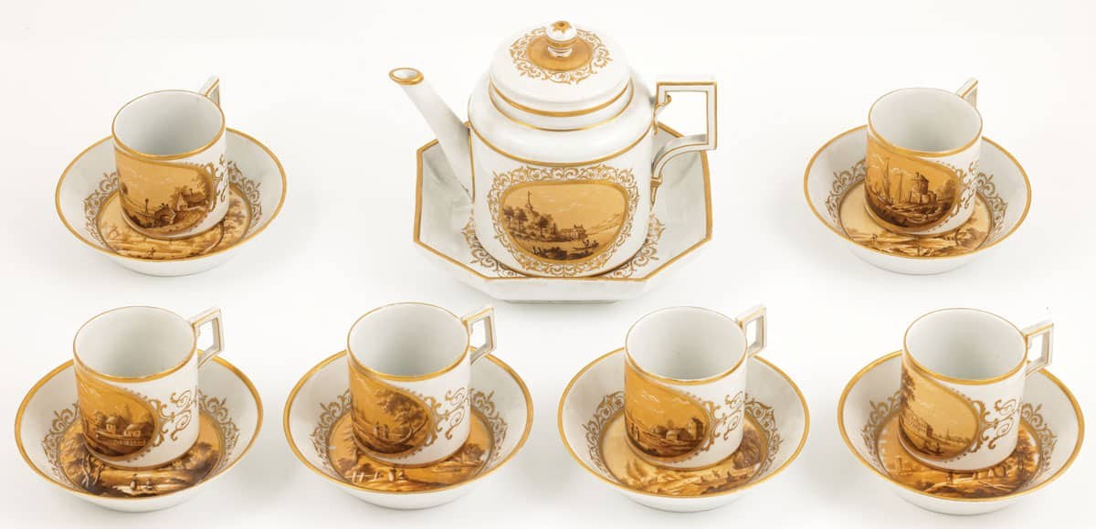 Porcelana, farby naszkliwne (rezerwy z pejzażami), złocenia, w składzie dzbanek 13,5 cm, paterka (16 x 16 cm), 6 filiżanek (6 cm), ze spodkami (śr. 12,5 cm)