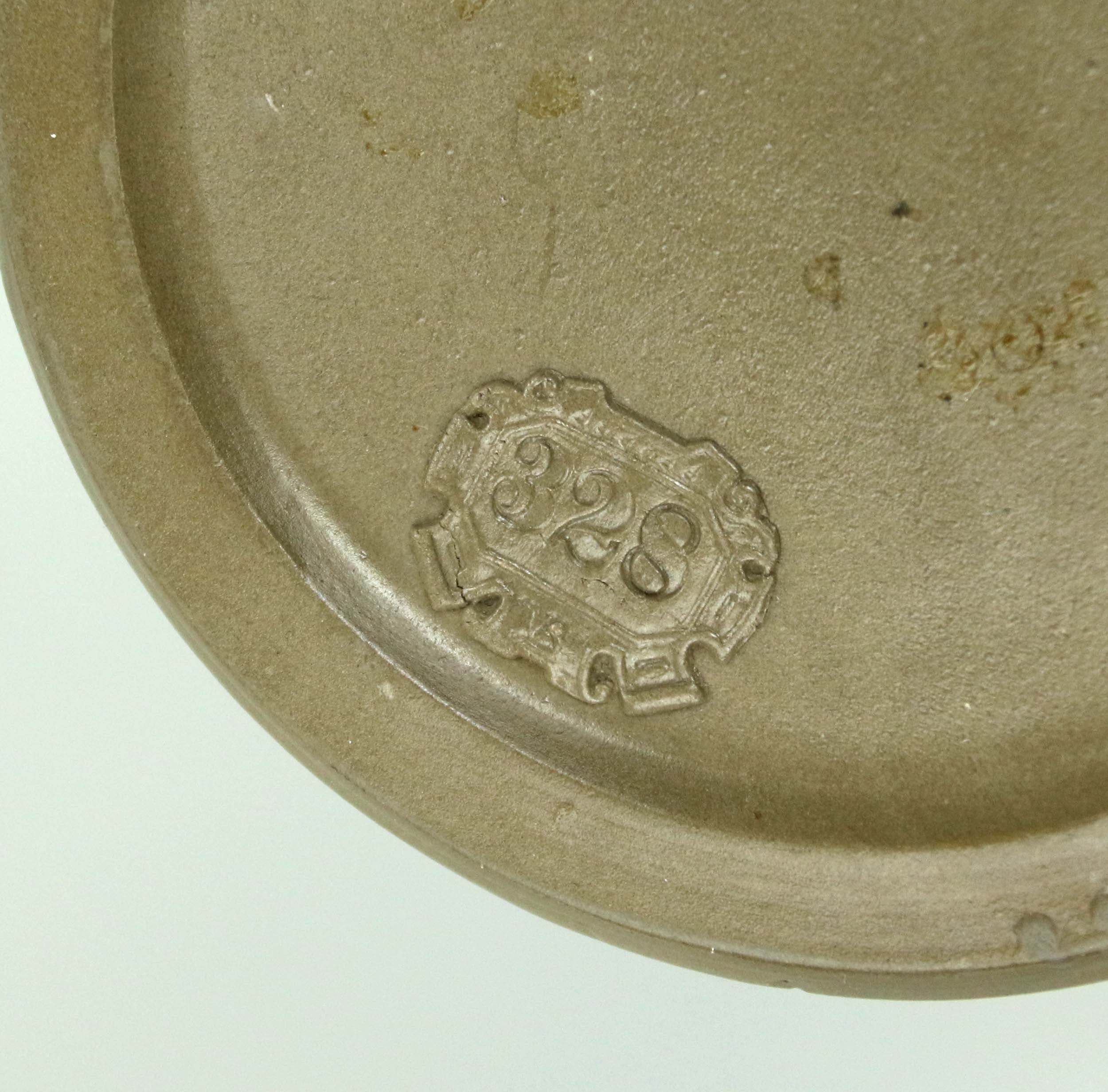 Sygnowany wyciskiem: w kartuszu centralnie numer 328 - sygnatura używana przez wytwórnię Mettlach w l. 1852-1873