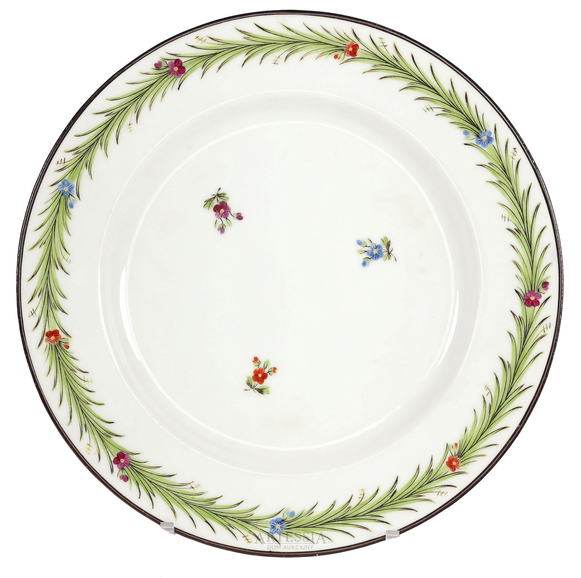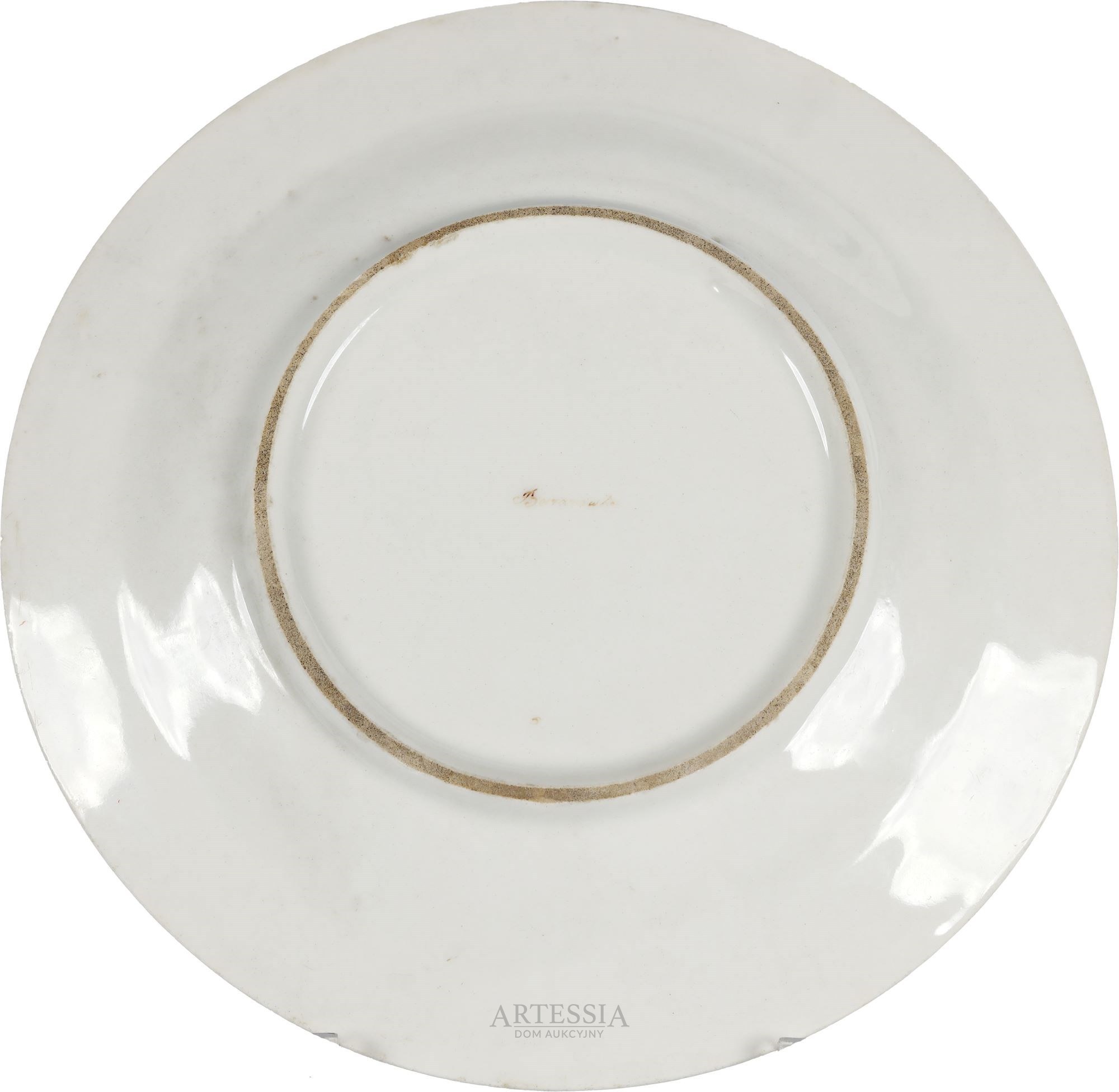porcelana, farby naszkliwne; średnica 24,5 cm, wys. 3,2 cm; na spodzie oznaczenie wytwórni, kolorem czerwonym naszkliwnie: Baranówka (napis lekko przetarty) i poniżej 5