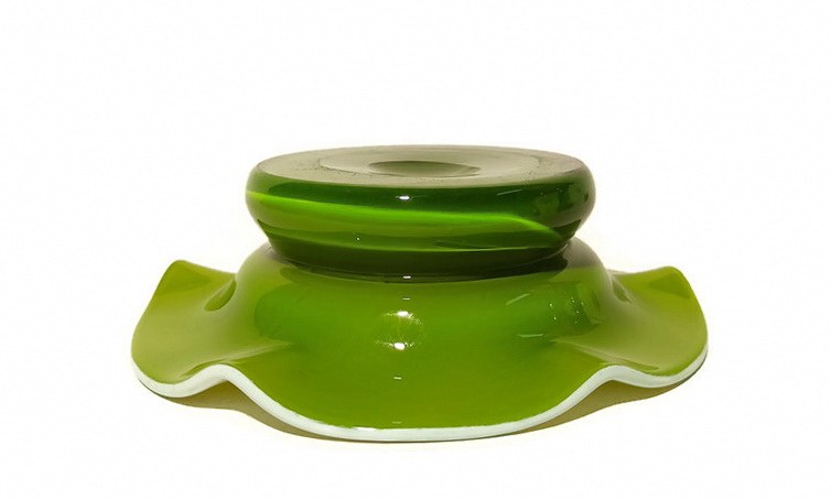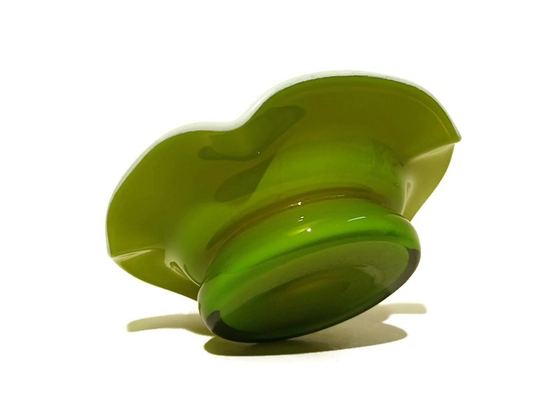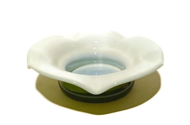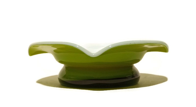 szkło sodowe, barwione w masie, kolor zielony, obrzeże mleczne, wewnątrz biały, mleczny kolor, wysokość 5cm, średnica 16cm,