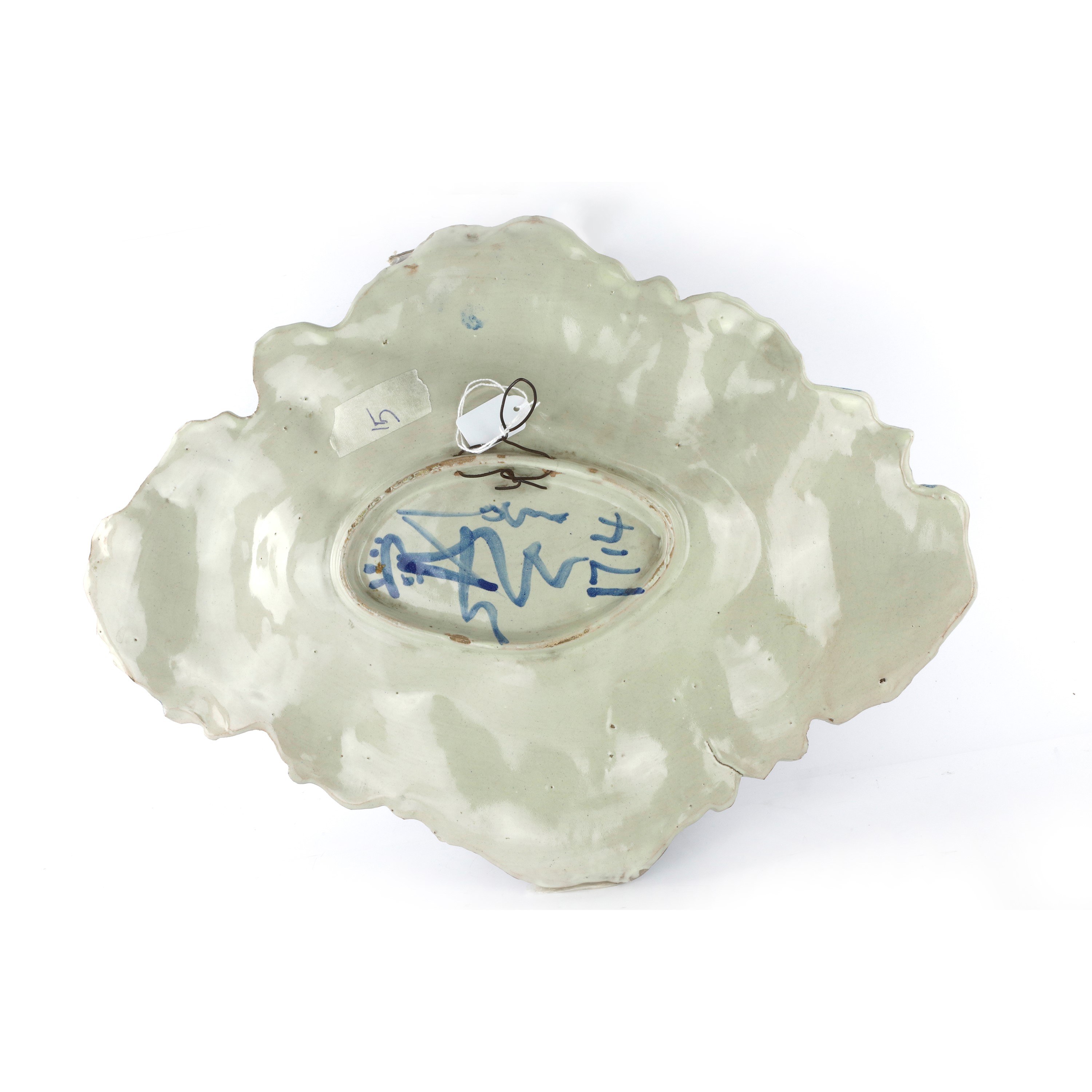 with a curved line at the edge,with landscape scene decoration with tower and house in the center of the background, white and blue. Ligurian production