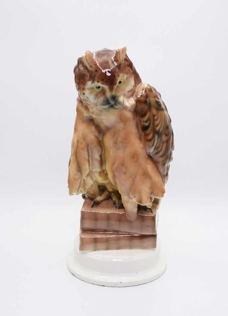 dwa odpryski szkliwa na krawędziach górnej książki, dwa niewielkie ubytki szkliwa na głowie sowy i końcu skrzydła;