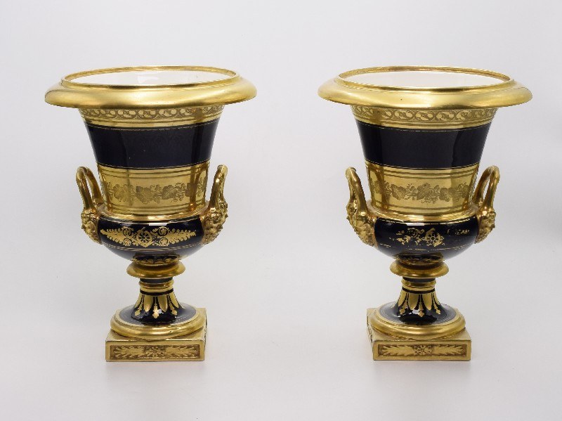 stan zachowania: niewielkie przetarcia złoceń na plincie, stopie, brzuścu; drobny odprysk na spodzie wylewu jednego wazonu.