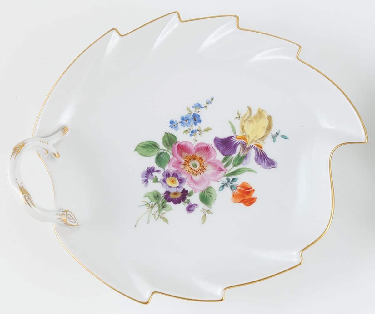 Talerz dekorowany bukietem drezdeńskim z kwiatem dzikiej róży oraz irysem i groszkiem.