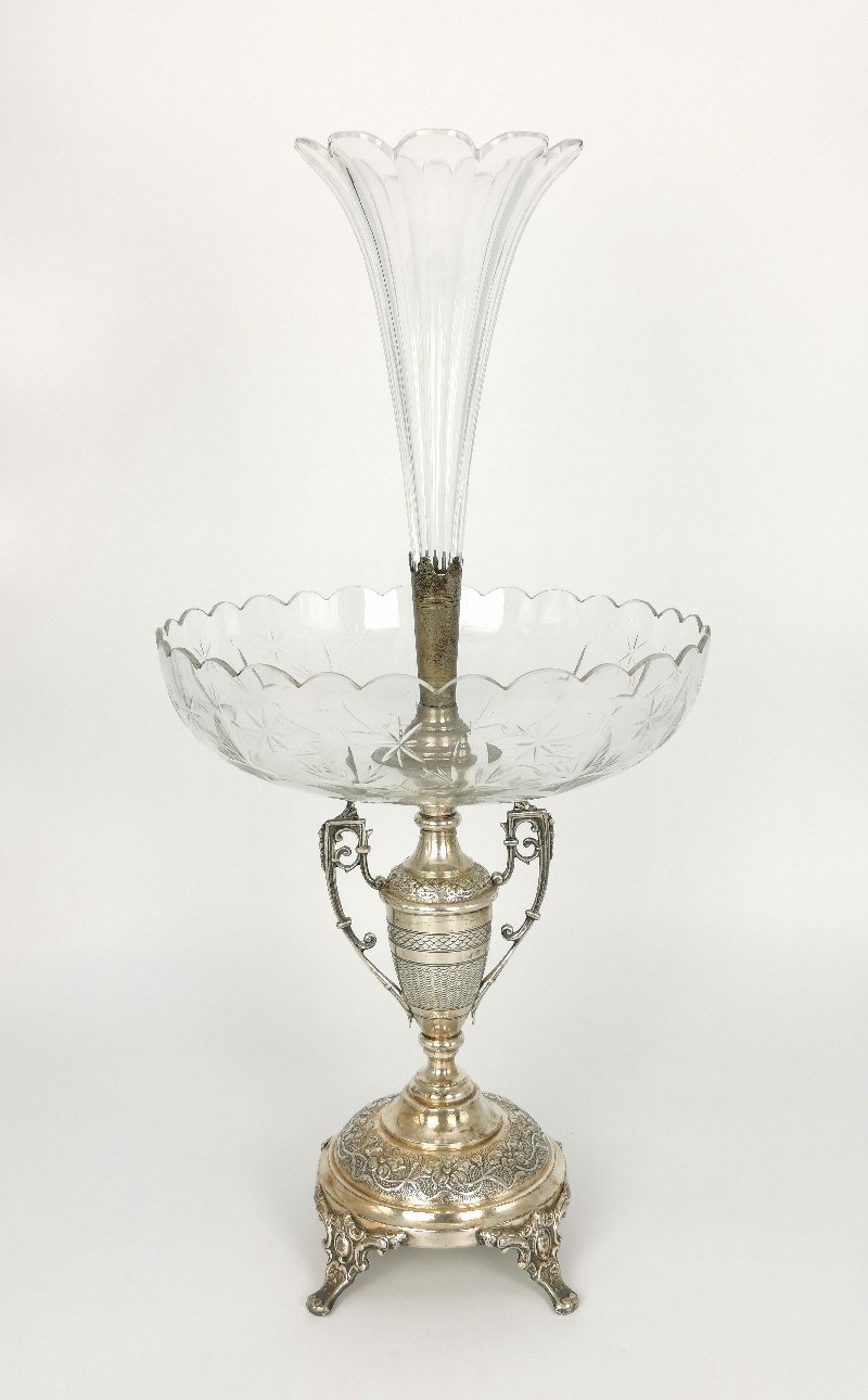 Na czterech lekko wygiętych nóżkach i kolistej, profilowanej stopie dekorowanej pasem ornamentu z wici roślinno-kwiatowej na tle groszkowanym, powyżej trzon w kształcie smukłej wazy z dwoma łamanymi, ażurowymi uchwytami, zdobionej pasami dekoracji roślinnej, rybiej łuski i falistej, na nim osadzona szklana, głęboka patera z falistym brzegiem, szlifowana w stylizowane motywy roślinne i geometryczne, zwieńczona szklanym fletem w formie kielicha kwiatowego.