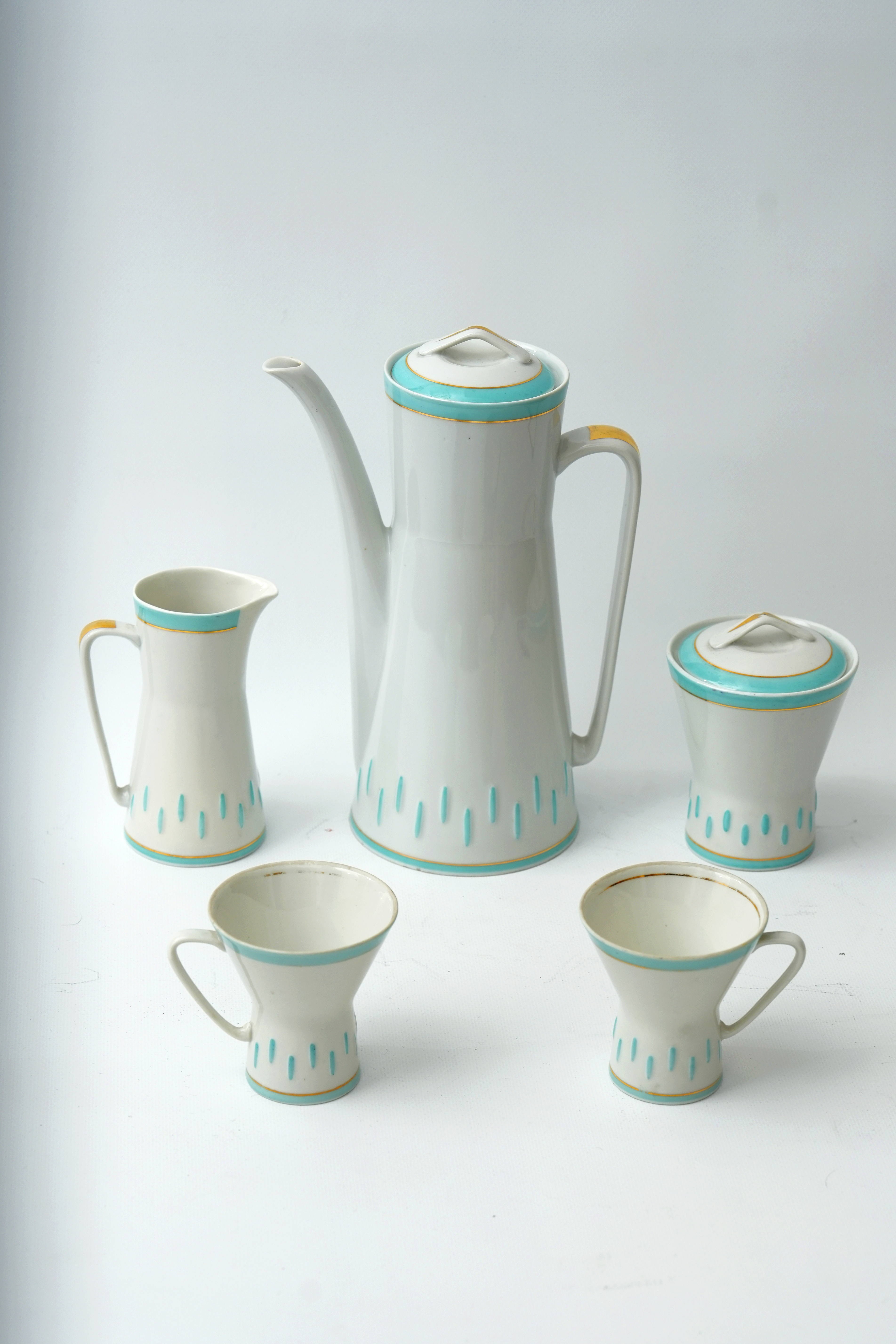 Zestaw składa się z: Dzbanka z przykrywką, cukiernicy z przykrywką, mlecznika, dwóch filiżanek i dwóch spodków.