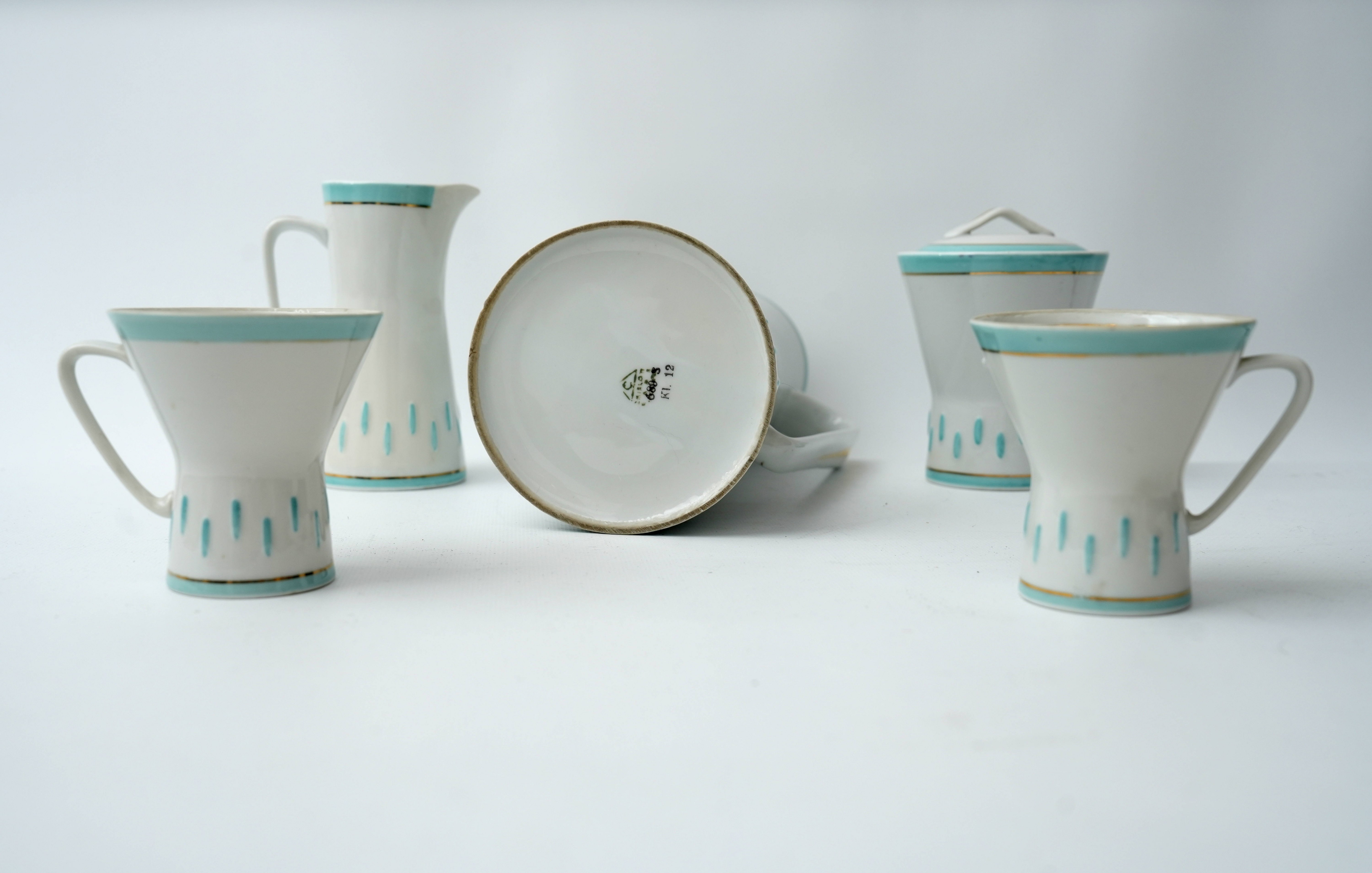 Stan bardzo dobry -, minimalne odpryski na krawędziach podstawy dzbanka, wytarcia malatury na krawędziach filiżanek.