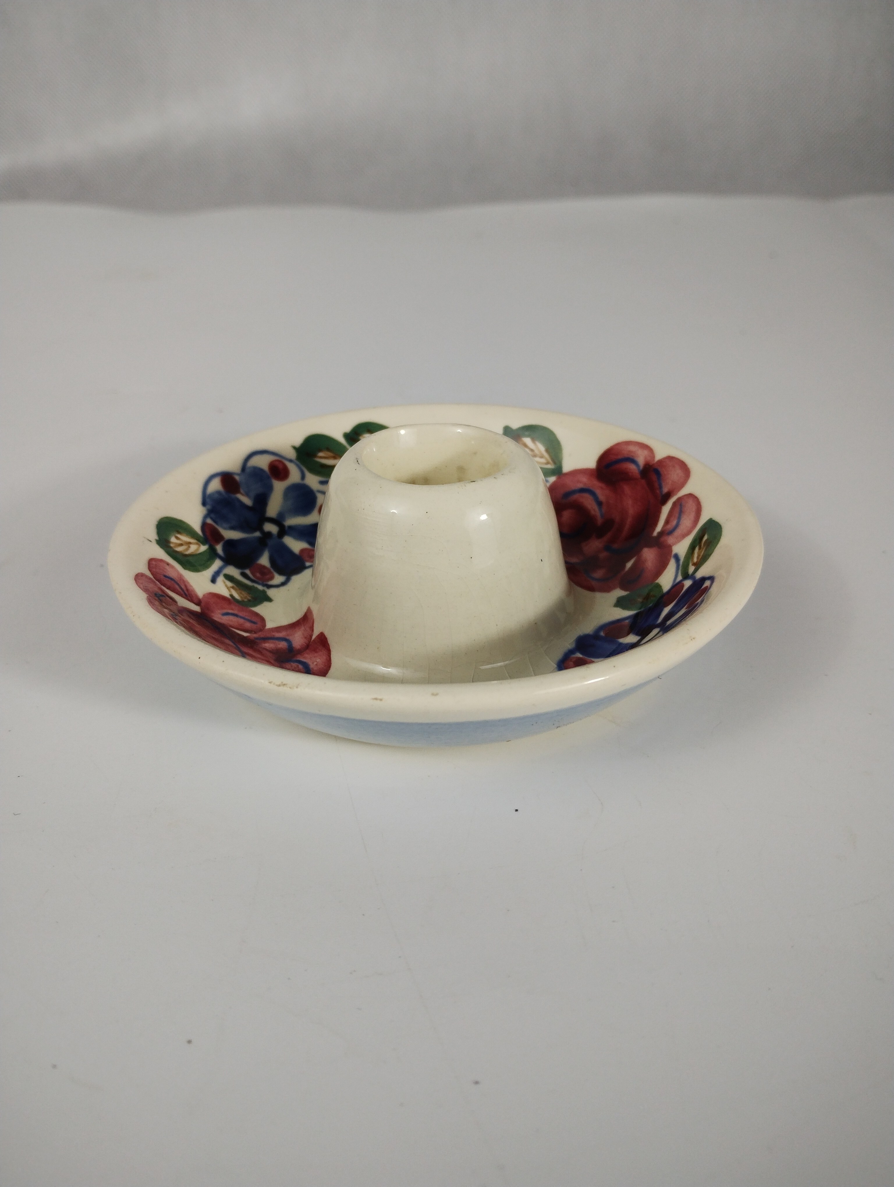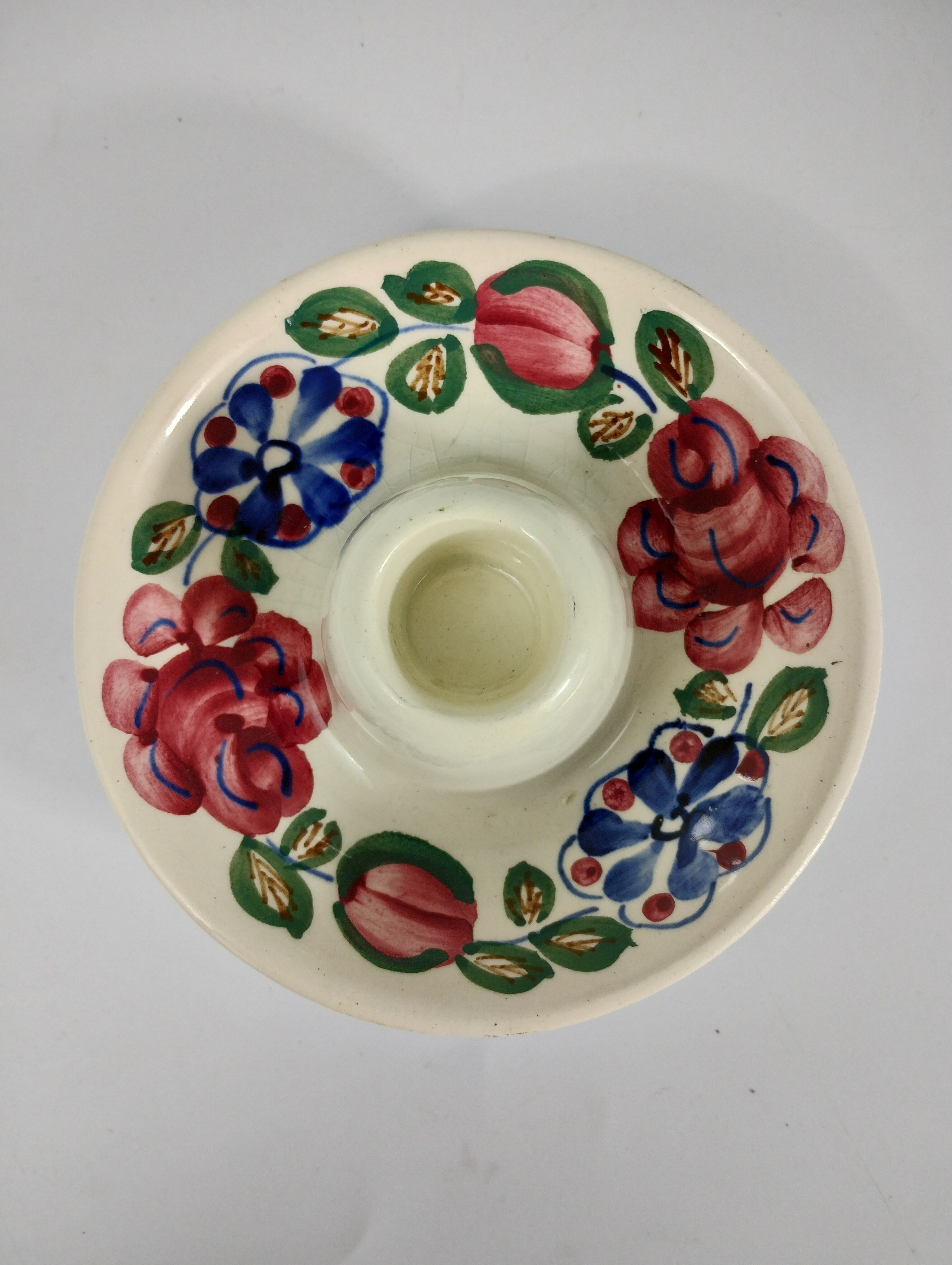 Świecznik produkcji Zakładu Fajansu we Włocławku. dekorowany ręcznie malowanymi kwiatowymi wzorami. Stan zachowania widoczny na zdjęciach.