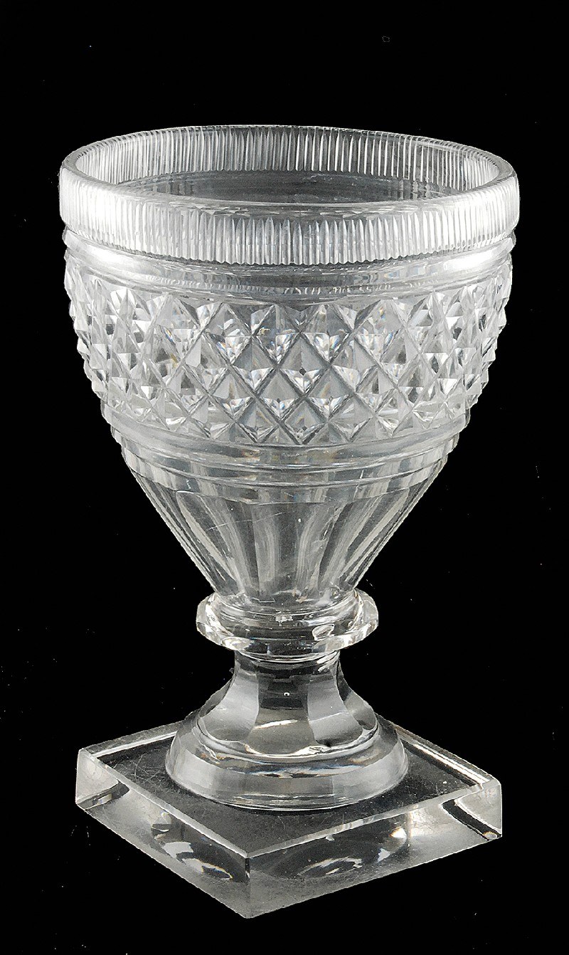 Podstawa w formie kwadratowej plinty. Stopa kolista, wysklepiona, fasetowana; niewielki trzon z nodusem w formie wielobocznego fasetowanego pierścienia. Czasza dołem stożkowata, rozchylona, wieloboczna; część górna oddzielona poziomymi profilami - walcowata, dekorowana szlifem brylantowym w ukośna kratkę. Wokół wylewu - pas zdobiony gęstymi, pionowymi rowkami.