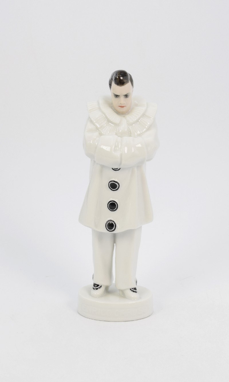 Na niskim, owalnym bębnowym cokole z reliefowym napisem ENRICO CARUSO od frontu - stojący ciemnowłosy mężczyzna w stroju Pierrota (długa bluza i szerokie spodnie z czarnymi guzami, podwójna kryza), z lekko opuszczoną głową i dłońmi skrytymi w rękawach założonych rąk.