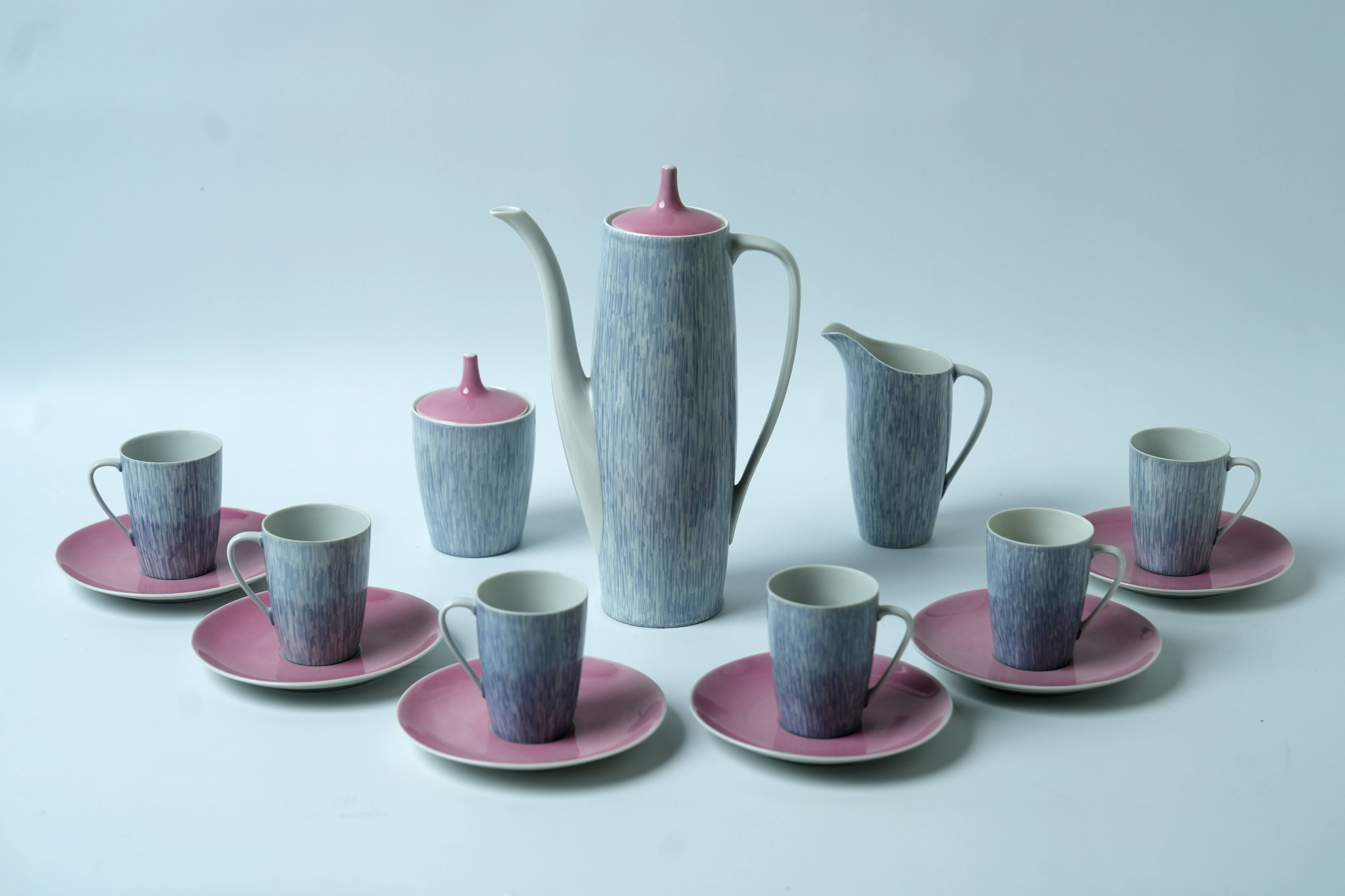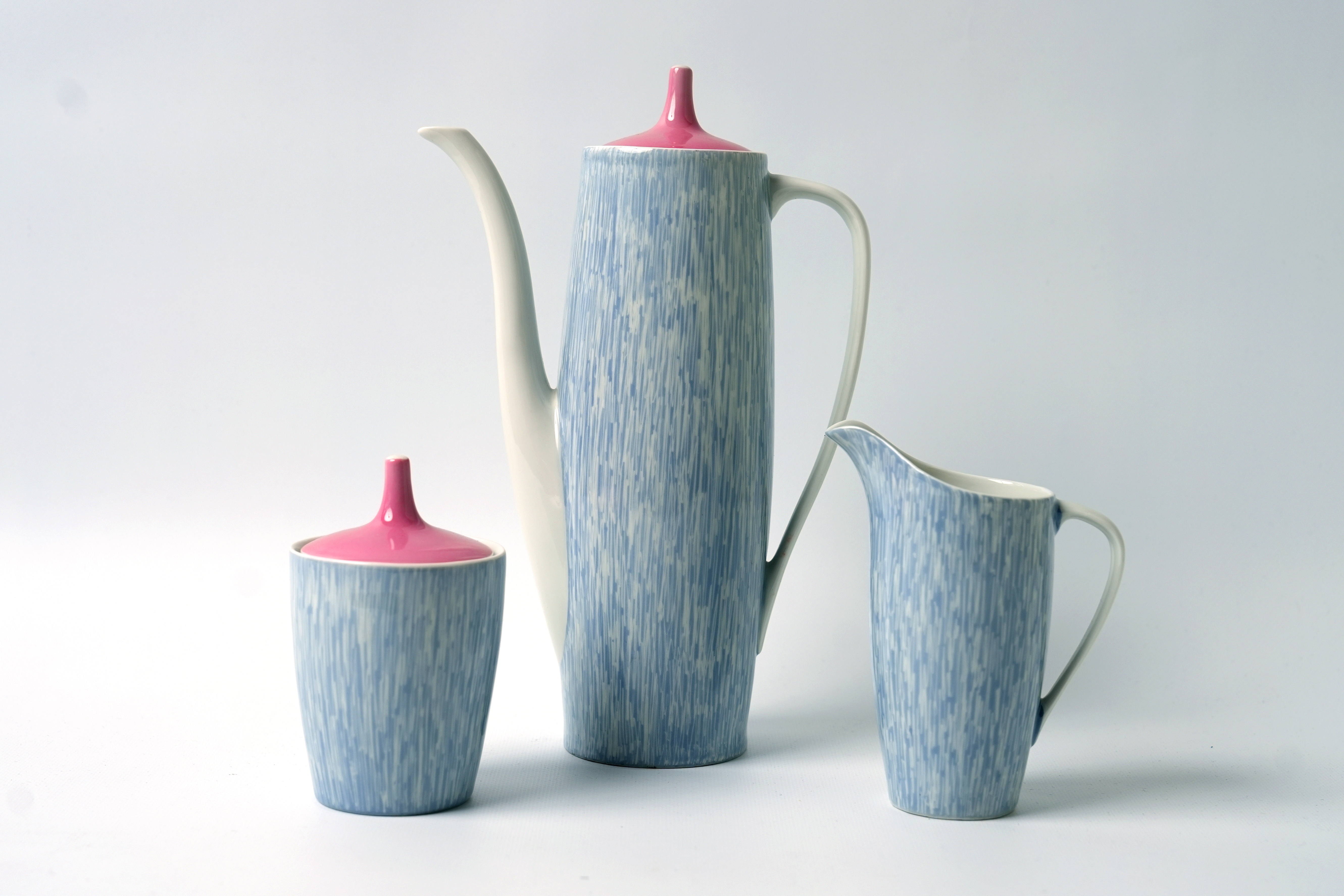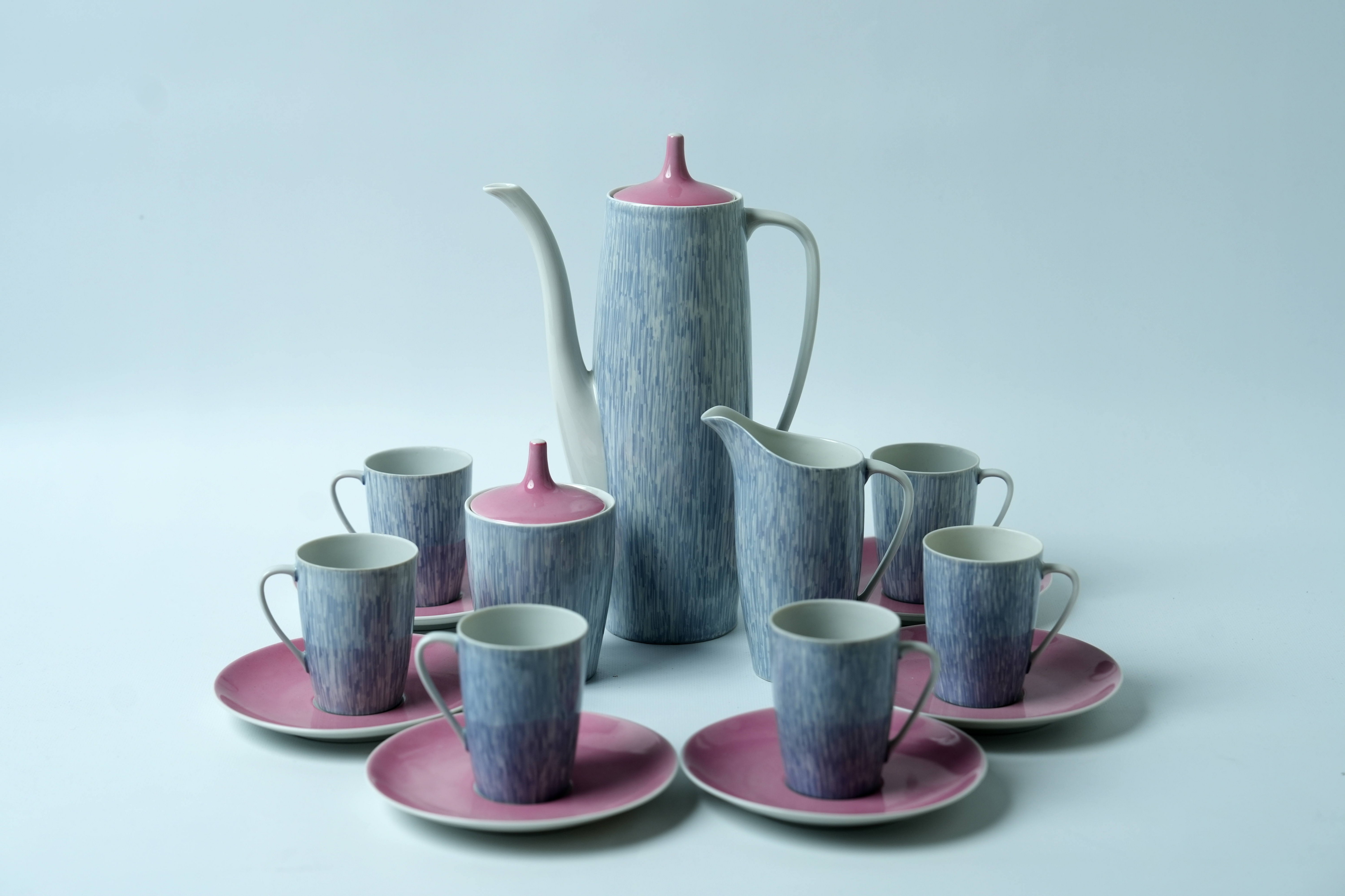 Zestaw składa się z: dzbanka z przykrywką, cukiernicy z przykrywką, mlecznika, 6 filiżanek, 6 spodków.
