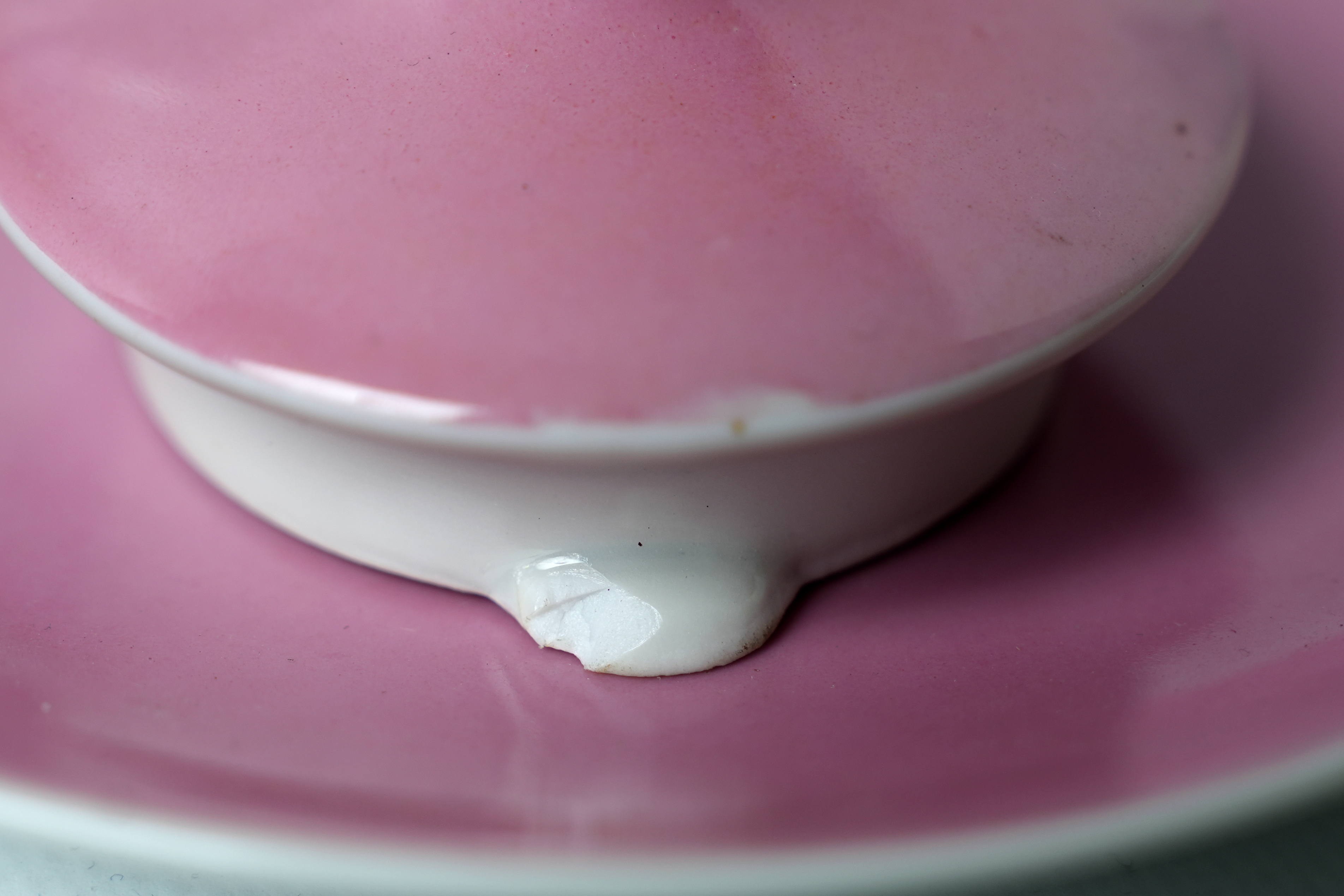 Stan: jeden spodek posiada niewielkie, promieniste pęknięcie, dziubek od przykrywki dzbanka posiada wyszczerbienie. Poza tym stan bardzo dobry.